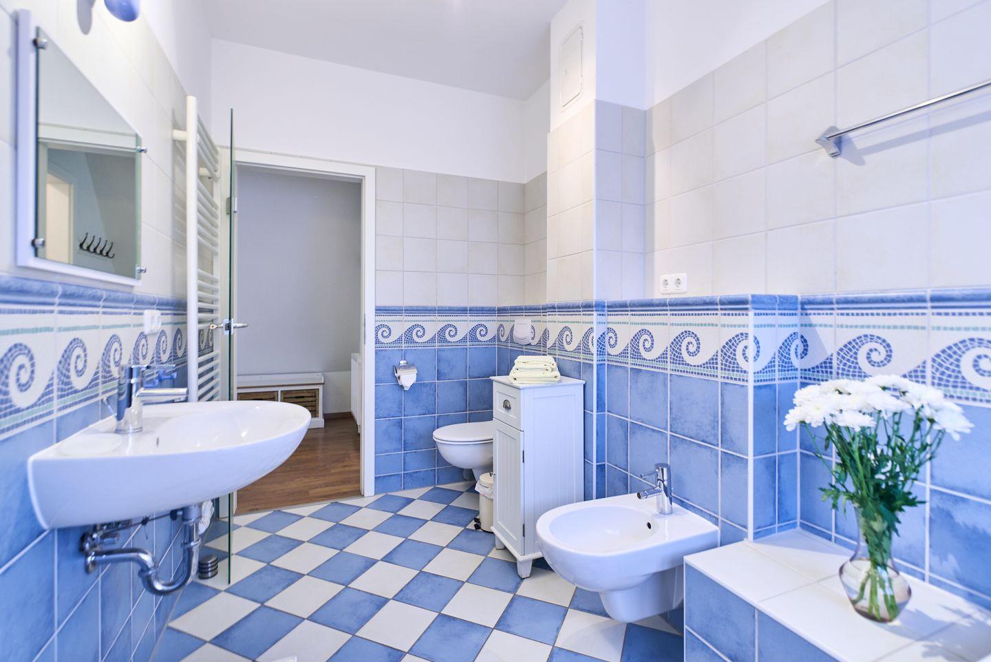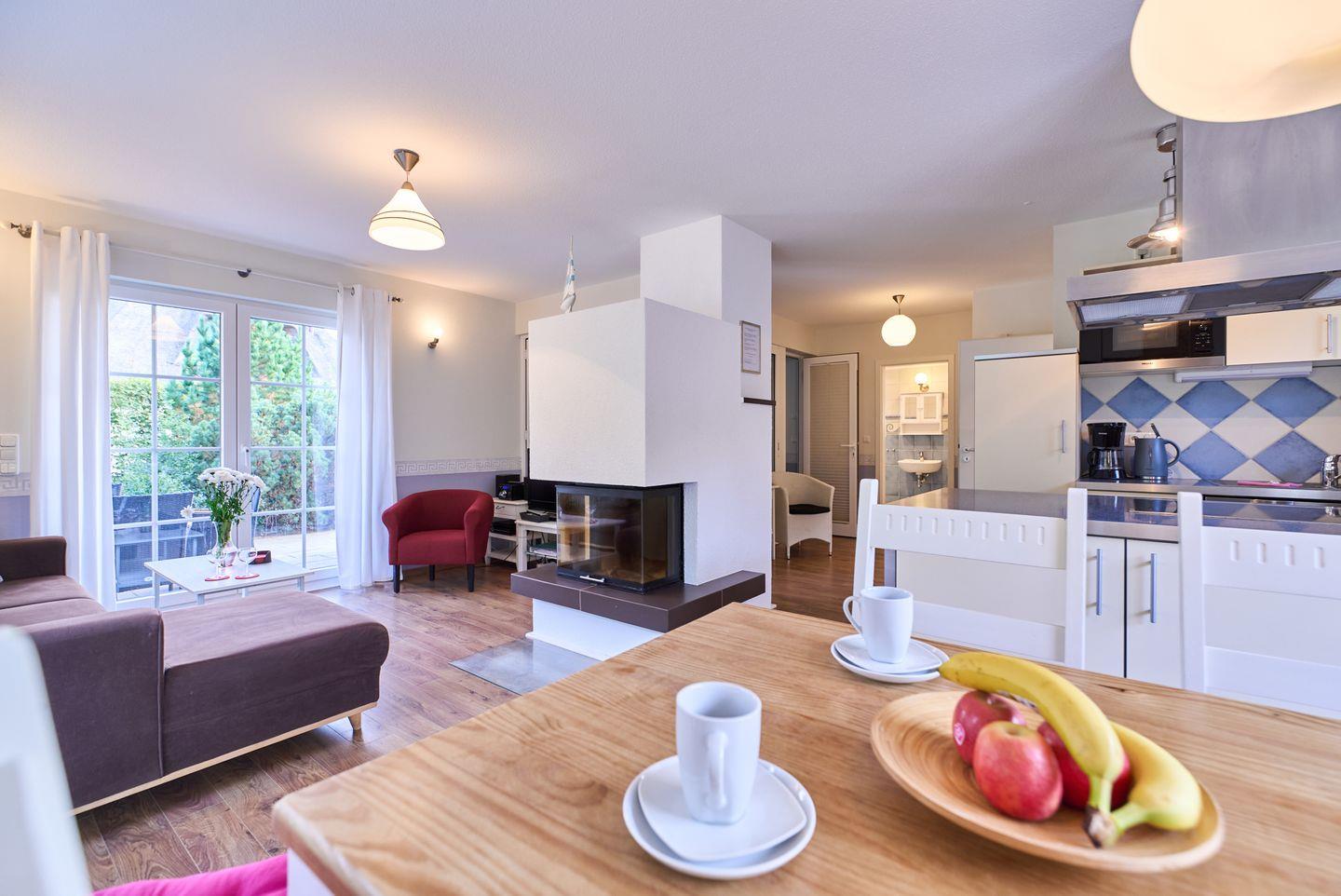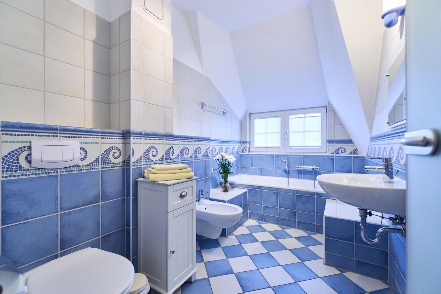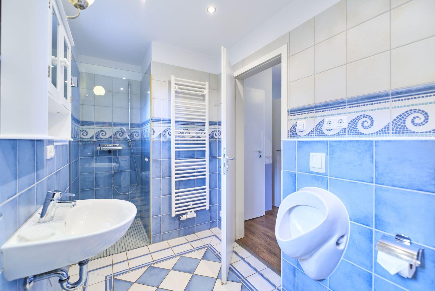 Das offene Wohnkonzept schafft ein einladendes Ambiente. Das Wohnzimmer ist mit einer gemütlichen Sofaecke, mehreren Fernsehern (insgesamt gibt es drei) und einer HiFi-Anlage ausgestattet, die ideal für entspannte Abende sind. Hier können Sie nach einem erlebnisreichen Tag in der Umgebung entspannen und die Zeit mit Freunden oder Familie genießen. Das moderne Bad bietet Ihnen sowohl eine bodengleiche Dusche als auch eine Badewanne, sodass Sie nach einem langen Tag am Strand wunderbar entspannen können. Waschbecken und Bidet runden die Ausstattung im Badezimmer ab.