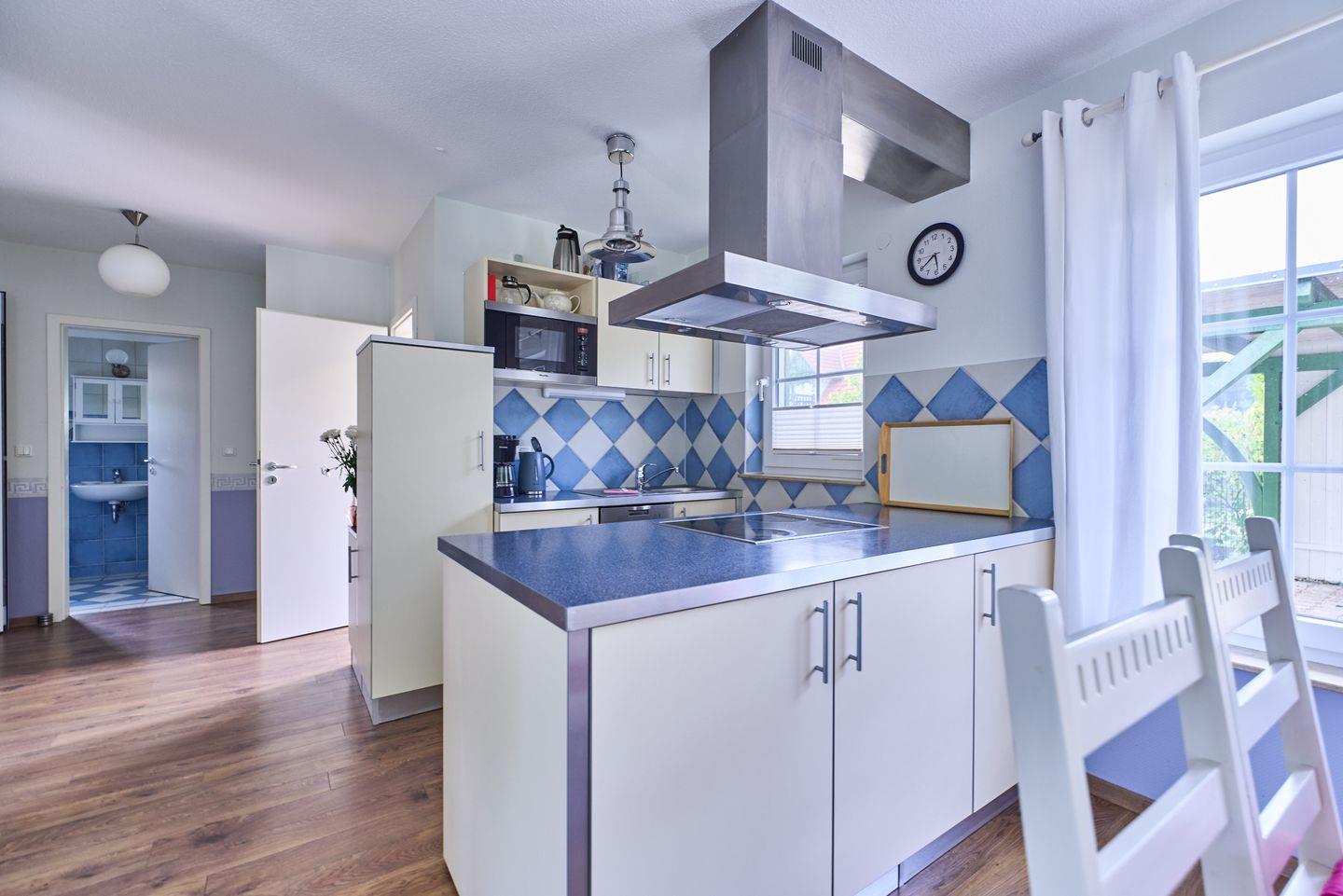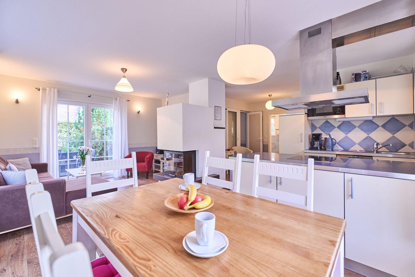 In der voll ausgestatteten Küche, die in das Wohnzimmer integriert ist, finden Sie alles, was Sie zum Zubereiten leckerer Mahlzeiten benötigen. Nutzen Sie den Ceranfeld-Herd, den Backofen oder die Spülmaschine, um Ihren Aufenthalt so angenehm wie möglich zu gestalten. Ein Essbereich mit einem großen Tisch bietet ausreichend Platz für gemeinsame Mahlzeiten und gesellige Abende.