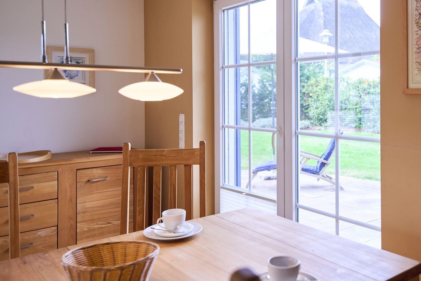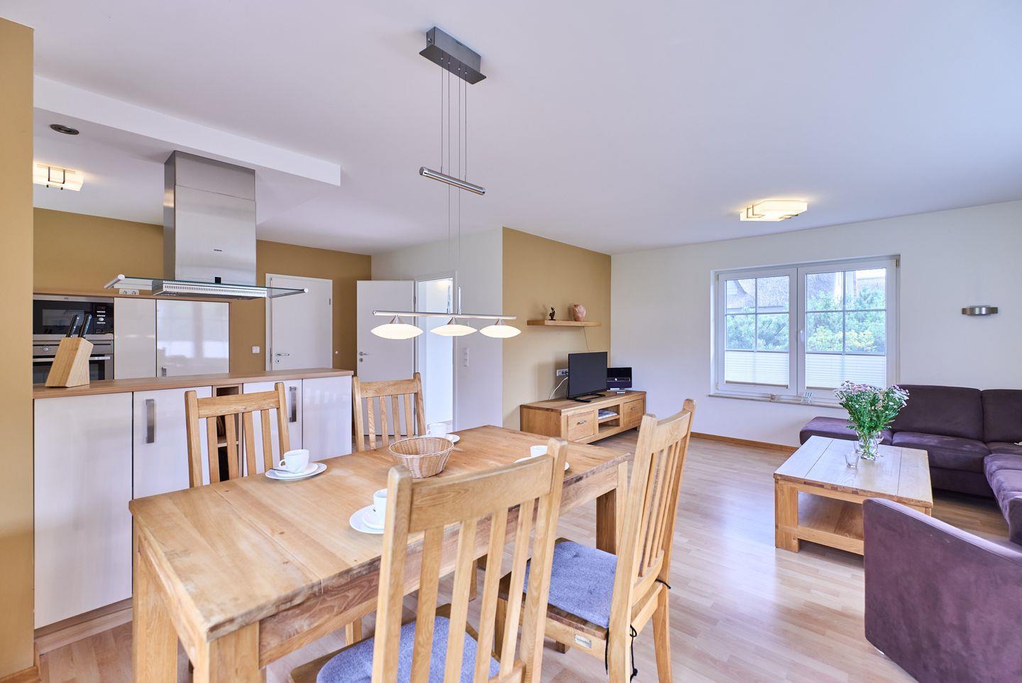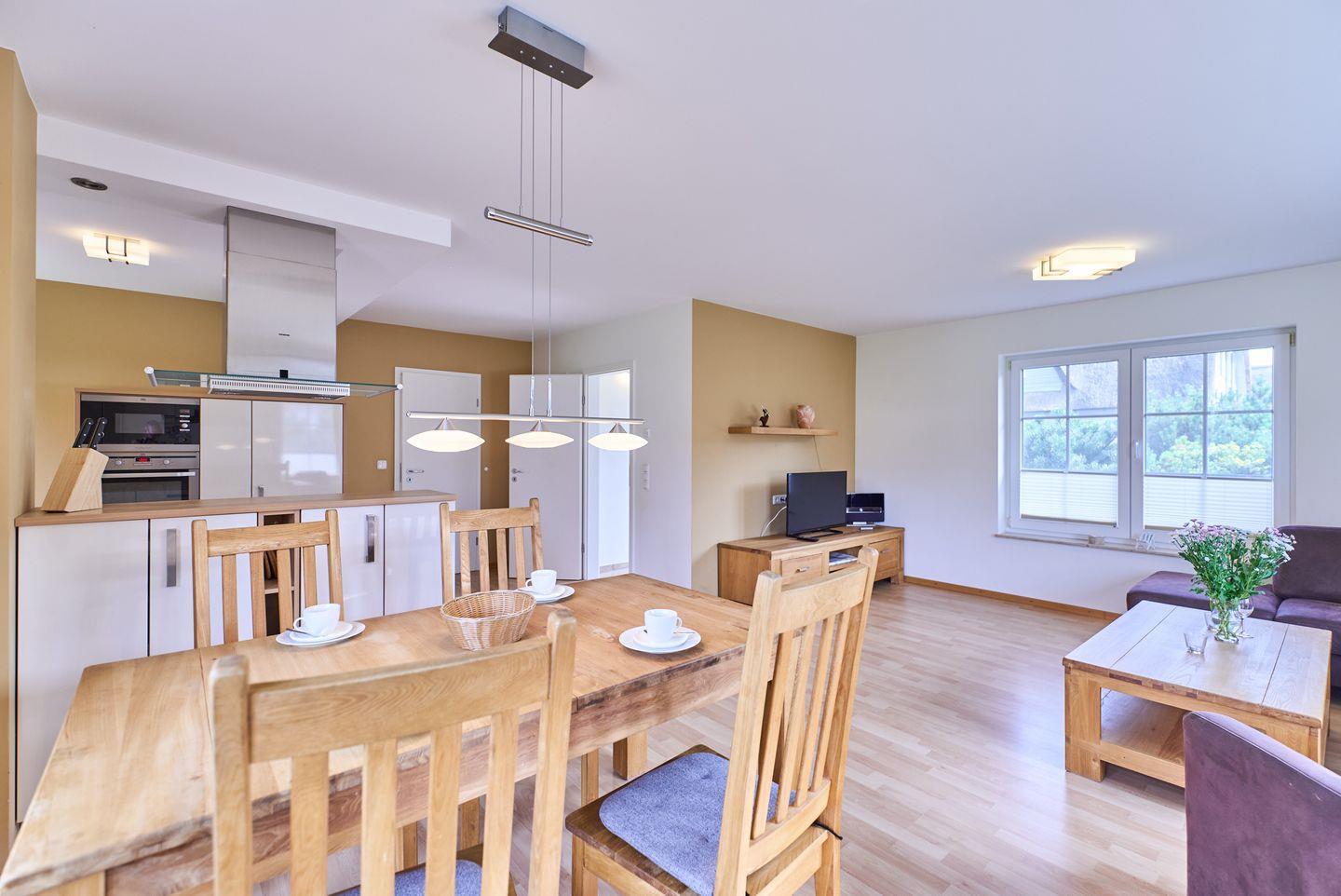 Das Herzstück des Hauses ist der offene Wohn- und Essbereich, der mit seiner hellen, freundlichen Atmosphäre einladend wirkt. Hier können Sie bei entspannten Stunden auf dem bequemen Sofa relaxen und Ihre Lieblingssendungen auf einem der zwei verfügbaren Fernseher genießen. Der angrenzende Essbereich mit einem großen Esstisch lädt dazu ein, gemeinsam zu speisen und gesellige Abende zu verbringen.
