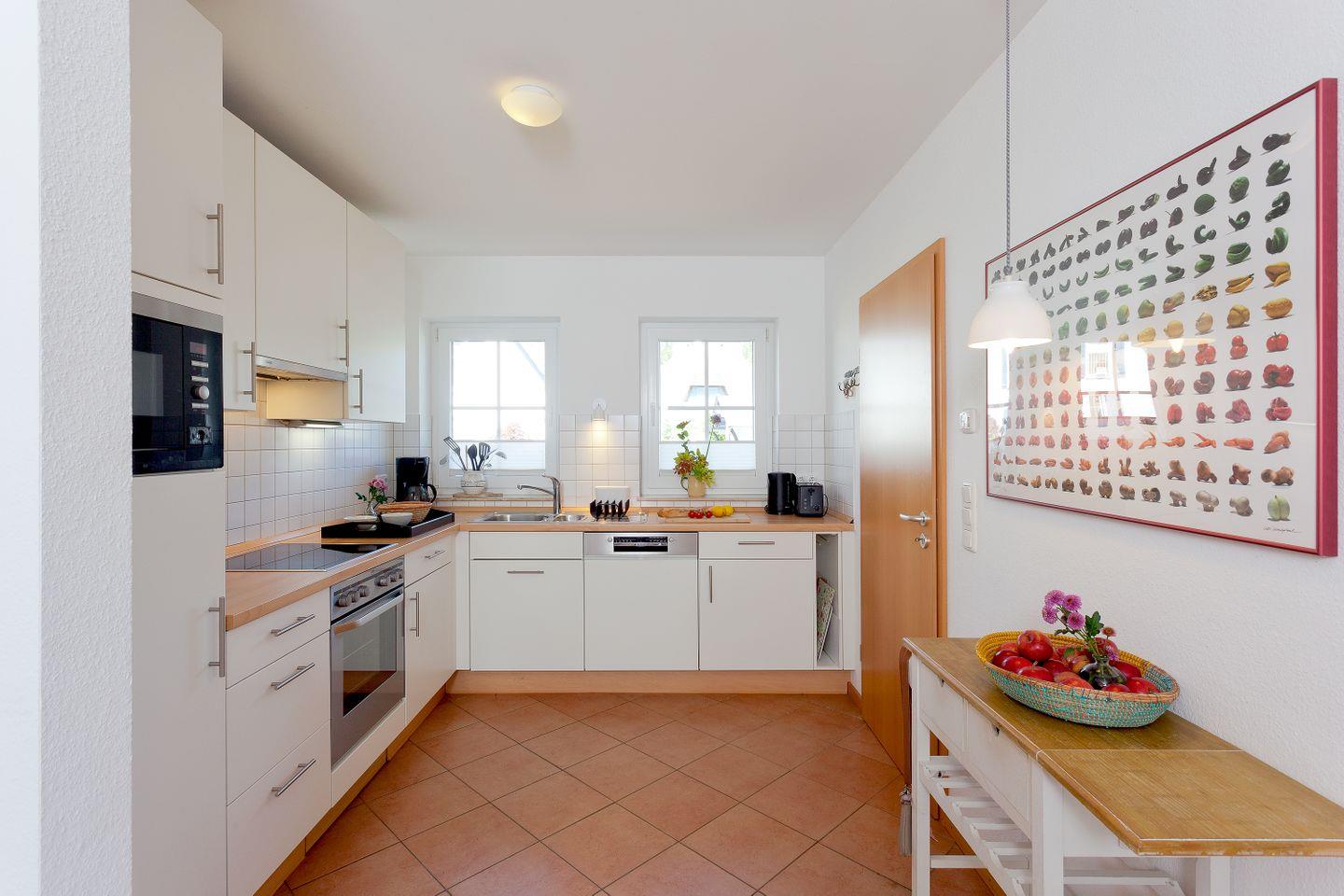 Die großzügige Wohnfläche von 74 m² verteilt sich auf zwei geschmackvoll eingerichtete Schlafzimmer und ein modernes Badezimmer mit einer Dusche und einer Badewanne. Die lichtdurchfluteten Räume verbinden sich harmonisch mit einer offenen Küche, in der Sie die Möglichkeit haben, gemeinsam zu kochen und zu speisen. Egal, ob Sie den Tag mit einem selbst zubereiteten Frühstück auf der großen Terrasse beginnen oder den Abend bei einem Grillabend ausklingen lassen möchten – die komplett ausgestattete Küche lässt keine Wünsche offen. Ihnen stehen ein Herd mit vier Platten, ein Backofen, eine Spülmaschine und viele Küchenutensilien zur Verfügung, damit Sie sich wie zu Hause fühlen können.