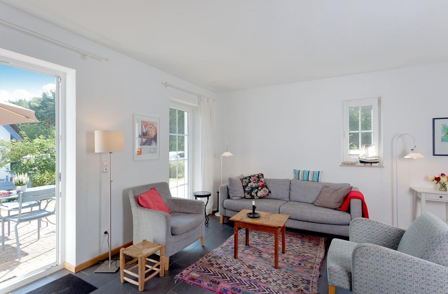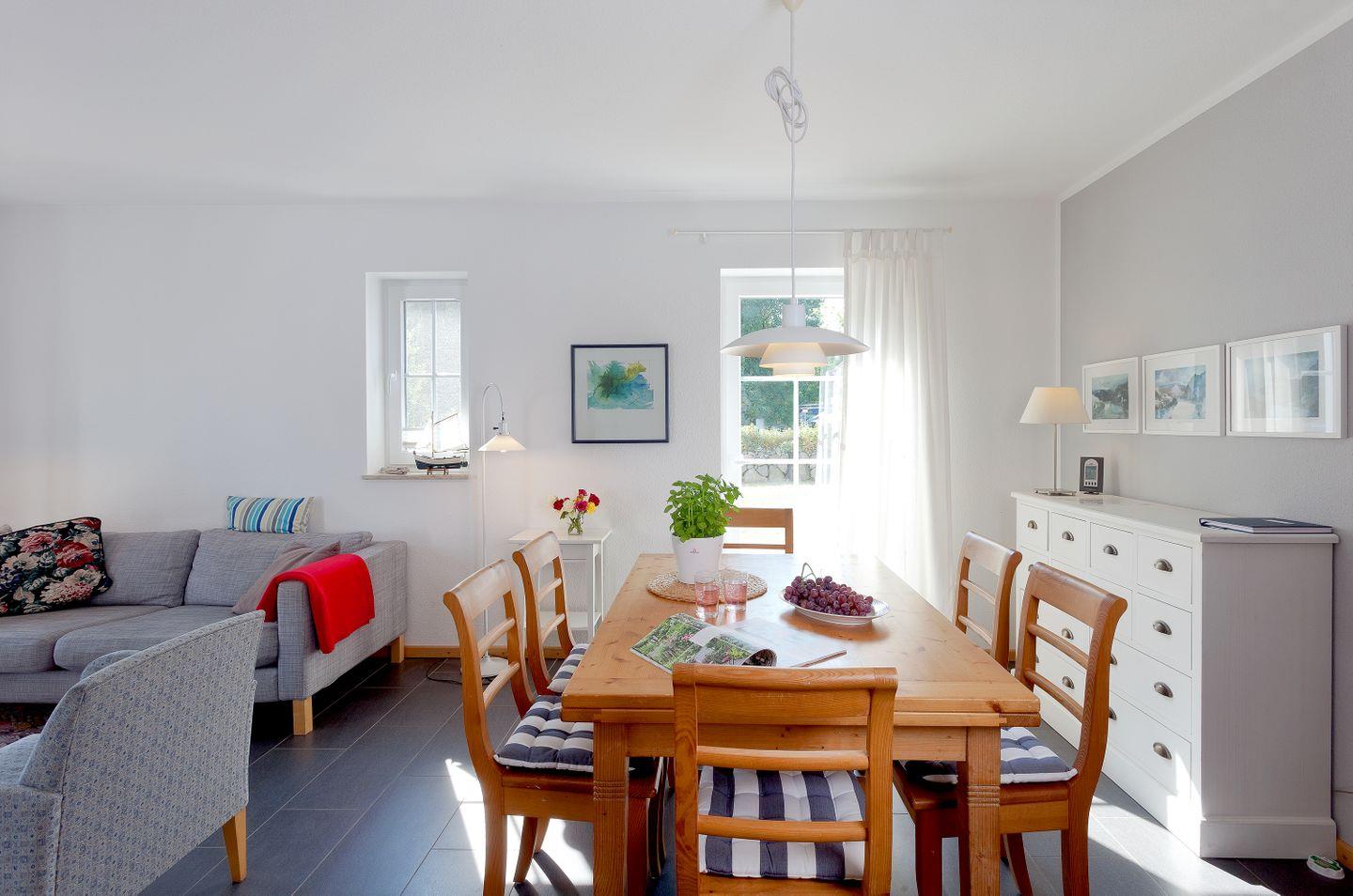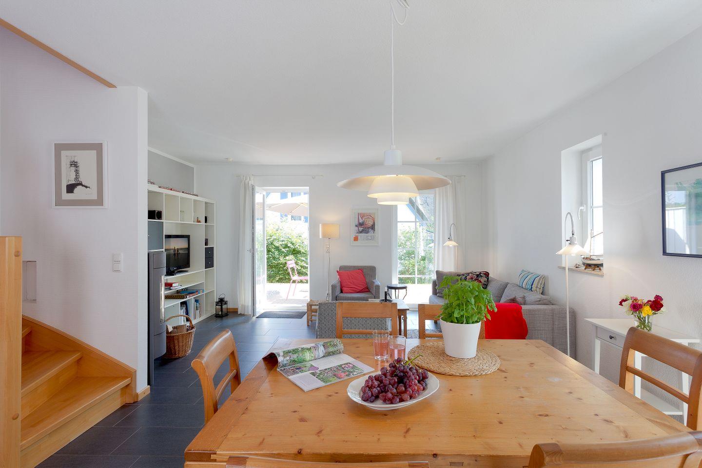 Die großzügige Ausstattung der 74 m² großen Unterkunft lässt keine Wünsche offen. Das lichtdurchflutete Wohnzimmer mit modernen Fliesenböden lädt zum Entspannen ein und ist ausgestattet mit einem gemütlichen Sofa sowie einem Esstisch für gemeinsame Essen und Spieleabende. Für Ihre Unterhaltung sorgt ein TV-Gerät und eine HiFi-Anlage – ideal für entspannte Film- oder Musikabende.