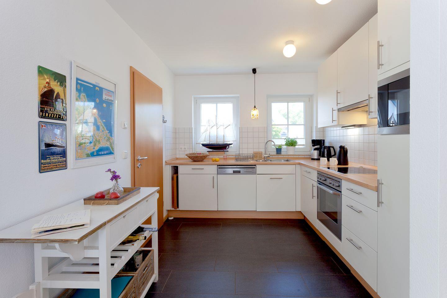 Die offene Küche ist mit allen notwendigen Utensilien ausgestattet, darunter ein Kühlschrank, Herd, Backofen, Geschirrspüler und eine Mikrowelle. Hier können Sie Ihre kulinarischen Fähigkeiten unter Beweis stellen oder einfach einen schnellen Snack zubereiten. Genießen Sie Ihre Mahlzeiten auf der Terrasse, die mit Gartenmöbeln, Strandkorb und einem Grillplatz ausgestattet ist – perfekt für ein geselliges Barbecue im Freien!