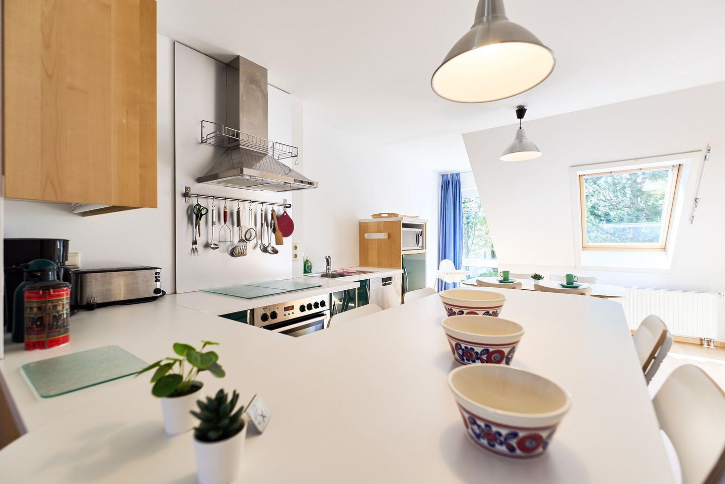 Die offene, voll ausgestattete Küche lässt keine Wünsche offen. Sie ist mit einem Cerankochfeld, Backofen, Kühlschrank und Geschirrspüler ausgestattet, damit Sie auch im Urlaub kulinarische Köstlichkeiten zubereiten können. Zusätzliche Annehmlichkeiten wie Mikrowelle, Wasserkocher und Kaffeemaschine runden die Ausstattung ab. Der angrenzende Essbereich bietet genügend Platz für gesellige Abendessen mit Familie und Freunden.