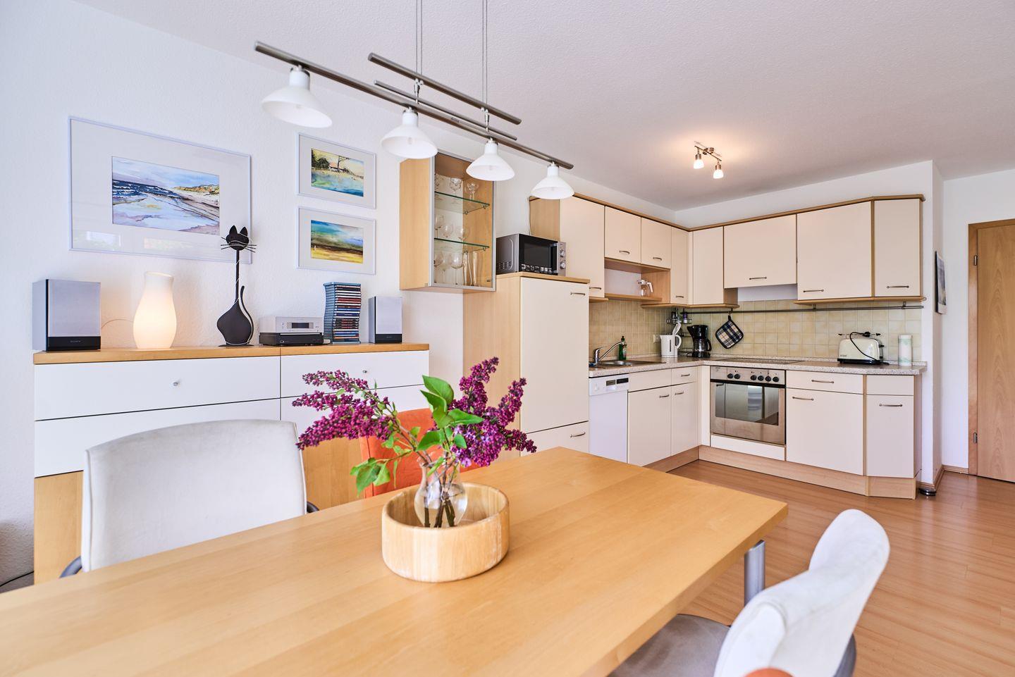 Die voll ausgestattete Küche lässt keine Wünsche offen: Hier finden Sie alle notwendigen Küchengeräte, darunter Herd, Backofen, Kühlschrank, Geschirrspüler und sogar eine Mikrowelle. Bereiten Sie köstliche Mahlzeiten zu und genießen Sie diese auf der überdachten Terrasse, die sich hervorragend für entspannte Stunden im Freien eignet. Gartenmöbel und ein Strandkorb laden dazu ein, die Seele baumeln zu lassen und die frische Seeluft zu genießen.