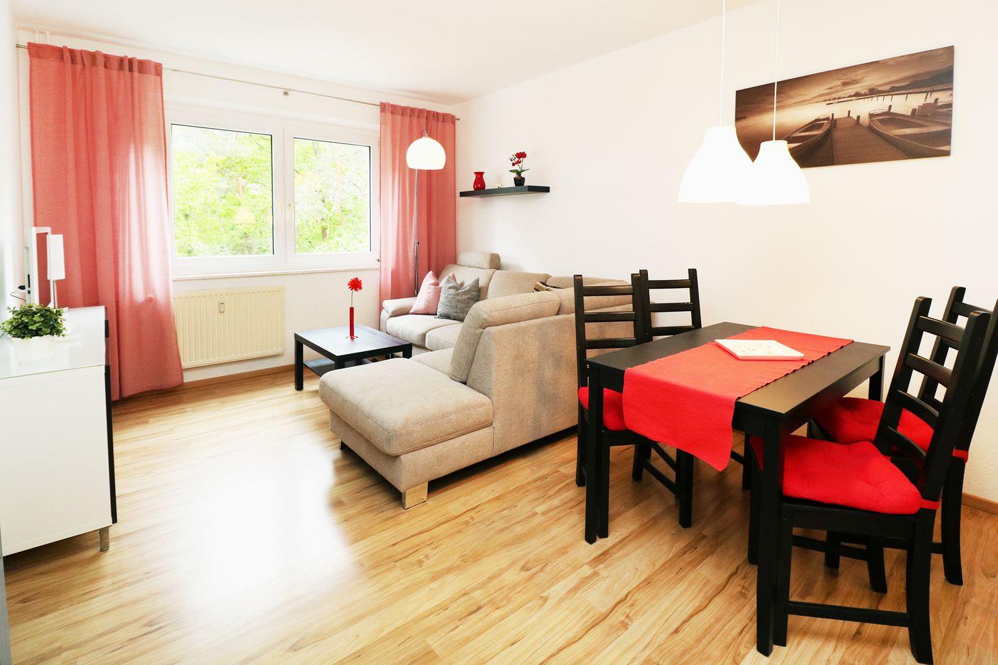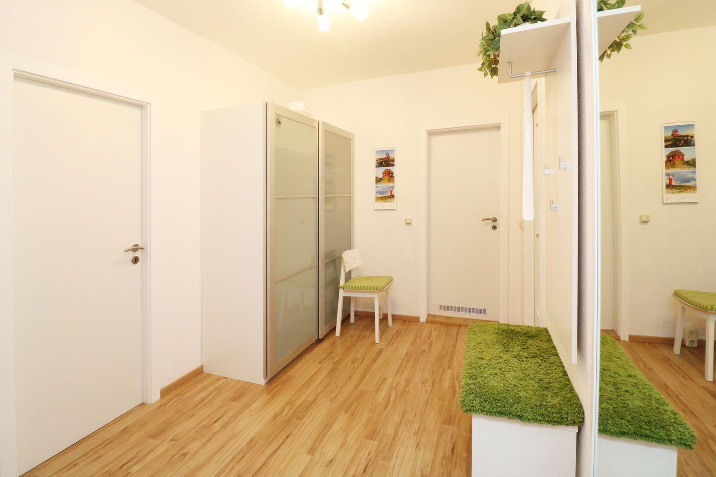 Mit einer Größe von 63 m² bietet die Ferienwohnung Platz für bis zu vier Personen und ist perfekt für Familien oder Paare, die Gemütlichkeit und Komfort suchen. Die Wohnung verfügt über zwei liebevoll eingerichtete Schlafzimmer, die mit Laminatboden ausgestattet sind und eine ruhige Atmosphäre zum Entspannen bieten. Das helle Wohnzimmer lädt mit seiner Sofaecke zum Verweilen ein. Hier können Sie nach einem ereignisreichen Tag entspannen und vielleicht einen Film auf dem Fernseher, der über Kabelanschluss verfügt, ansehen oder gemütlich ein Buch lesen.