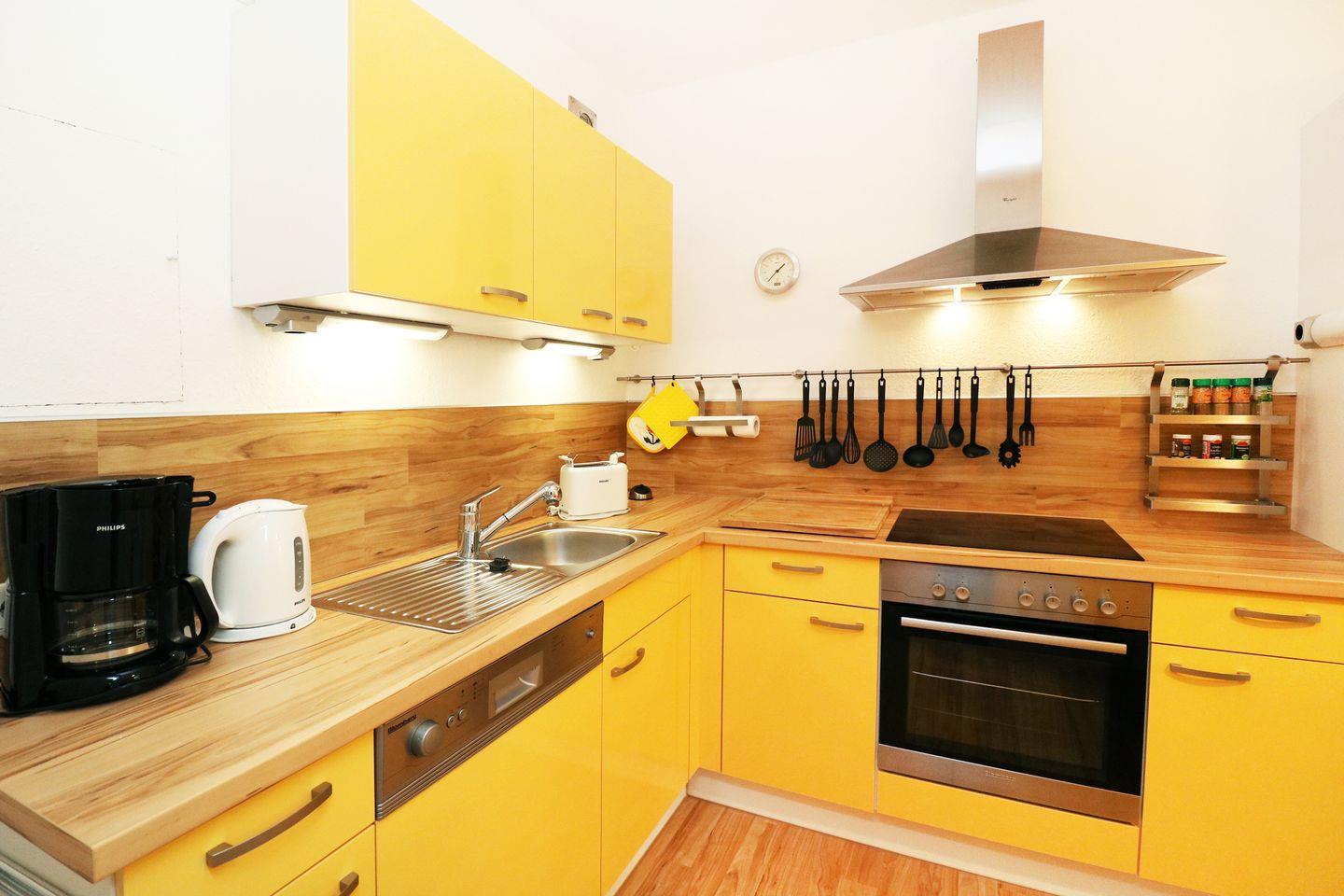 Die voll ausgestattete, geschlossene Küche mit Essbereich ist der perfekte Ort, um selbst köstliche Gerichte zuzubereiten. Neben modernen Küchengeräten wie einem Tiefkühlwürfel, Cerankochfeld, Backofen, Mikrowelle und Kühlschrank, steht Ihnen auch eine Spülmaschine zur Verfügung – für Ihren Komfort und Ihre Entspannung. Genießen Sie Ihre Mahlzeiten am Esstisch oder auf der überdachten Terrasse, die Ihnen die Möglichkeit gibt, die frische Ostsee-Luft auch im Freien zu genießen.