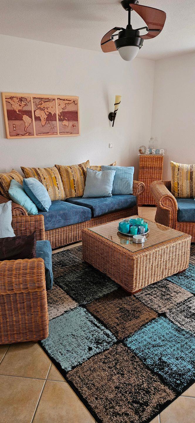 Die Wohnung besteht aus zwei charmanten Schlafzimmern, die mit Teppichboden ausgestattet sind und eine ruhige Nachtruhe garantieren. Das offene Wohnzimmer ist mit Fliesenboden gestaltet und verfügt über ein gemütliches Sofa, einen Sessel und einen Fernseher, sodass Sie abends entspannen und Ihre Lieblingsfilme genießen können. Für gesellige Abende steht Ihnen ein großer Esstisch zur Verfügung.