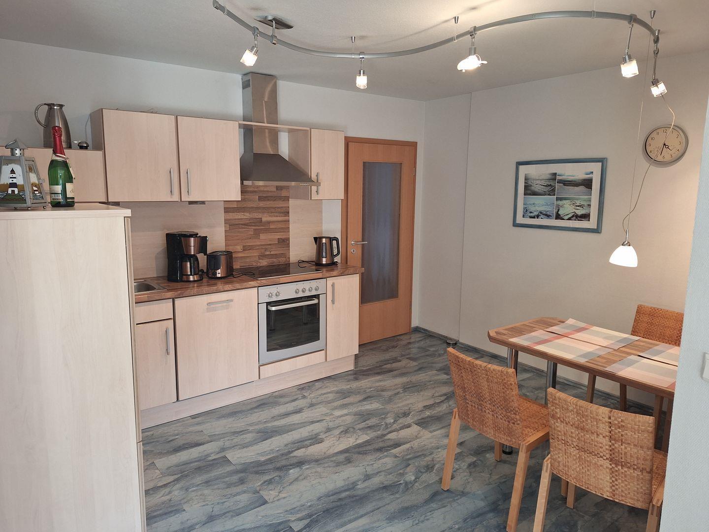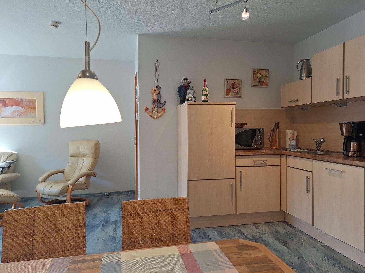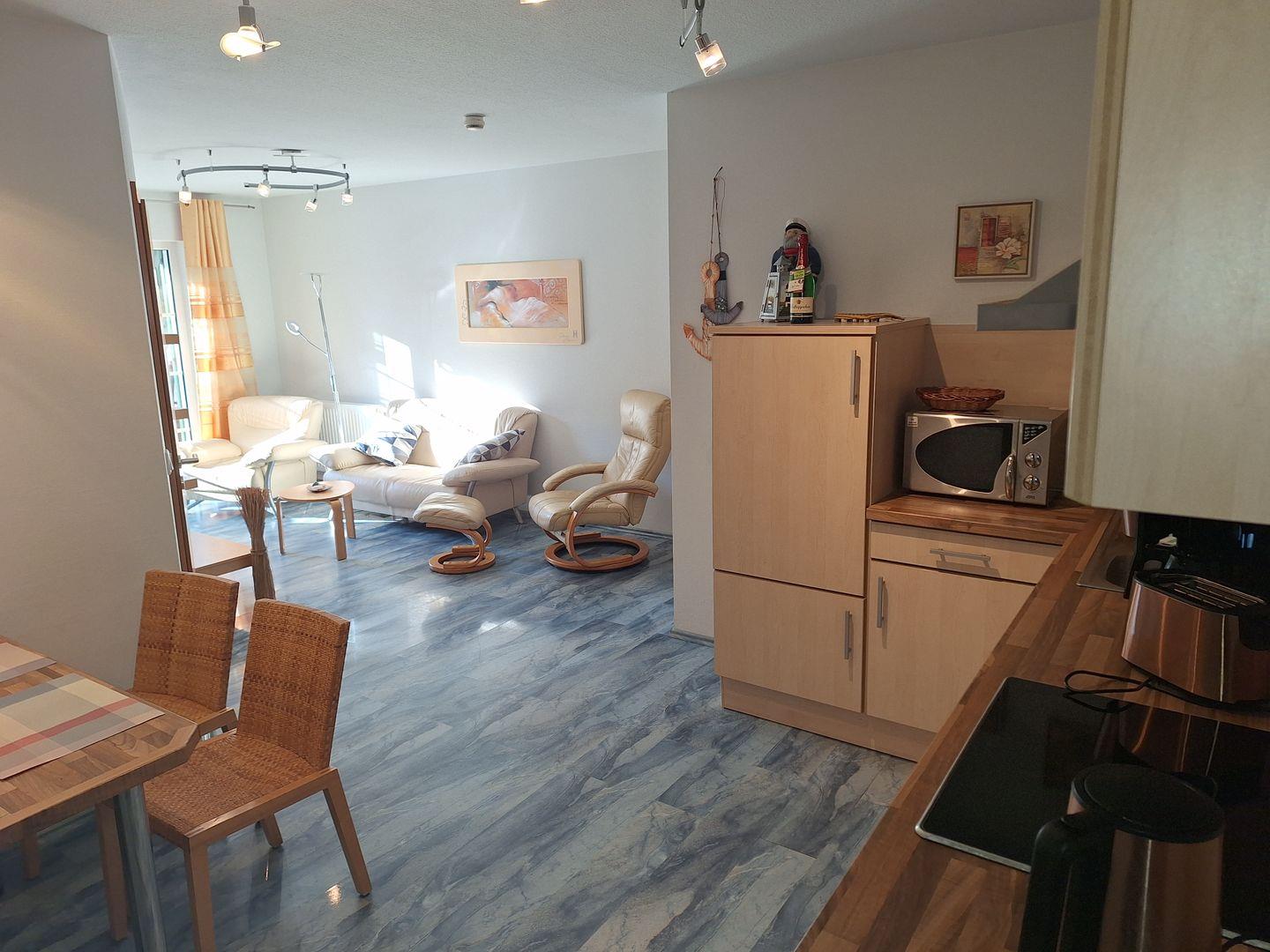 Die Ferienwohnung verfügt über zwei geschmackvoll eingerichtete Schlafzimmer, die mit hochwertigen Laminatböden ausgestattet sind. Hier können Sie nach einem erlebnisreichen Tag am Strand erholsam schlafen und neue Energie tanken. Das bequeme Wohnzimmer ist mit einem Sofa, Sessel und einem Essbereich eingerichtet, der ein geselliges Zusammensein ermöglicht. Eine offene Küche mit modernen Geräten wie einer Spülmaschine, einem Backofen, einem Kühlschrank und einer Mikrowelle macht das Kochen zum Vergnügen. Für unterhaltsame Abende sorgen der DVD-Player, das Radio und eine Auswahl an Spielen und Büchern.