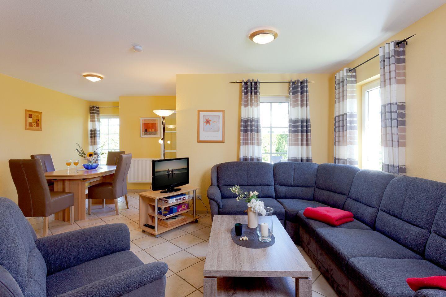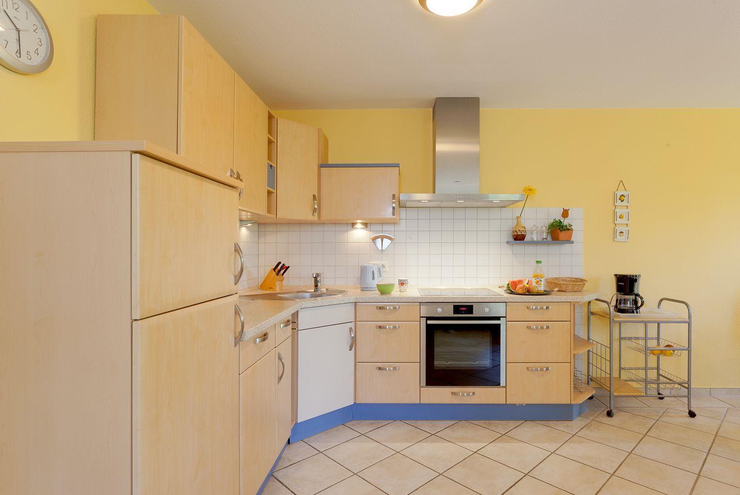 Die Ferienwohnung überzeugt durch ihre offene, helle Raumgestaltung und bietet einen gemütlichen Wohnbereich mit bequemer Sofaecke, Fernseher und einem Essbereich, der zum geselligen Verweilen einlädt. Die Küche ist vollständig ausgestattet und lässt keine Wünsche offen: Sie finden einen Herd, Backofen, Mikrowelle, Kühlschrank mit Gefrierfach, Geschirrspüler, Wasserkocher, Kaffeemaschine, Toaster und alle notwendigen Küchenutensilien. Hier können Sie Ihre kulinarischen Fähigkeiten entfalten und gemeinsam mit Ihren Liebsten köstliche Mahlzeiten zubereiten.