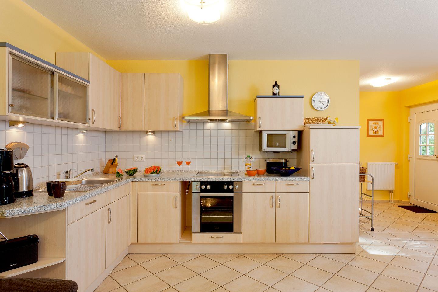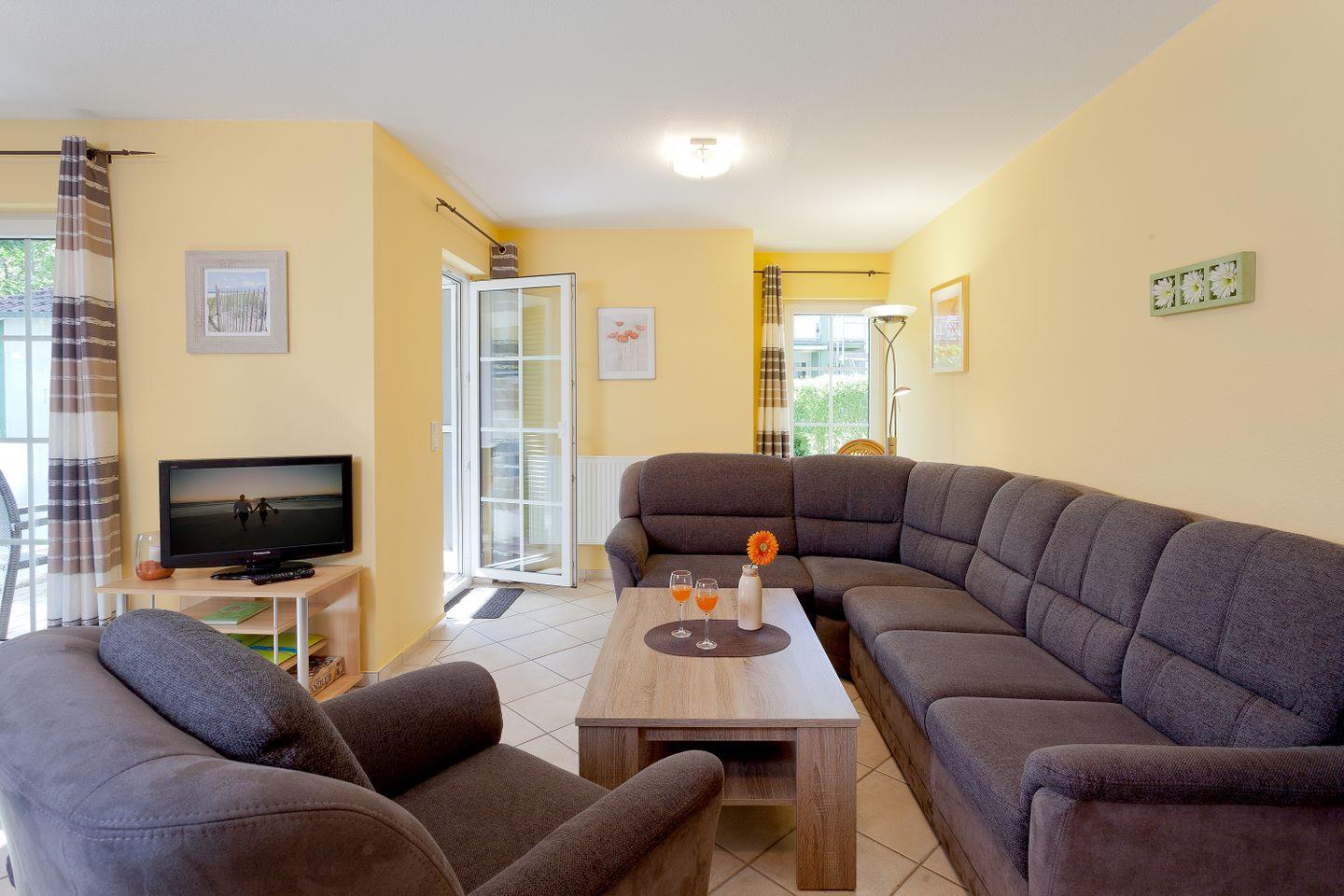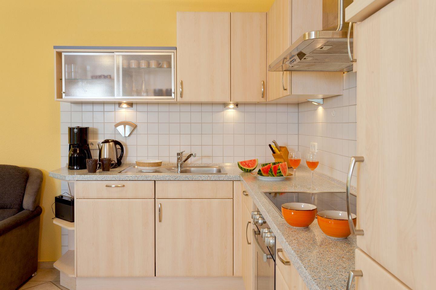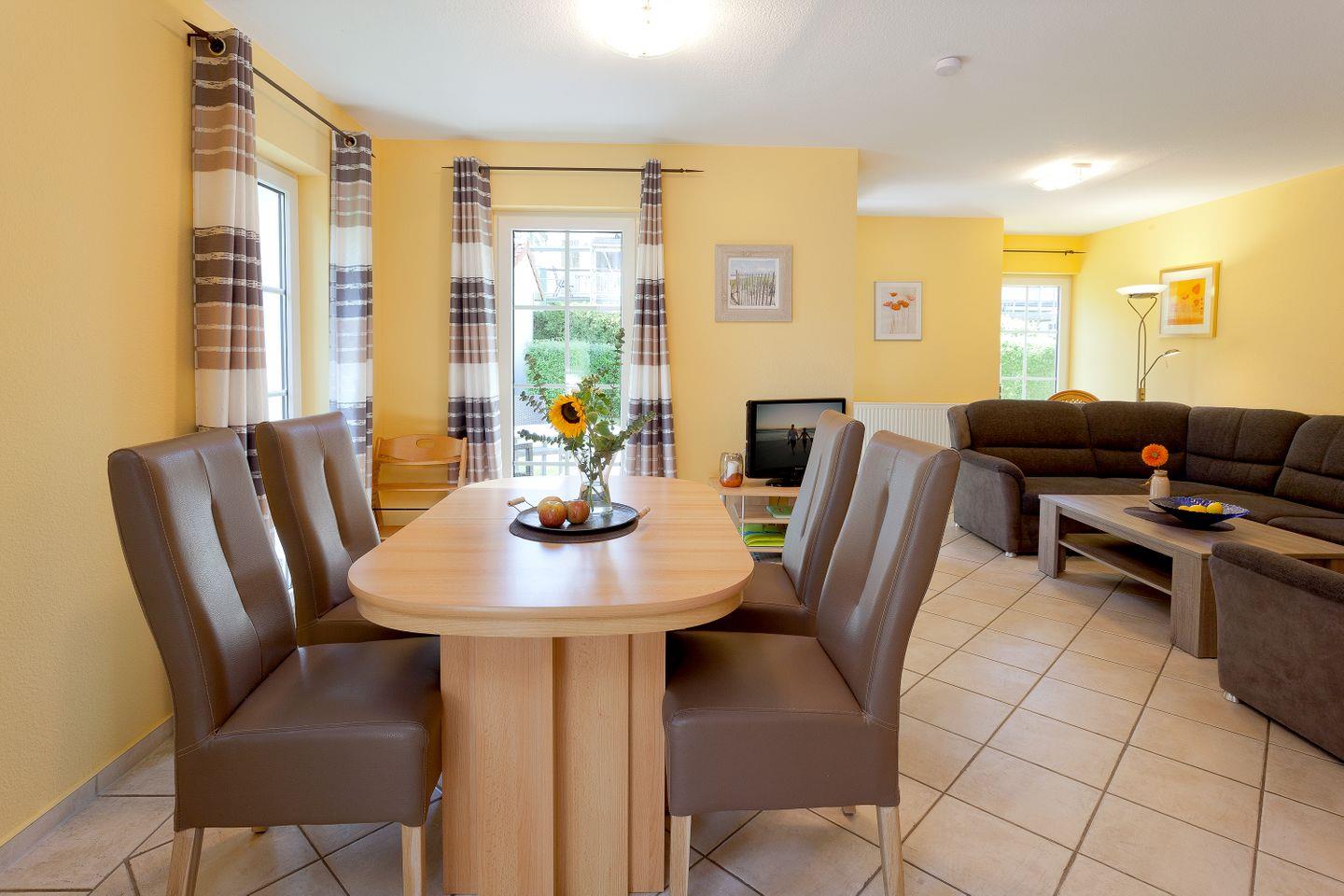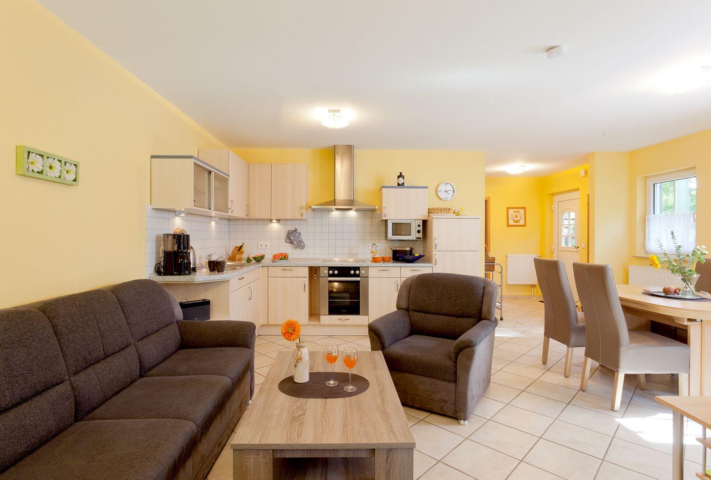 Die offene und moderne Küche ist der ideale Ort für kulinarische Entfaltungen. Sie ist mit allen wichtigen Küchenutensilien ausgestattet, darunter ein Herd mit Ceranfeld, ein Backofen, eine Spülmaschine und eine Mikrowelle, sodass Sie während Ihres Aufenthalts bequem selbst kochen können. Der angrenzende Essbereich lädt dazu ein, die zubereiteten Köstlichkeiten in geselliger Runde zu genießen. Das helle Wohnzimmer mit einer Sofaecke und einem Fernseher sorgt für entspannte Abende nach einem erlebnisreichen Tag in der Natur oder am Strand.