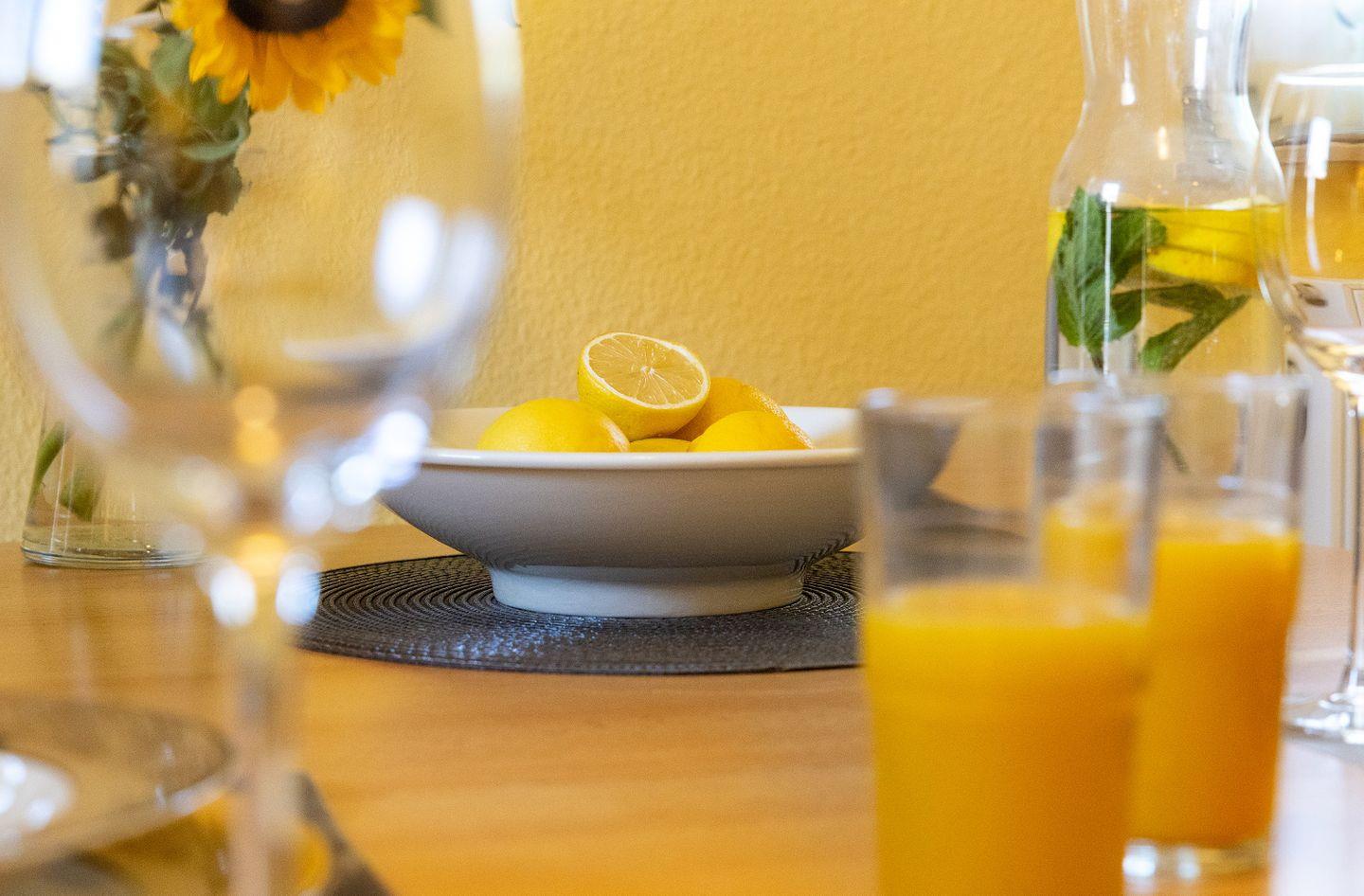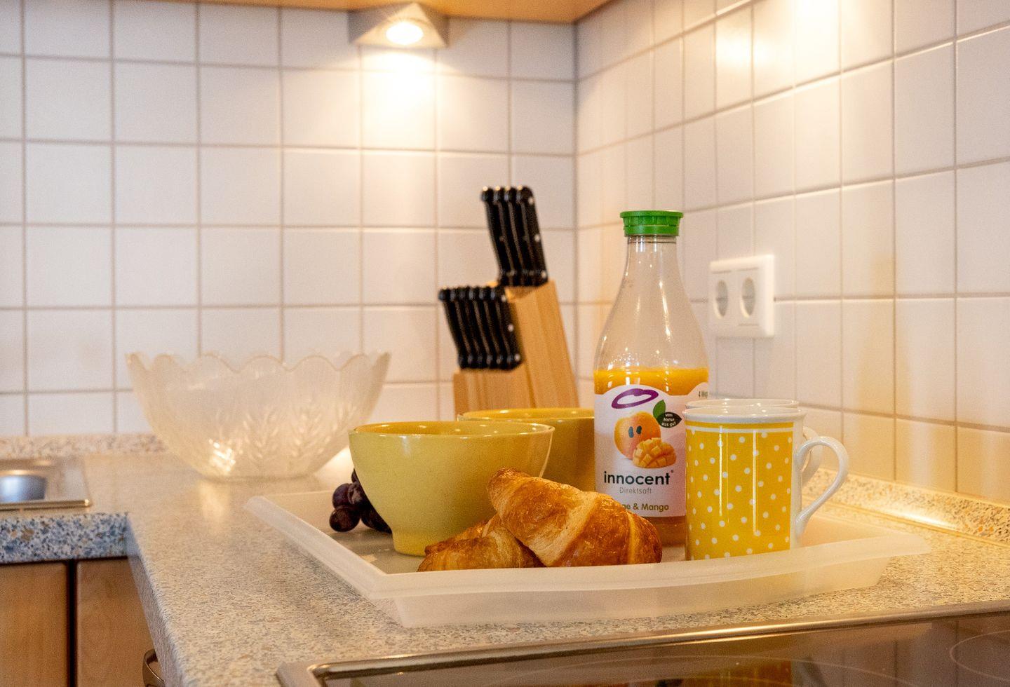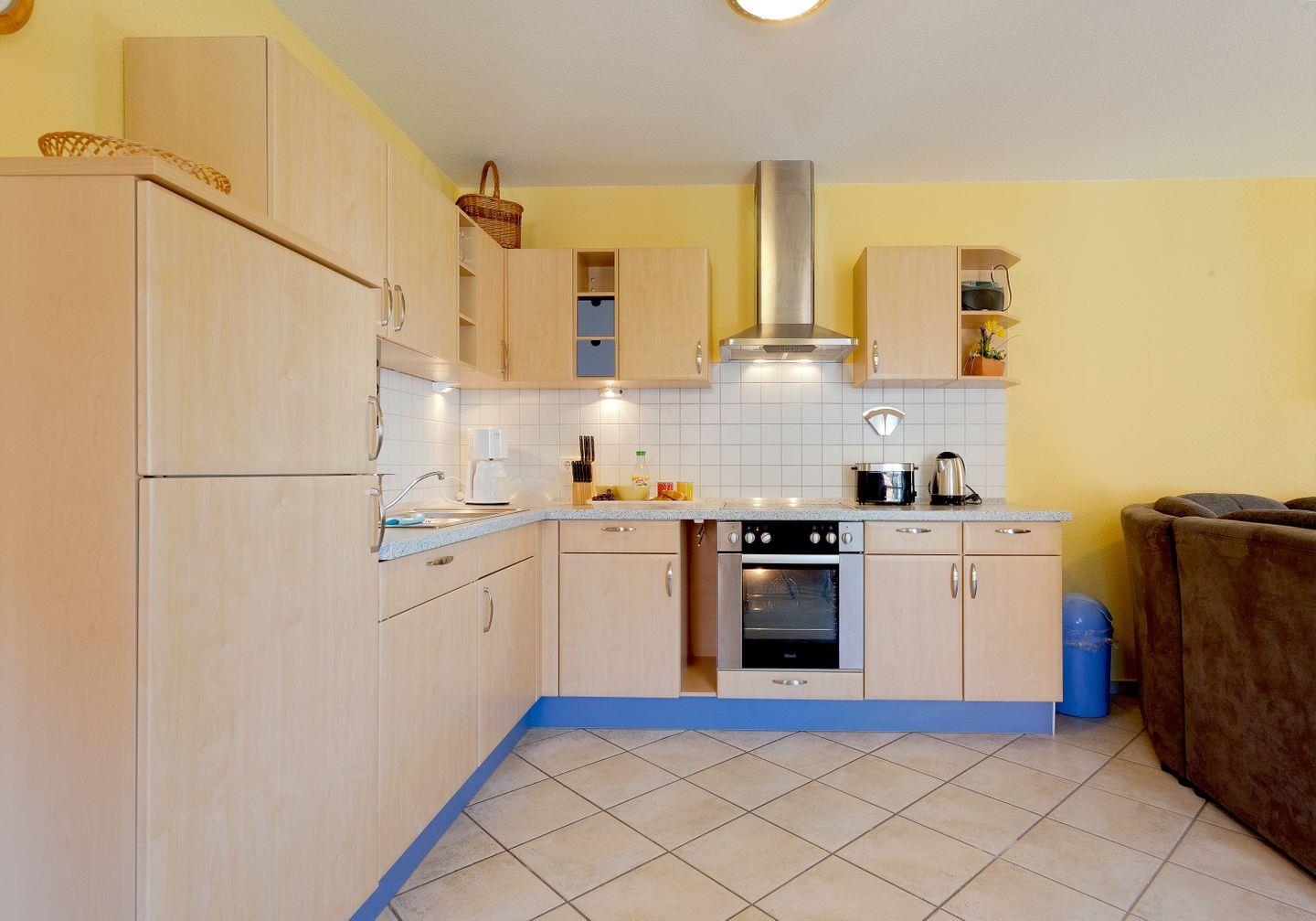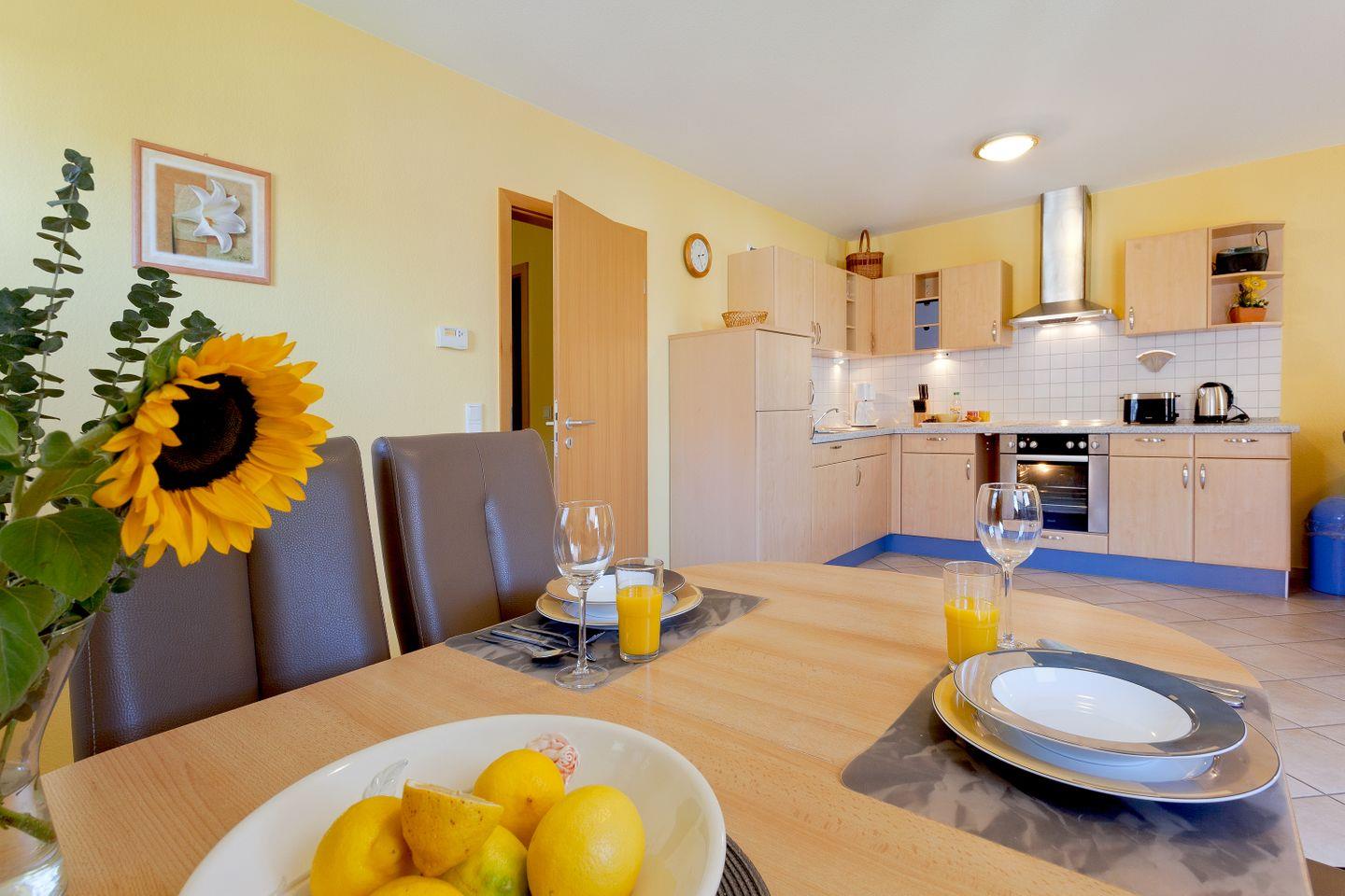Die voll ausgestattete Küche lässt keine Wünsche offen: mit einem Ceranfeld, Backofen, Mikrowelle, Kühlschrank, Geschirrspüler, Toaster, Wasserkocher und einer Kaffeemaschine können Sie köstliche Mahlzeiten zaubern. Der Esstisch im Wohnbereich bietet ausreichend Platz für gemeinsame Essen und gesellige Abende.