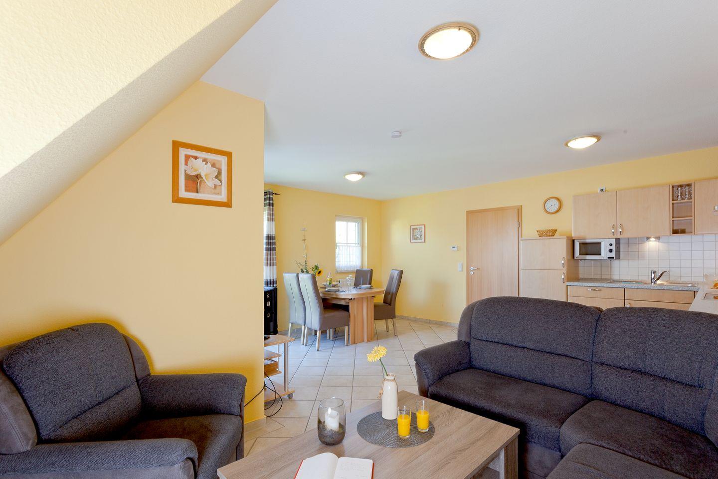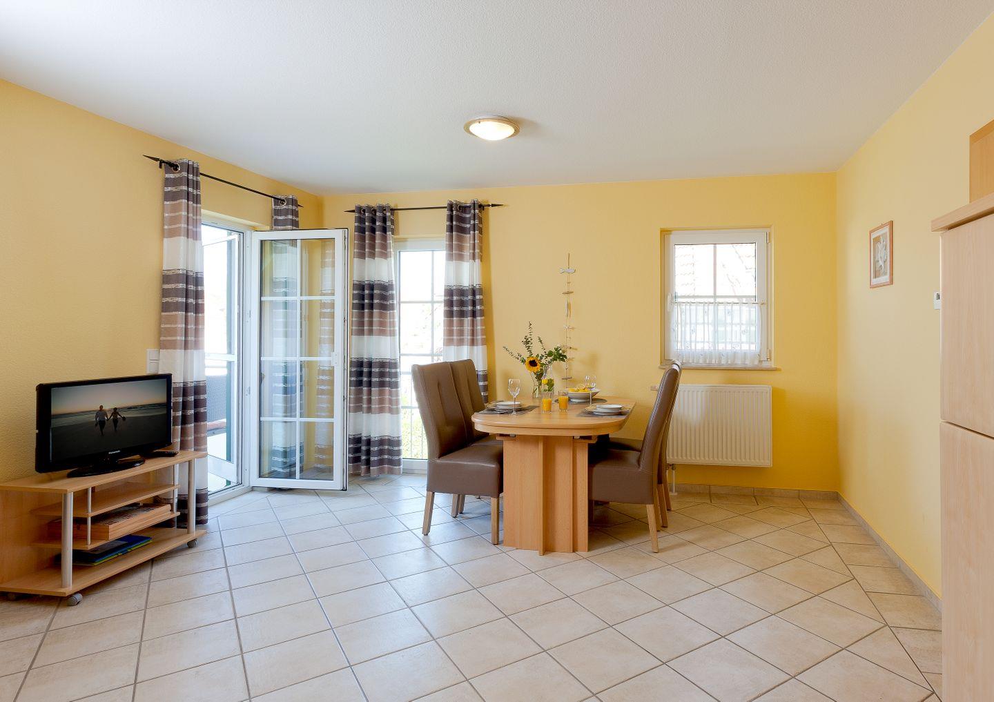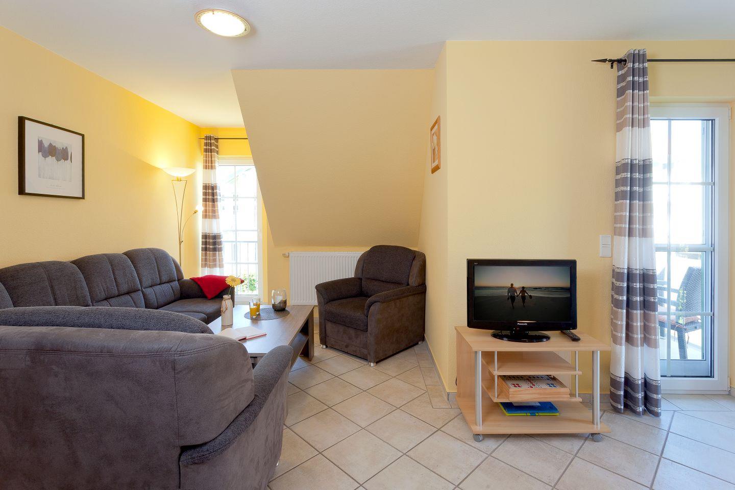 Mit einer großzügigen Fläche von 59 m² erwartet Sie eine helle und freundliche Atmosphäre. Die Wohnung verfügt über zwei einladende Schlafzimmer, die mit modernen Fliesen ausgestattet sind. Das offene Wohnzimmer lädt zum Verweilen ein und bietet eine komfortable Sofaecke, einen Essbereich sowie Zugang zu einem Balkon, auf dem Sie entspannende Stunden bei frischer Seeluft genießen können. Das lichtdurchflutete Wohnzimmer ist mit einem Fernseher und einem CD-Spieler ausgestattet, sodass Sie auch bei schlechtem Wetter Unterhaltung finden.