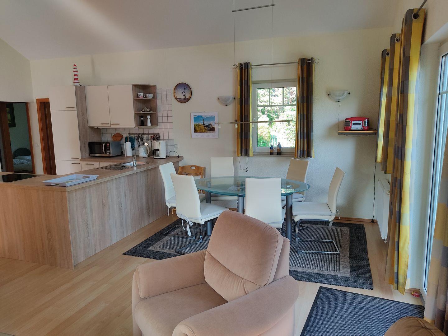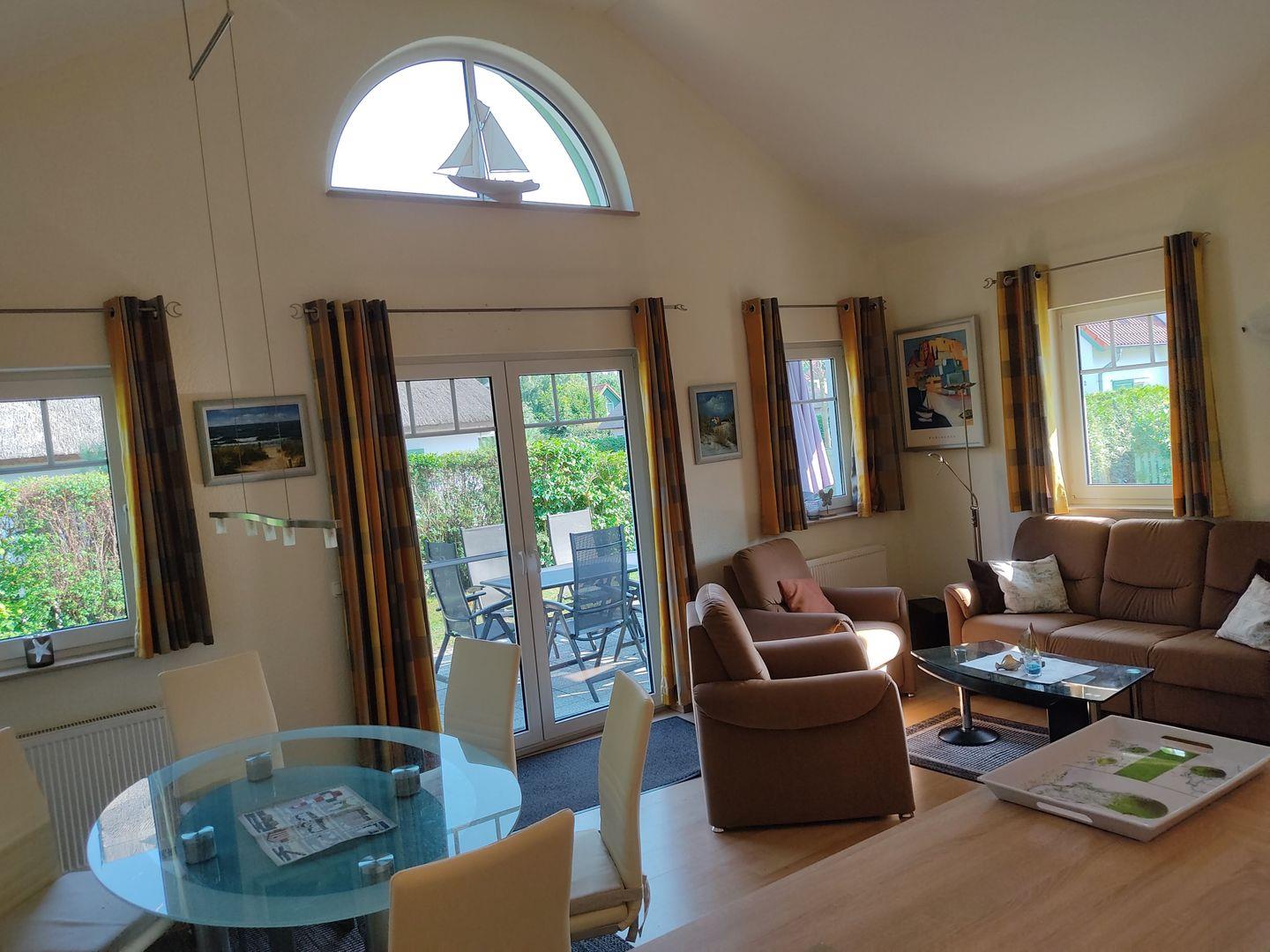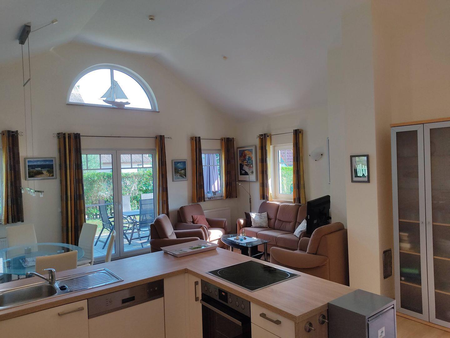 Das Herzstück des Hauses bildet der offene Wohnbereich mit einem gemütlichen Wohnzimmer. Hier finden Sie ein einladendes Sofa, eine Sesselgruppe und einen Esstisch für gemeinsame Mahlzeiten. Dank der großen Fenster ist der Raum hell und freundlich – genießen Sie die entspannende Atmosphäre und den Blick in den Garten. Ein Flachbild-TV und ein CD-Spieler sorgen für Unterhaltung in den Abendstunden.