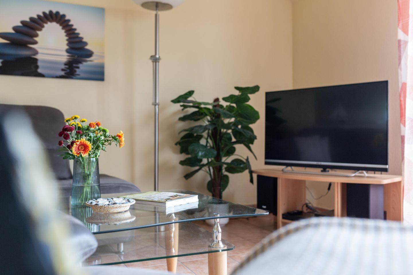 Direkt in der Ferienwohnung finden Sie zwei gemütliche Schlafzimmer, die mit hochwertigen Fliesenböden ausgestattet sind und erholsame Nächte garantieren. Das offene Wohnkonzept verbindet den Wohnbereich und die voll ausgestattete Küche. Hier können Sie gemeinsam köstliche Mahlzeiten zubereiten und den Abend bei einem Glas Wein auf dem gemütlichen Sofa ausklingen lassen. Die Küche ist mit allen notwendigen Annehmlichkeiten ausgestattet, darunter Mikrowelle, Backofen, Geschirrspüler und eine Kaffeemaschine. Für Unterhaltung sorgen ein Fernseher, eine HiFi-Anlage und eine Auswahl an Büchern, Spielen, CDs und DVDs. Zusätzliche Extras wie Bettwäsche und Handtücher (diese sind NICHT in Ihrer Buchung enthalten),können über unsere Gäste-App dazu gebucht werden.