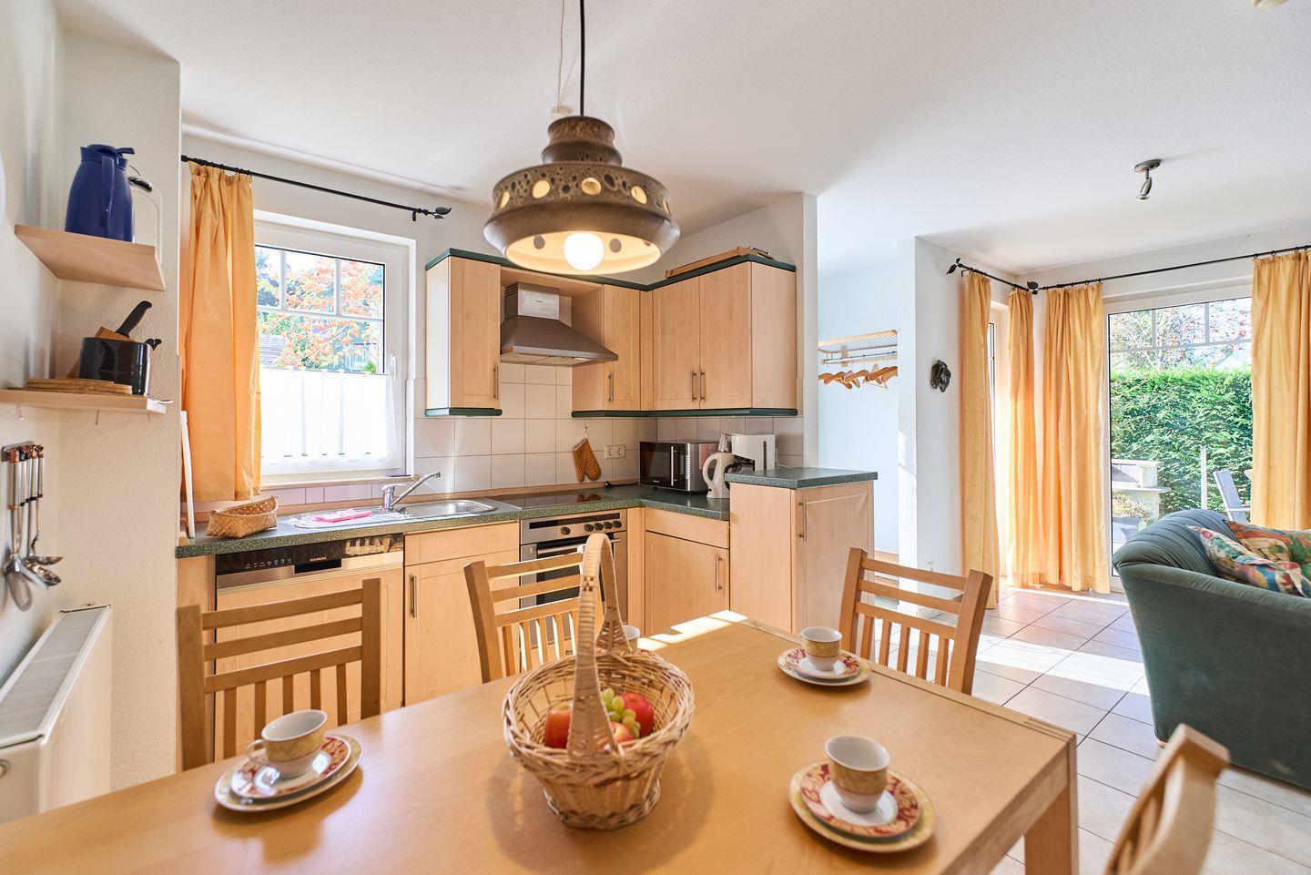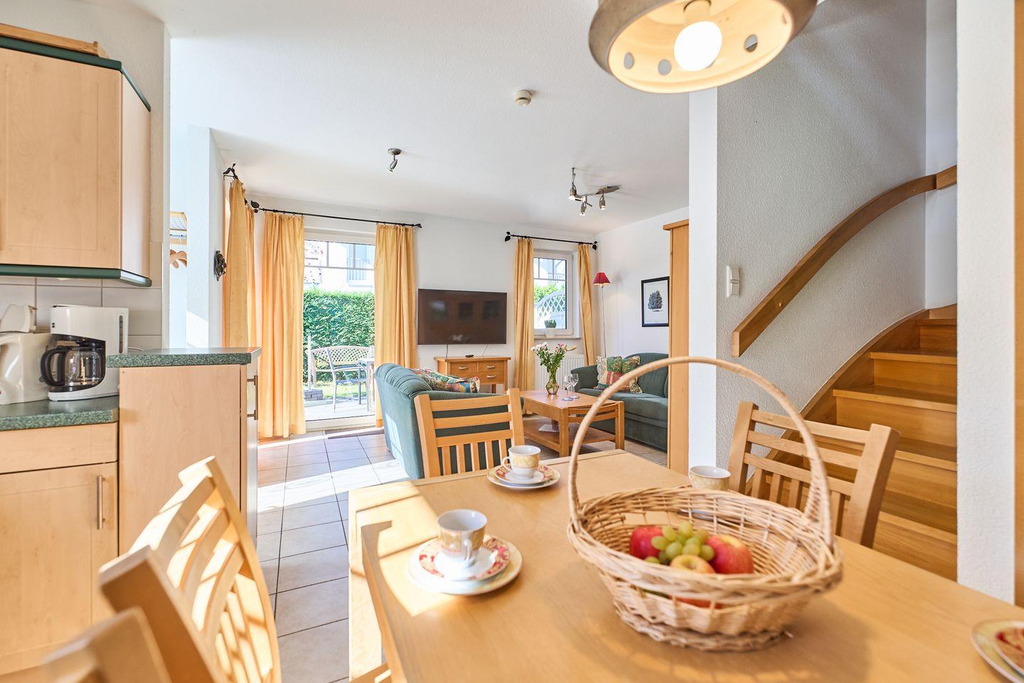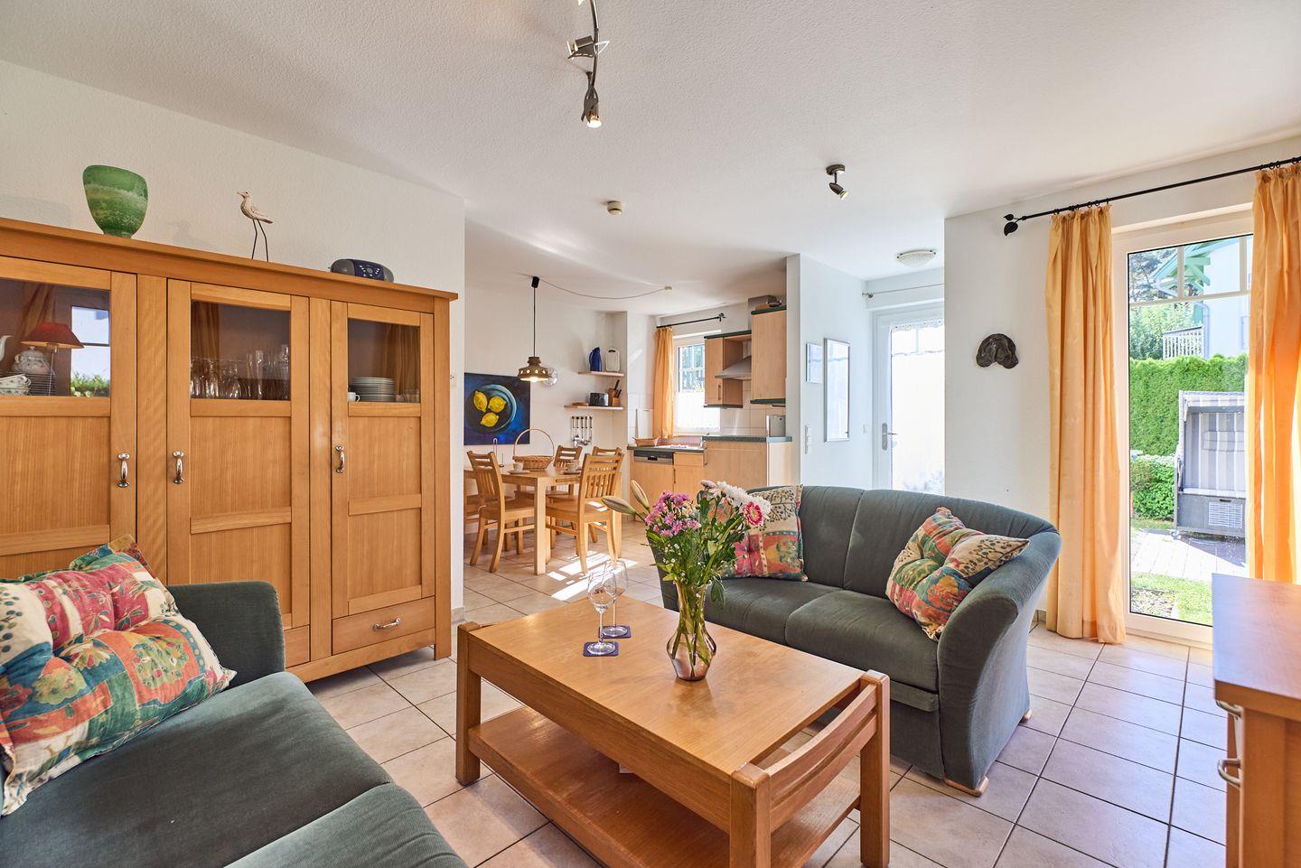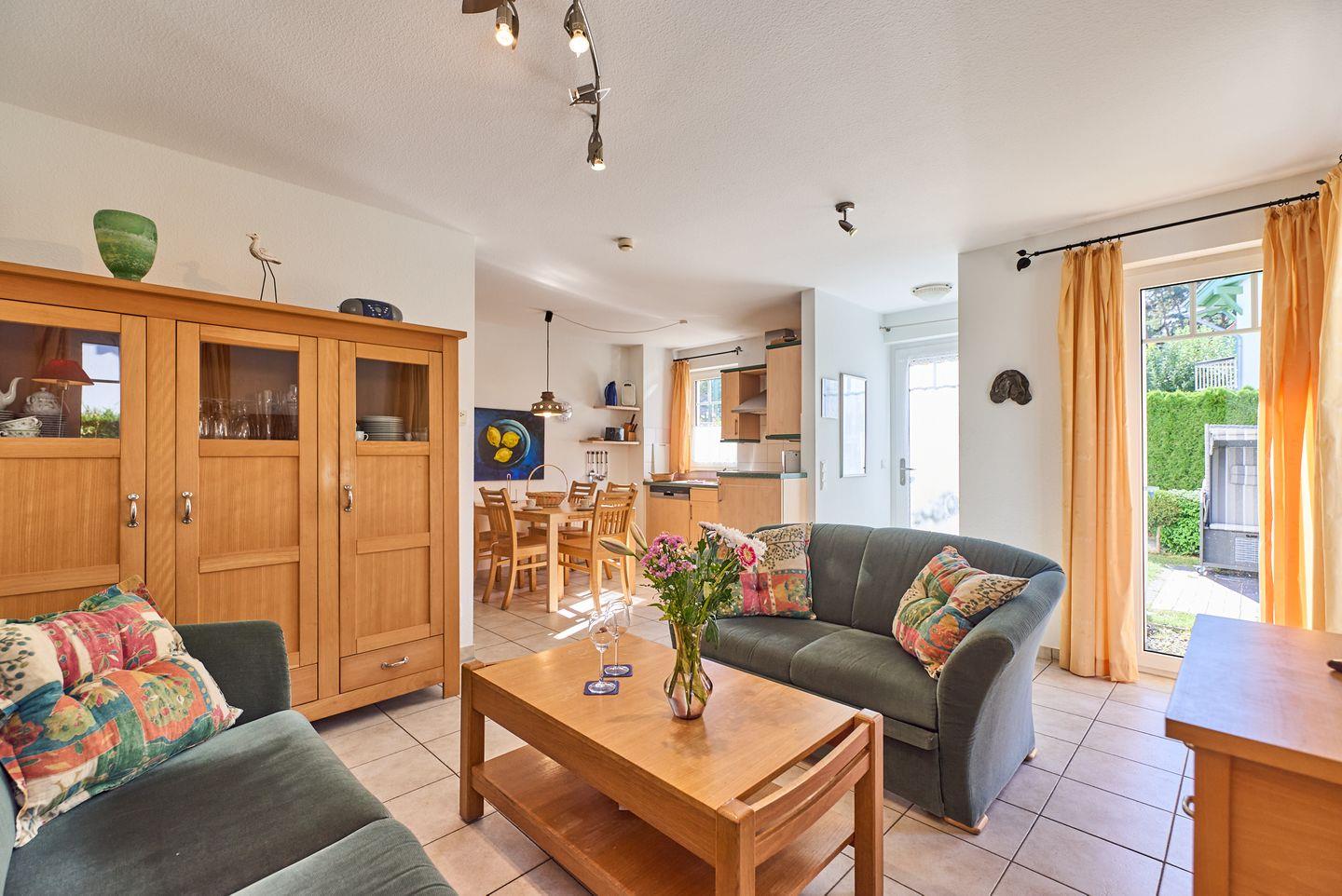 Die offene und lichtdurchflutete Gestaltung macht sofort gute Laune. Der Wohnbereich ist mit einem gemütlichen Sofa ausgestattet, das zum Entspannen nach einem erlebnisreichen Tag einlädt. Die moderne Küche ist voll ausgestattet mit hochwertigen Küchengeräten, einschließlich eines Cerankochfeldes, Backofen, Mikrowelle und einer Spülmaschine. Hier können Sie Ihre Lieblingsgerichte zubereiten und die gemeinsamen Mahlzeiten am großen Esstisch genießen. Ein weiteres Highlight ist der Zugang zu Ihrem eigenen Balkon und der Terrasse, auf der Sie die frische Seeluft und die ruhige Umgebung in vollen Zügen genießen können.
