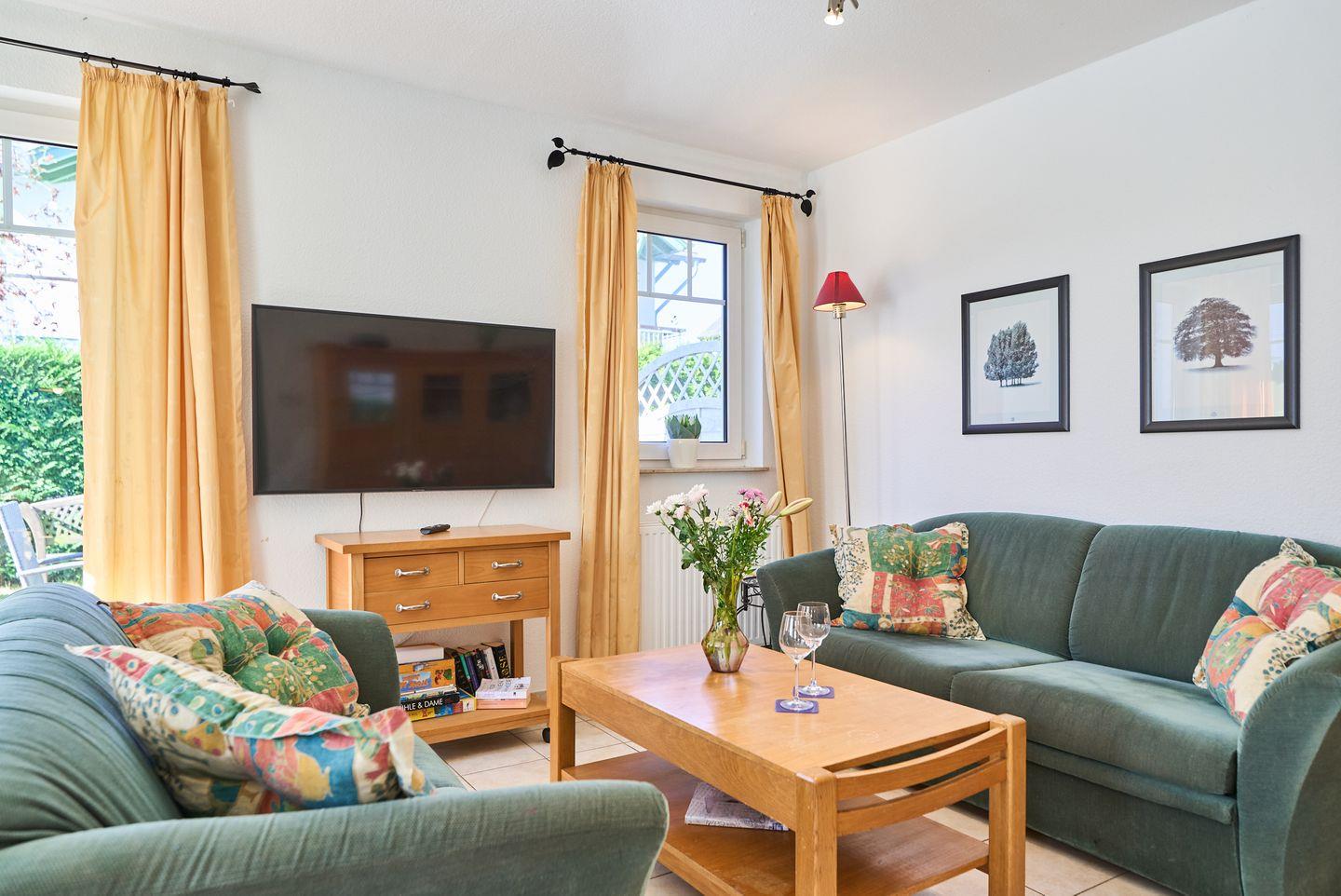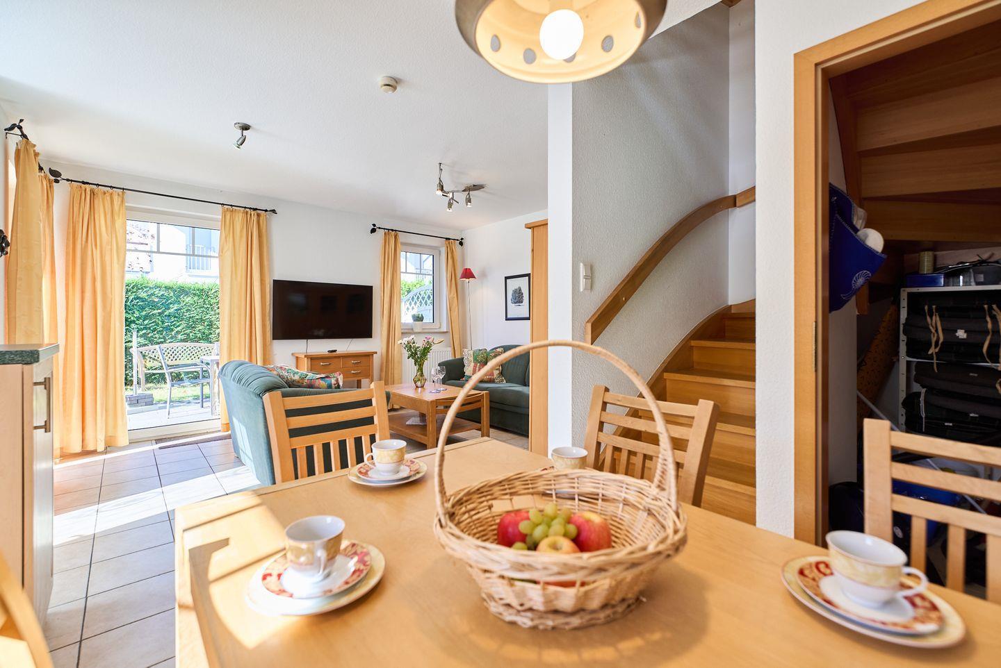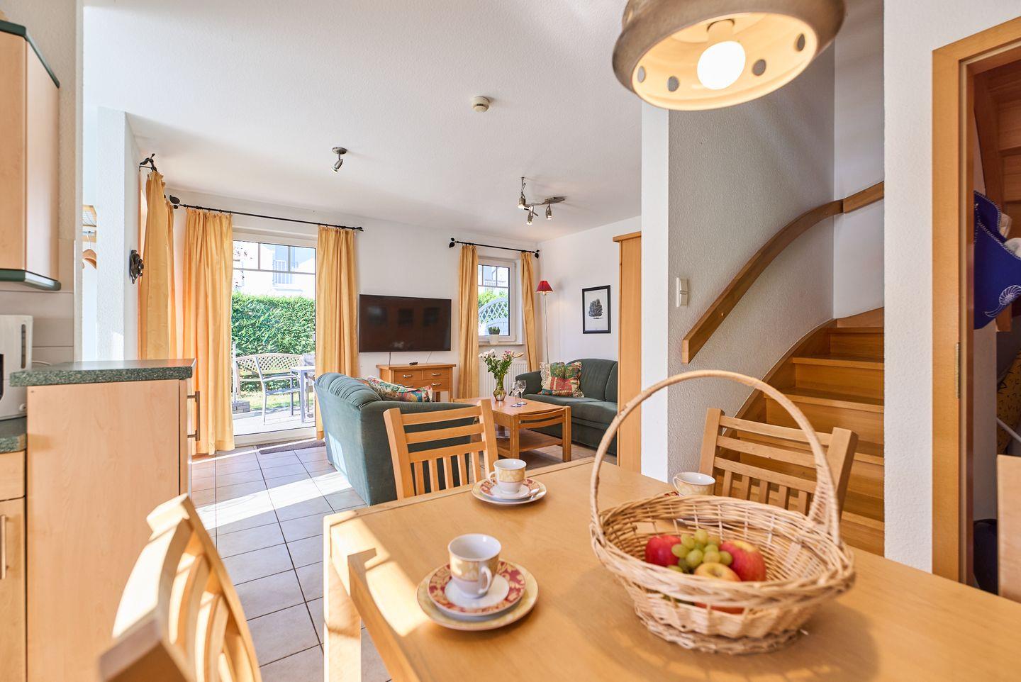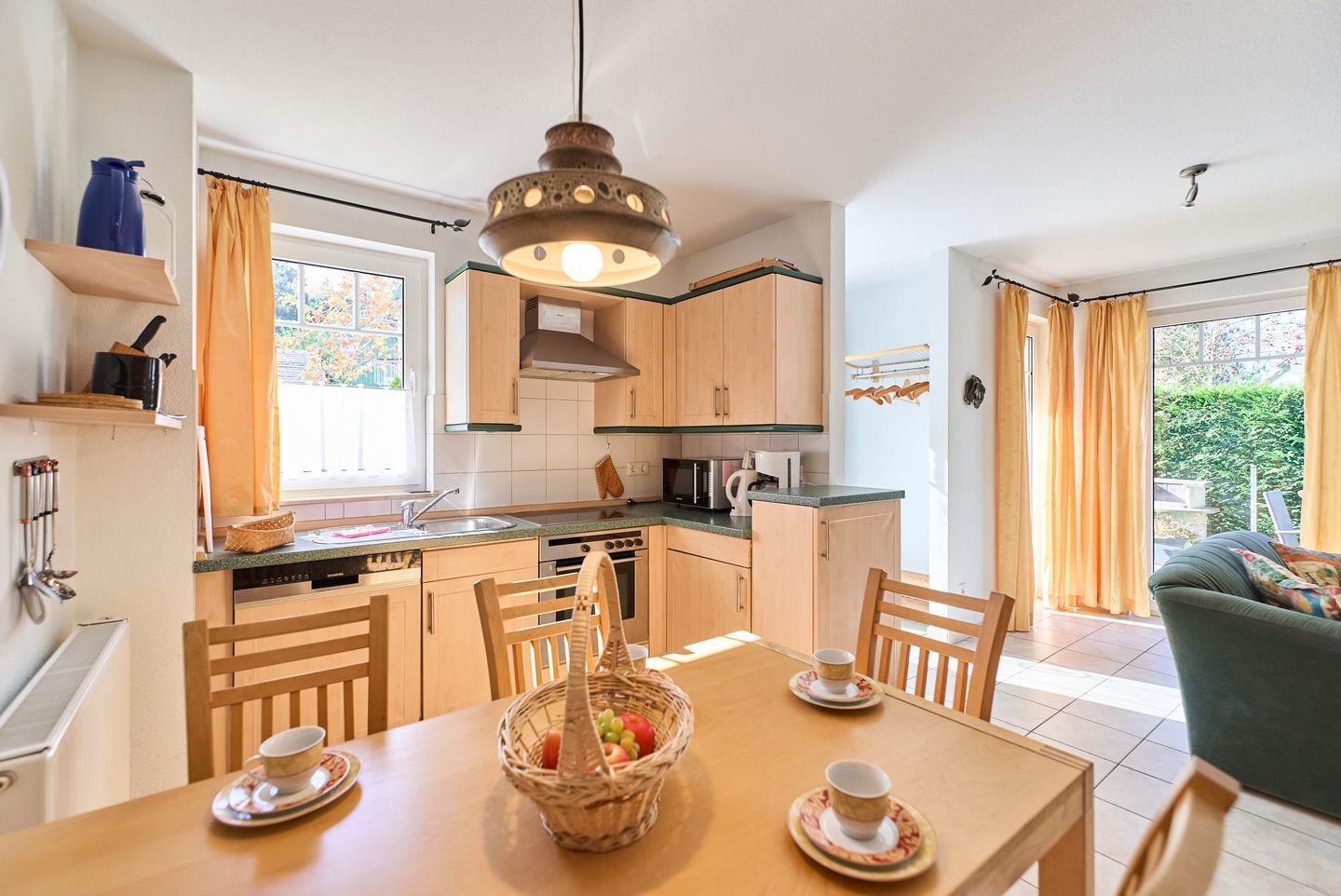 Die offene und lichtdurchflutete Gestaltung macht sofort gute Laune. Der Wohnbereich ist mit einem gemütlichen Sofa ausgestattet, das zum Entspannen nach einem erlebnisreichen Tag einlädt. Die moderne Küche ist voll ausgestattet mit hochwertigen Küchengeräten, einschließlich eines Cerankochfeldes, Backofen, Mikrowelle und einer Spülmaschine. Hier können Sie Ihre Lieblingsgerichte zubereiten und die gemeinsamen Mahlzeiten am großen Esstisch genießen. Ein weiteres Highlight ist der Zugang zu Ihrem eigenen Balkon und der Terrasse, auf der Sie die frische Seeluft und die ruhige Umgebung in vollen Zügen genießen können.