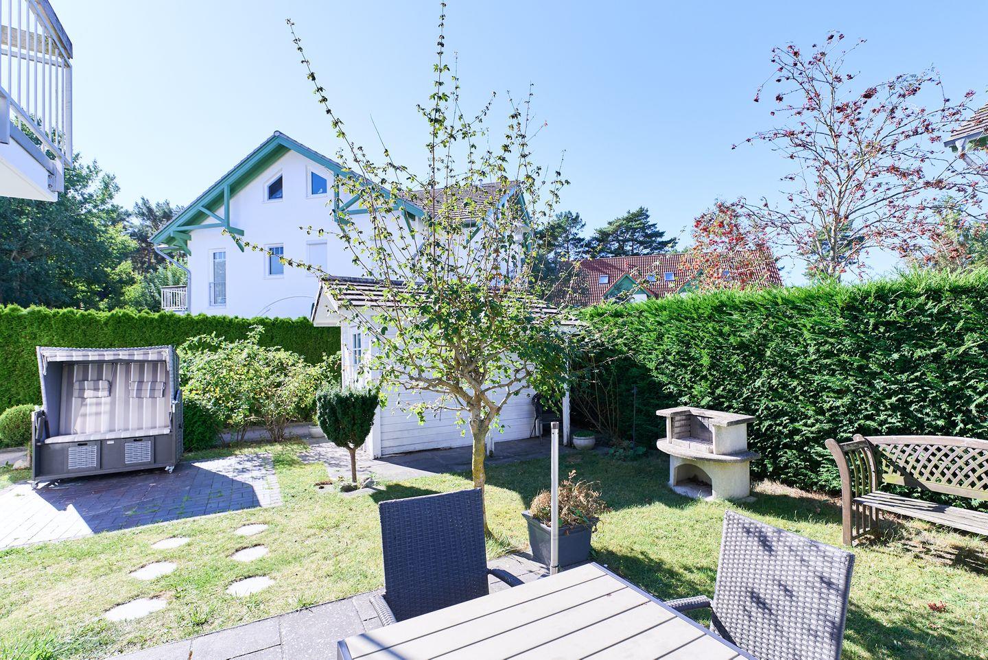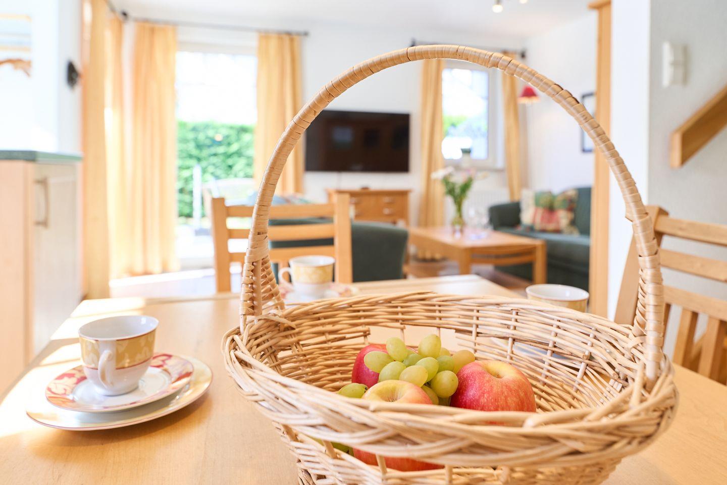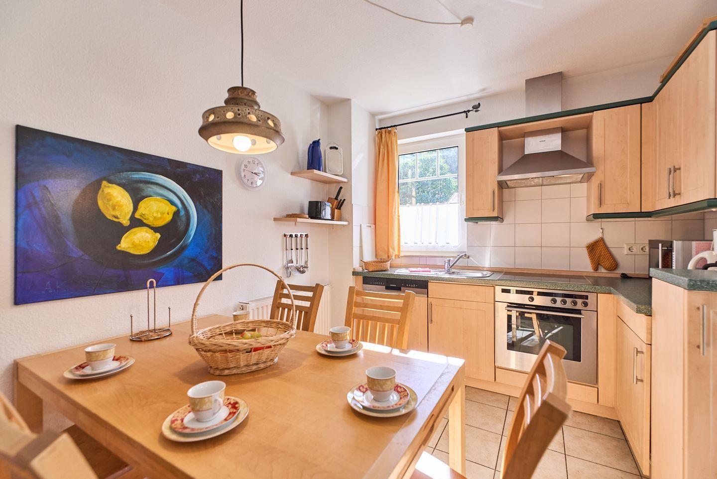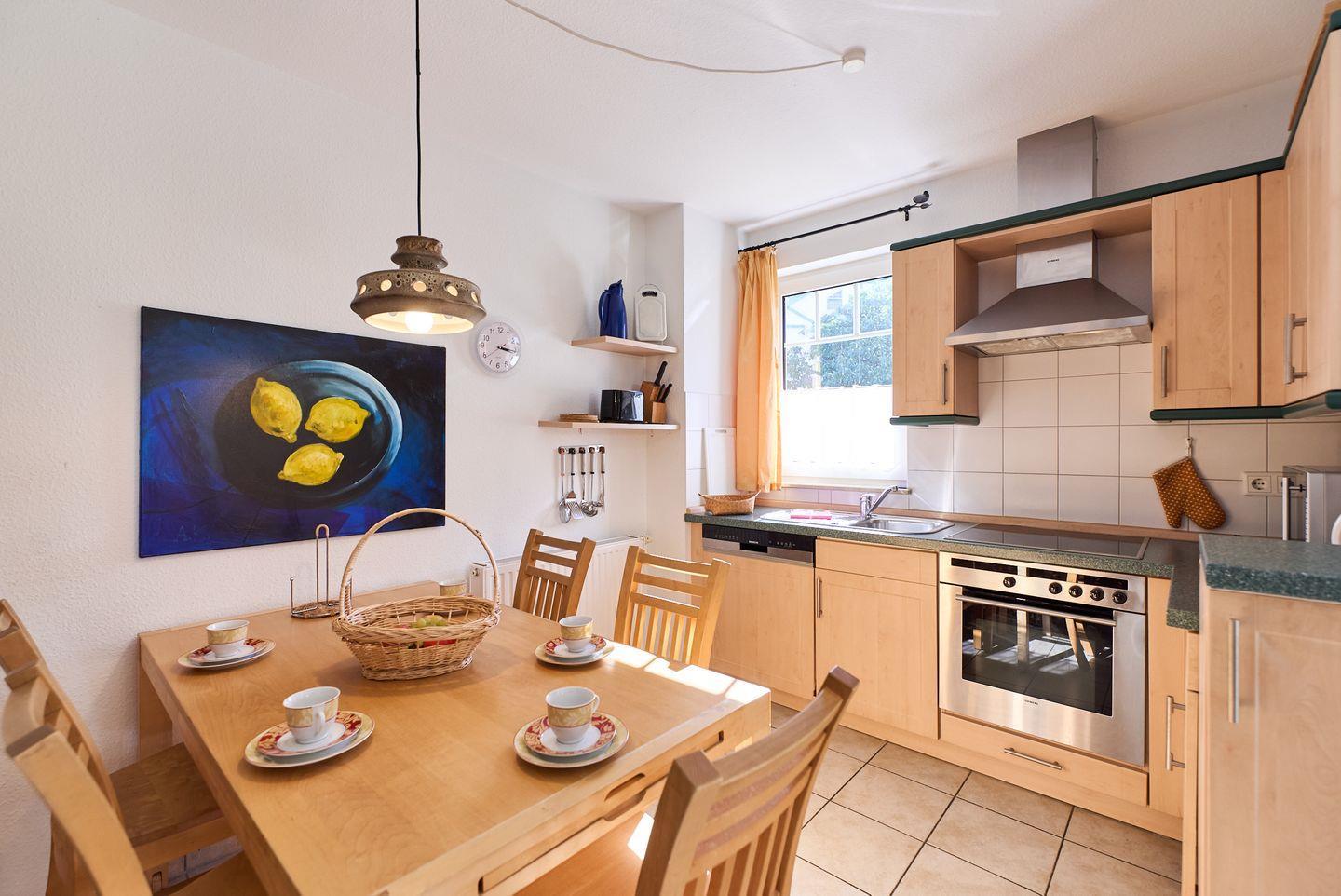 Die offene und lichtdurchflutete Gestaltung macht sofort gute Laune. Der Wohnbereich ist mit einem gemütlichen Sofa ausgestattet, das zum Entspannen nach einem erlebnisreichen Tag einlädt. Die moderne Küche ist voll ausgestattet mit hochwertigen Küchengeräten, einschließlich eines Cerankochfeldes, Backofen, Mikrowelle und einer Spülmaschine. Hier können Sie Ihre Lieblingsgerichte zubereiten und die gemeinsamen Mahlzeiten am großen Esstisch genießen. Ein weiteres Highlight ist der Zugang zu Ihrem eigenen Balkon und der Terrasse, auf der Sie die frische Seeluft und die ruhige Umgebung in vollen Zügen genießen können.