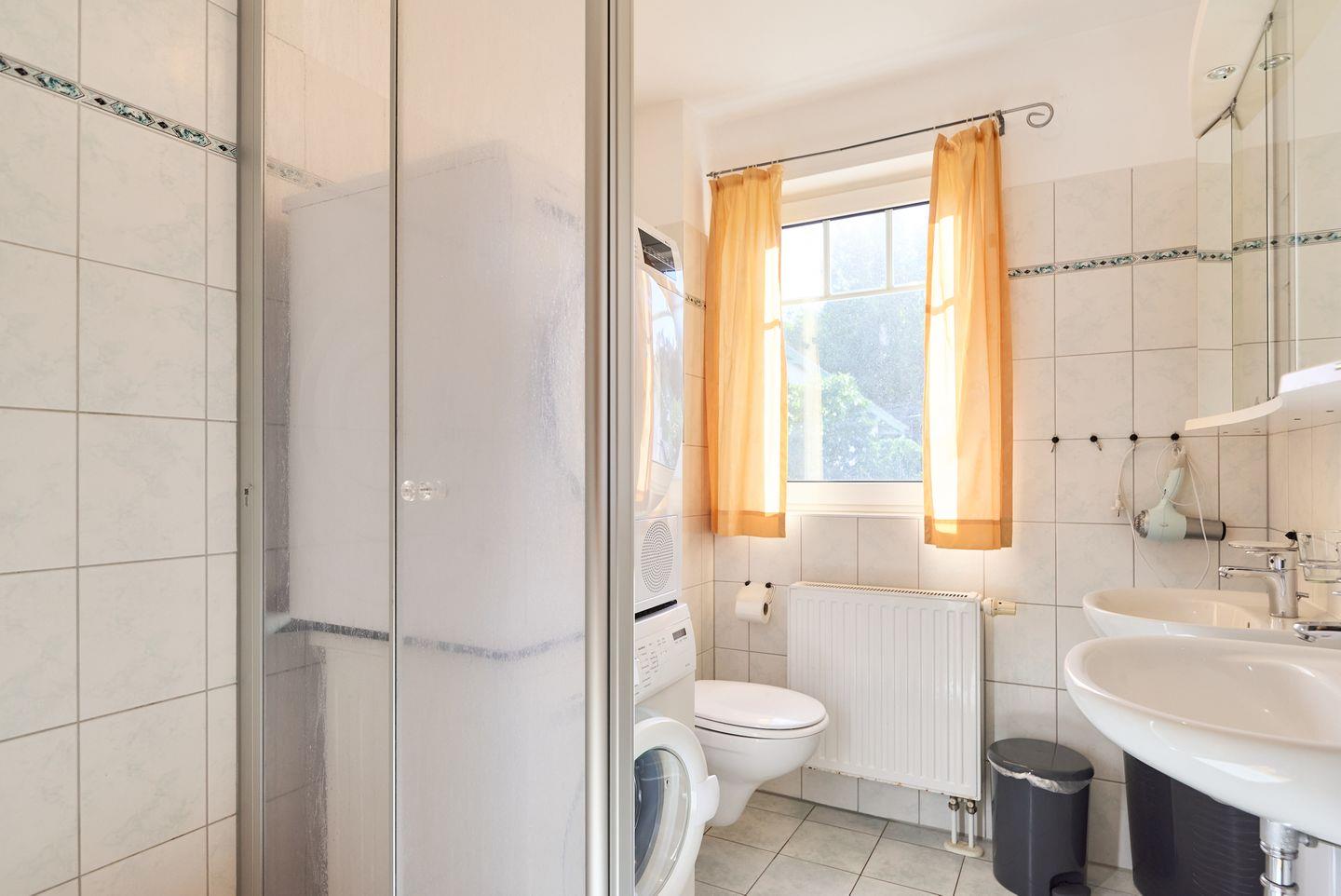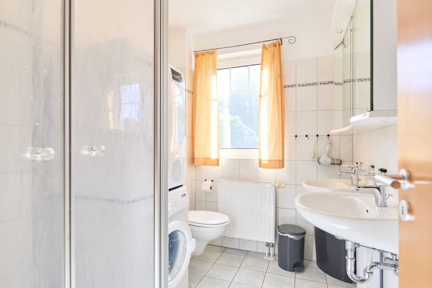 Das Badezimmer ist modern gestaltet und mit einer Dusche ausgestattet. Hier können Sie sich nach einem langen Tag am Strand erfrischen. Zudem sind praktische Annehmlichkeiten wie eine Waschmaschine und ein Trockner vorhanden, die Ihren Aufenthalt besonders komfortabel gestalten.