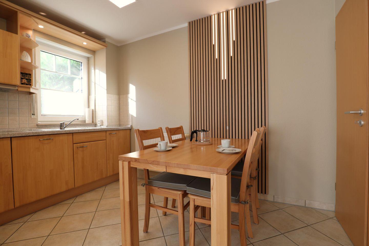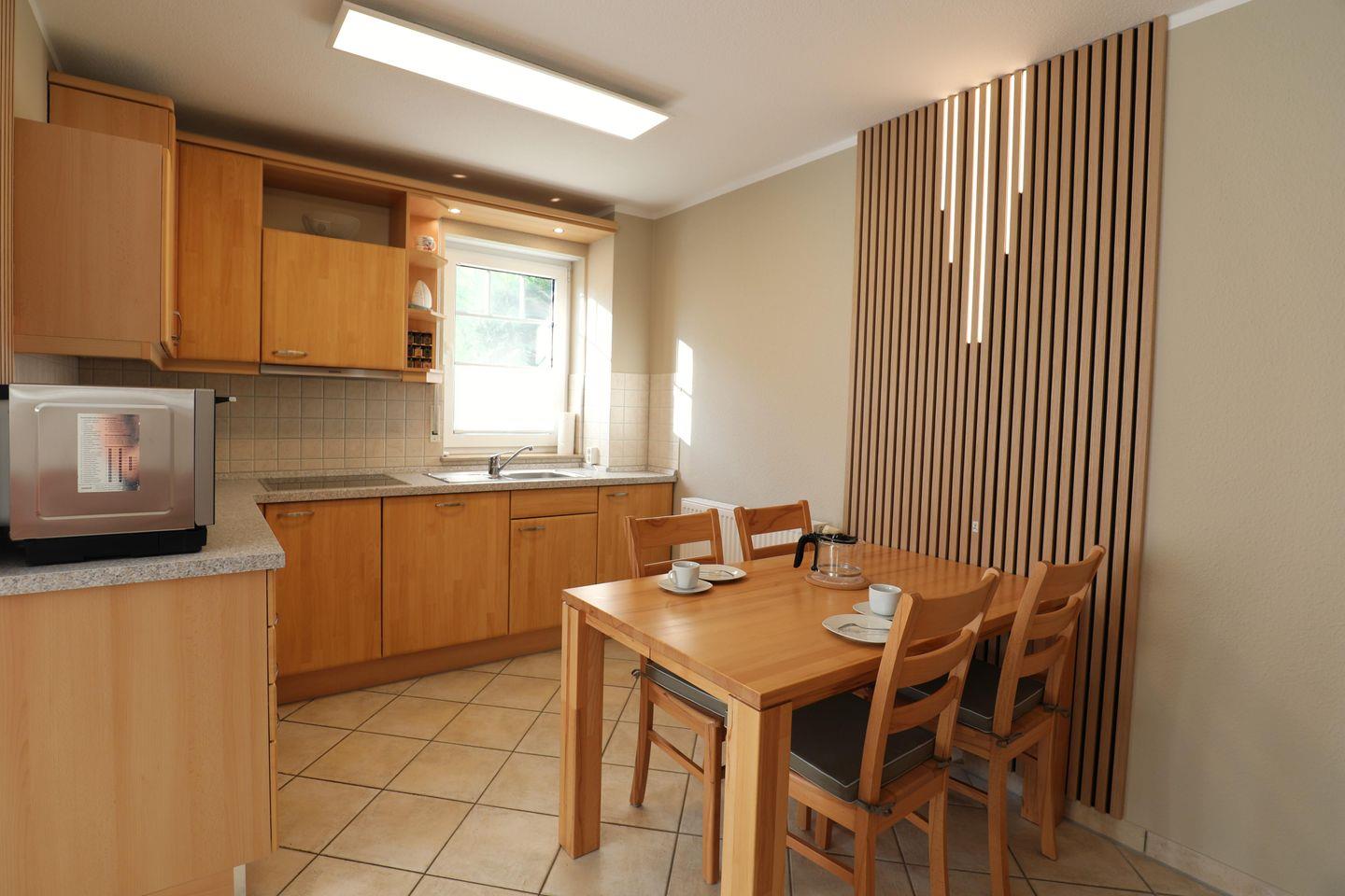 Die moderne Küche ist vollständig ausgestattet, inklusive Backofen, Induktionskochfeld, Geschirrspüler, Mikrowelle und einer Nespresso-Maschine für frisch gebrühten Kaffee am Morgen. Angrenzend befindet sich der Essbereich, ideal für gemeinsame Mahlzeiten.