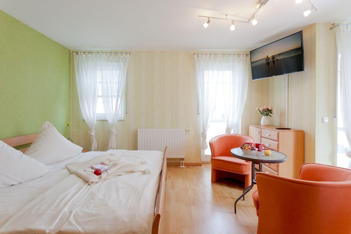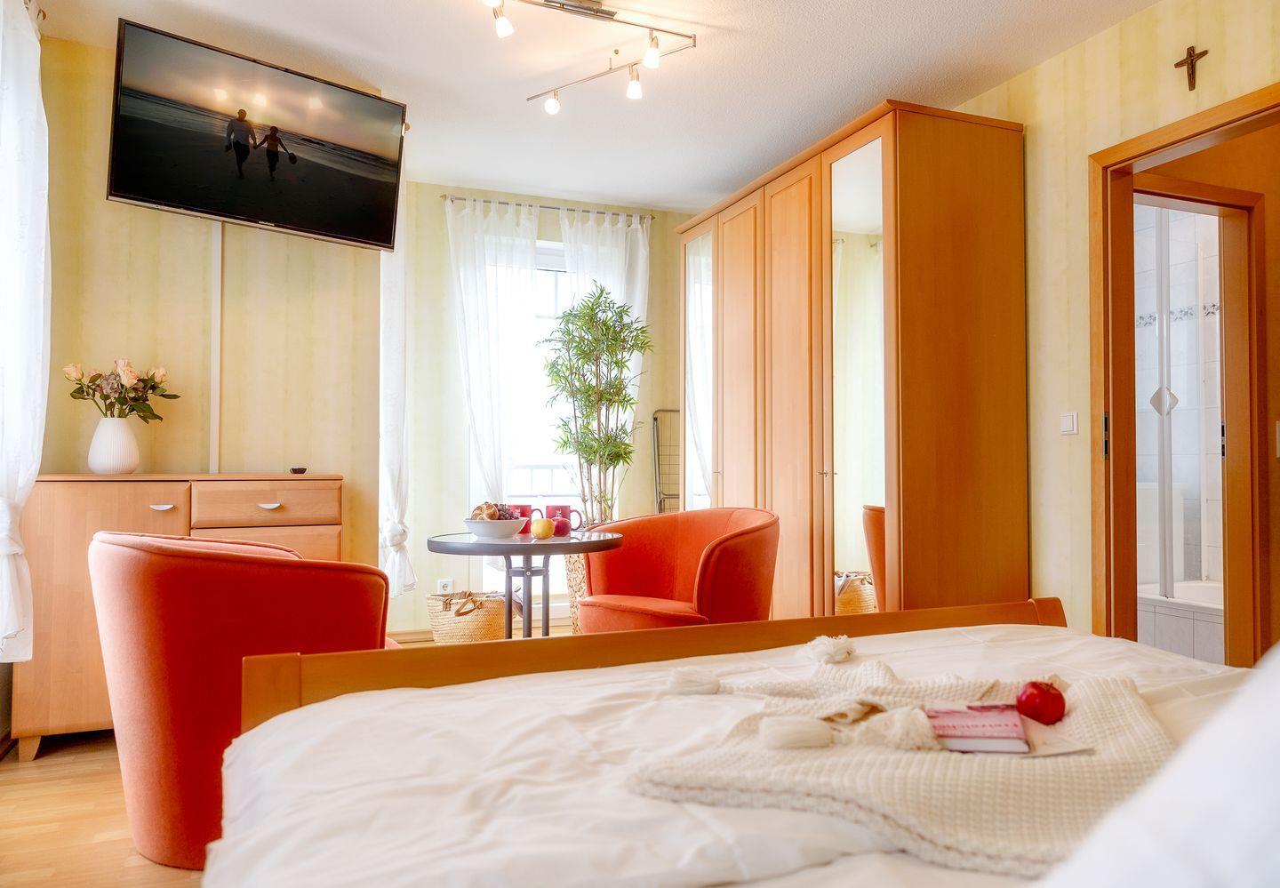 Bad mit Dusche (WaschTrockner),1 SZ mit Doppelbett u. TV, 1 SZ mit Doppelcouch u. TV,