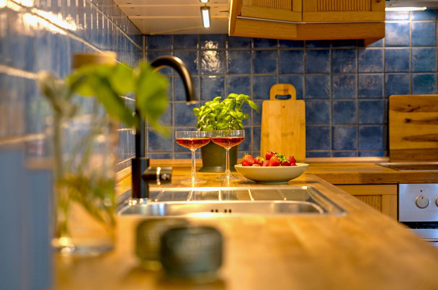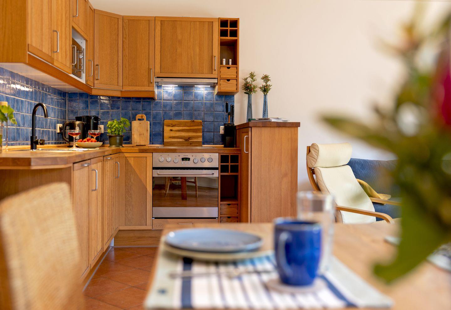 Die offen gestaltete Küche ist mit sämtlichen modernen Annehmlichkeiten ausgestattet, darunter ein Herd, Backofen, Kühlschrank mit Gefrierfach, Geschirrspüler und Mikrowelle. Ob Sie ein leichtes Frühstück oder ein mehrgängiges Abendessen zubereiten möchten, hier haben Sie alles, was Sie brauchen. Der angrenzende Essbereich mit einem Esstisch bietet genug Platz für gemeinsame Mahlzeiten und fröhliche Spieleabende mit Freunden oder der Familie.