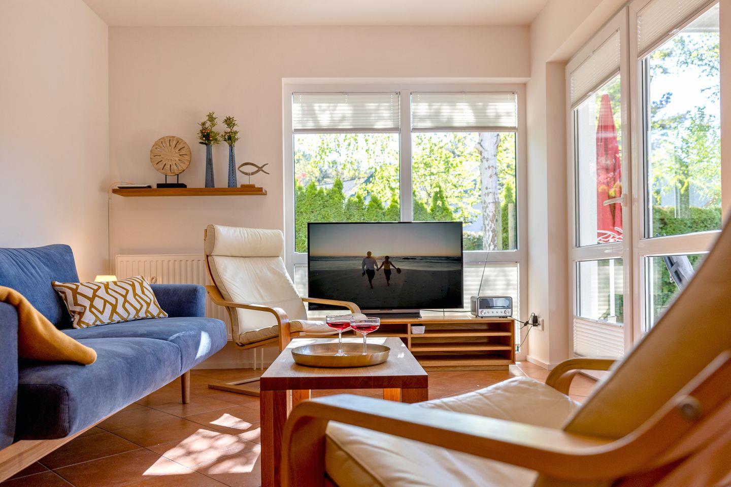 Die Ferienwohnung erstreckt sich über 60 m² und verfügt über zwei einladende Schlafzimmer, die Platz für bis zu vier Gäste bieten. Das helle und luftige Wohnzimmer mit Fliesenboden lädt zum Entspannen ein und ist mit einem gemütlichen Sofa, einem Sessel und einer Sofaecke ausgestattet. Hier können Sie nach einem aufregenden Tag an der Ostsee entspannen oder Ihre Lieblingssendungen auf dem 44 bis 55 Zoll großen Fernseher genießen. Für cineastische Abende sorgt der DVD-Spieler, während die HiFi-Anlage das Herz eines jeden Musikliebhabers höher schlagen lässt.