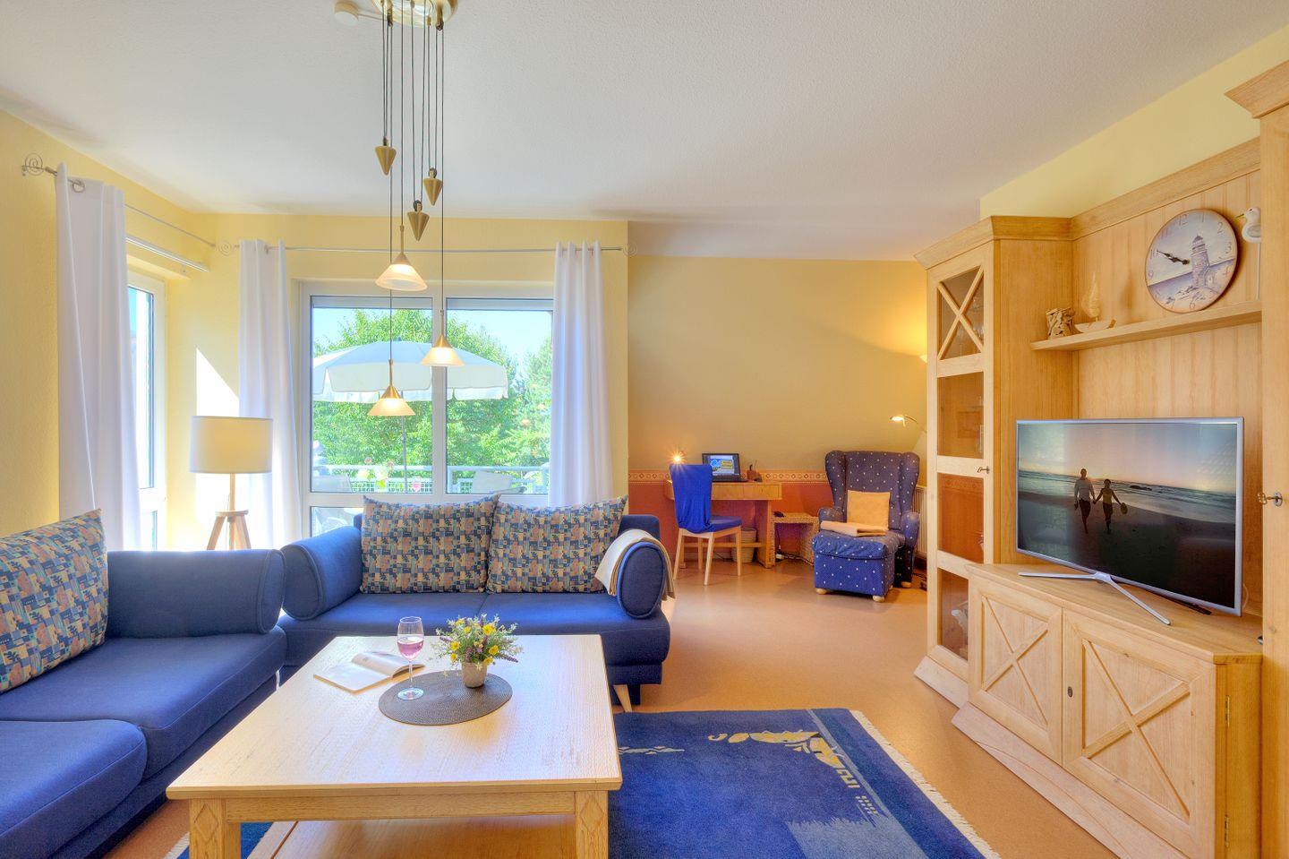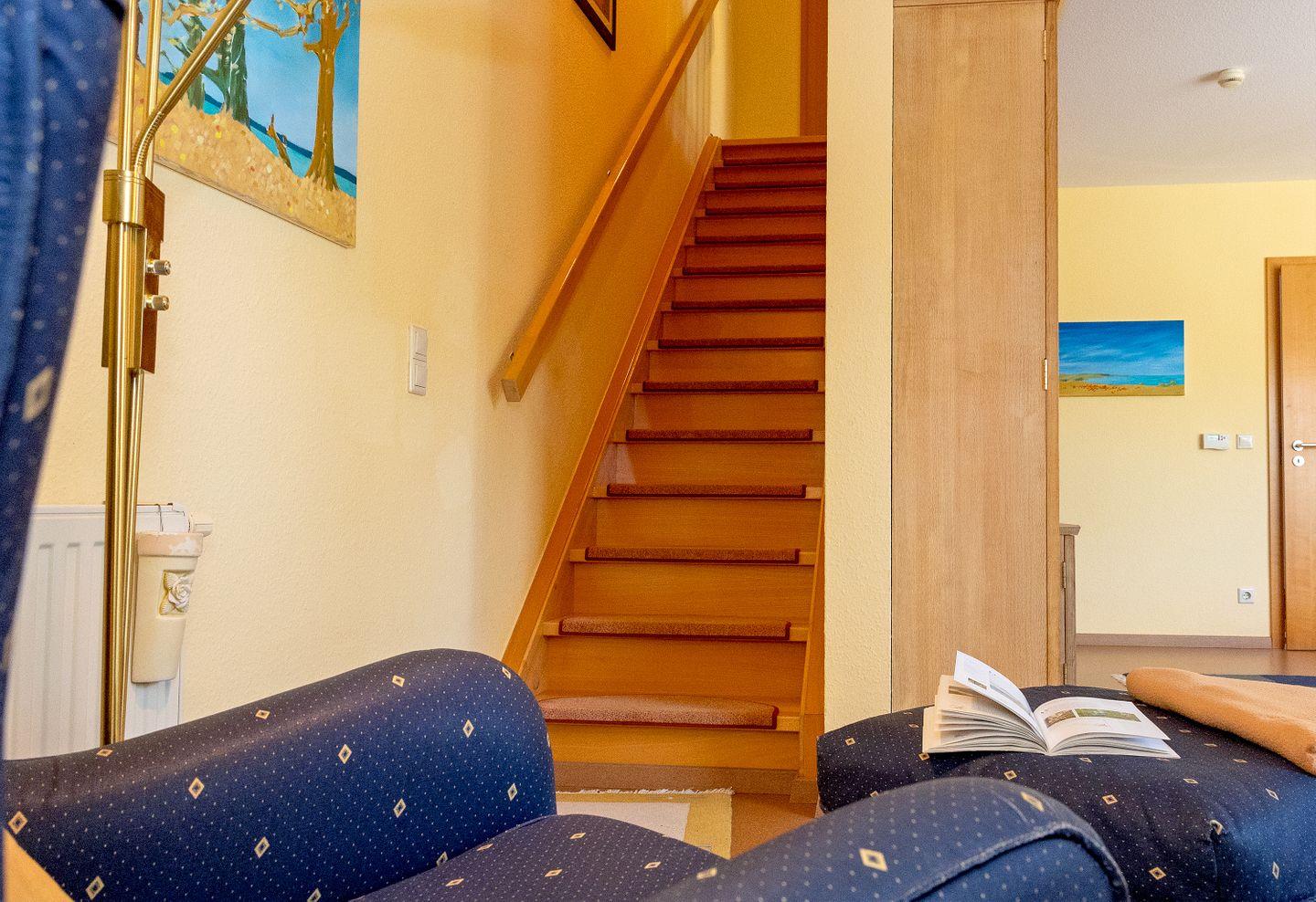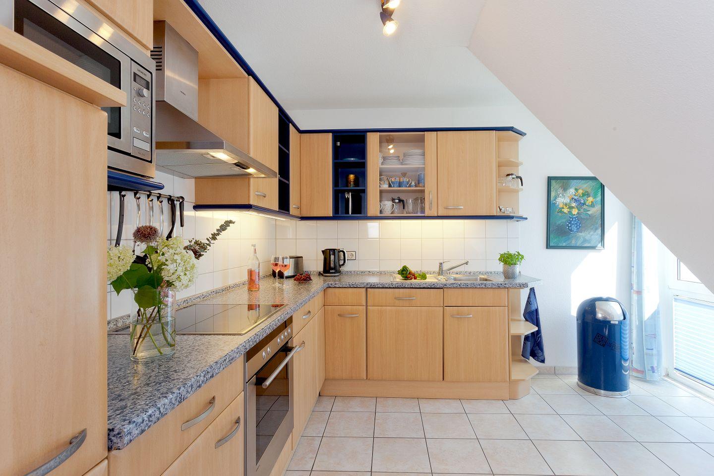 Die Wohnung erstreckt sich über zwei Etagen und überzeugt mit einer harmonischen Mischung aus modernem Komfort und gemütlichem Ambiente. Im lichtdurchfluteten Wohnzimmer finden Sie eine gemütliche Sofaecke, die perfekt für entspannte Abende nach einem aktiven Tag ist. Hier gibt es auch einen TV und eine HiFi-Anlage für Ihre Unterhaltung. Genießen Sie gemeinsame Stunden am Esstisch, der Platz für alle bietet, oder nutzen Sie die voll ausgestattete, geschlossene Küche mit modernen Geräten wie Ceranherd, Backofen, Mikrowelle und Spülmaschine – ideal für diejenigen, die auch im Urlaub gerne selbst kochen.