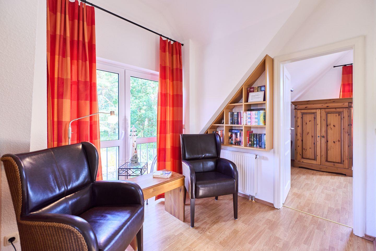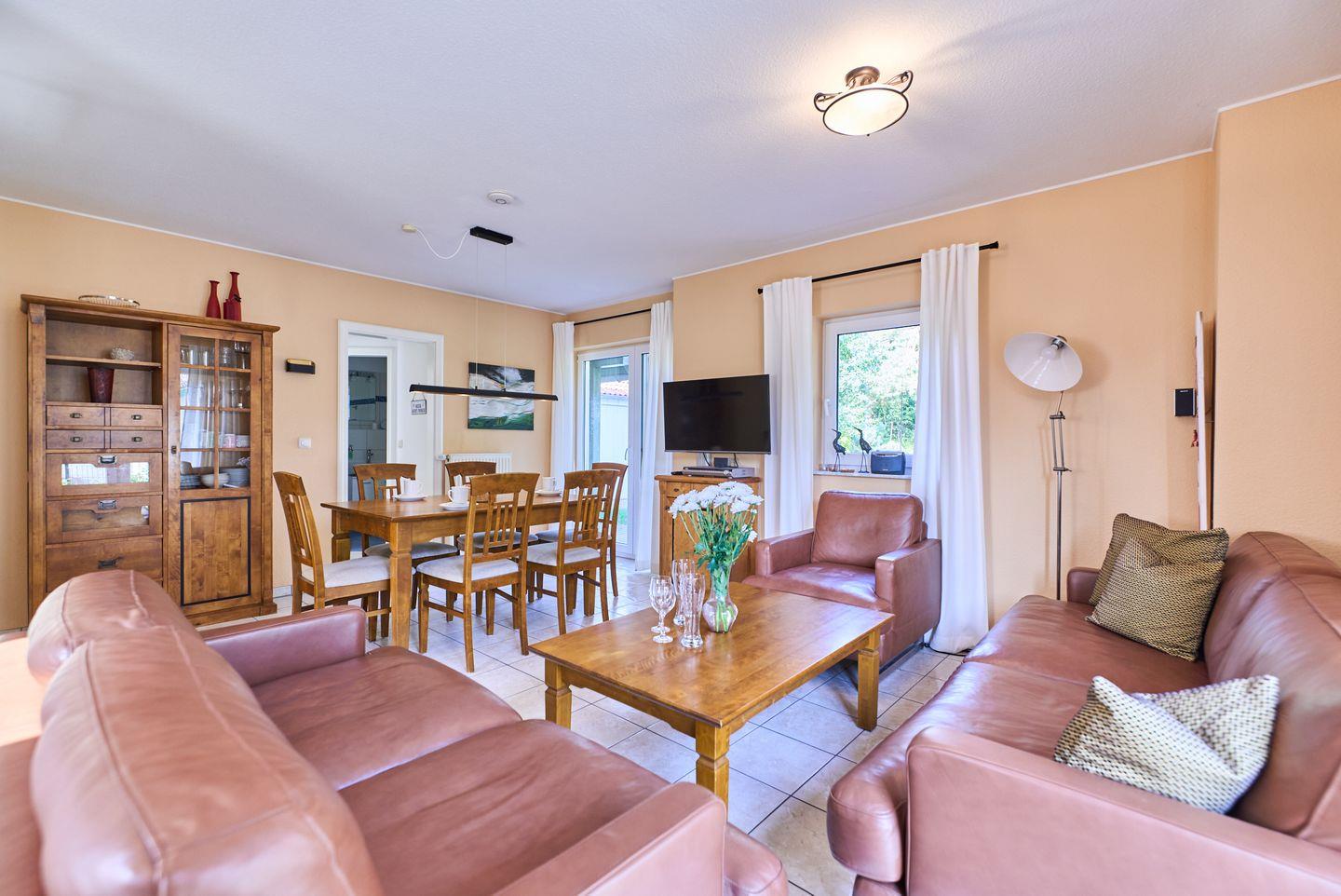 Der offene Wohnbereich mit hochwertigem Fliesenboden ist nicht nur ein Ort der Geselligkeit, sondern auch der zentrale Raum für entspannte Abende. Hier finden Sie ein bequemes Sofa, Sessel und einen Esstisch, der genug Platz für ein gemeinsames Essen oder Spieleabende mit Freunden oder der Familie bietet. Für Unterhaltung sorgt ein TV mit DVD- und CD-Player sowie eine kleine Bibliothek mit einer Auswahl an Büchern. Der WLAN-Zugang ermöglicht zudem bequemes Surfen und Streamen.