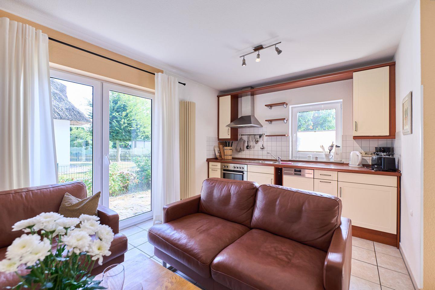 Die voll ausgestattete Küche bietet alles, was Sie für die Zubereitung köstlicher Mahlzeiten benötigen. Vom Cerankochfeld über den Backofen, Kühlschrank mit Gefrierfach bis hin zu praktischen Küchenutensilien wie Kaffeemaschine, Wasserkocher, Toaster und vieles mehr – hier bleiben keine Wünsche offen. Morgens können Sie Ihren Kaffee auf der sonnigen Terrasse genießen, die mit Gartenmöbeln ausgestattet ist und zu geselligen Grillabenden einlädt.