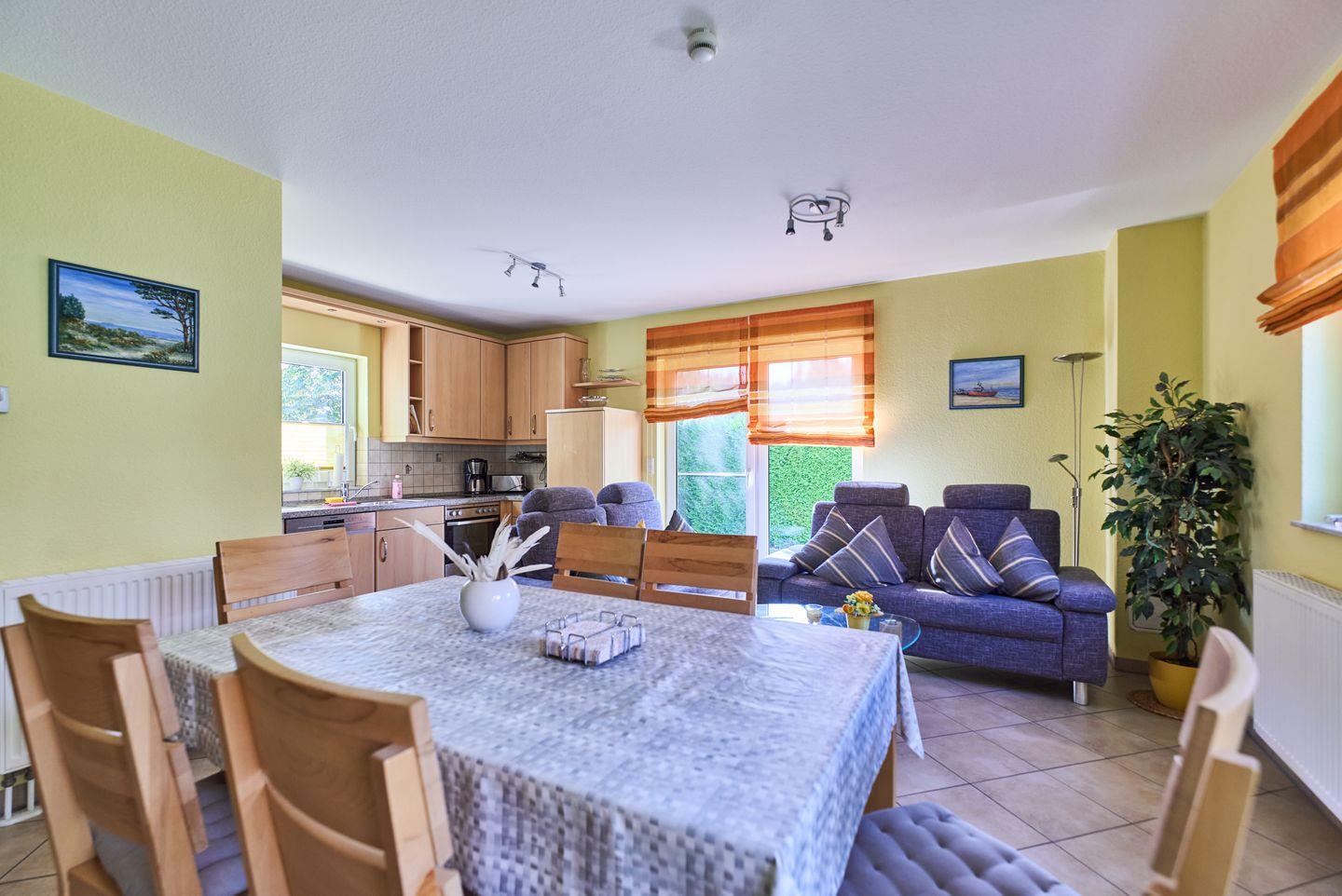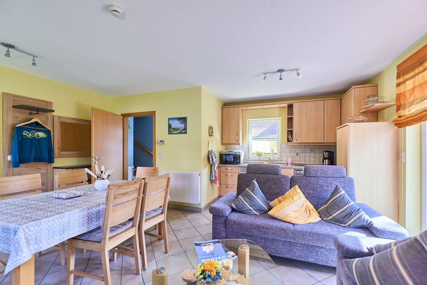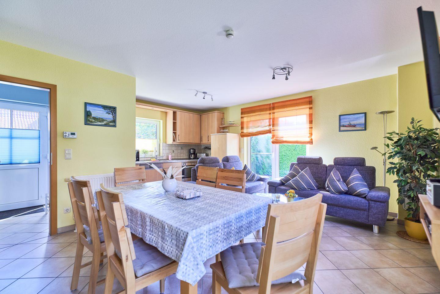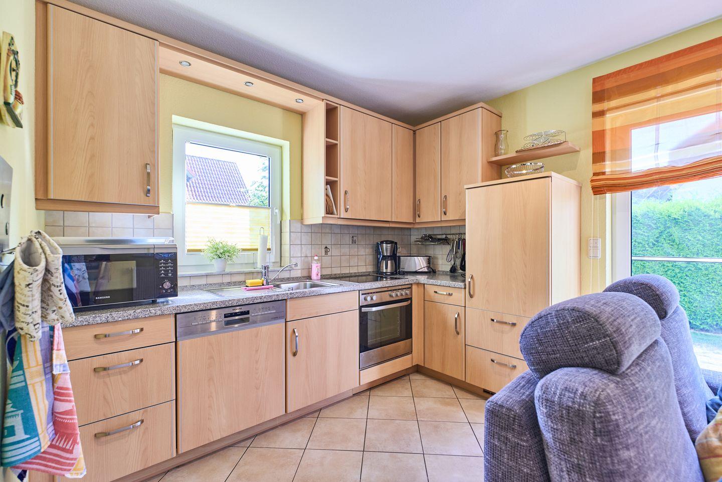 Die gut ausgestattete Küche verfügt über alles, was Sie zum Zubereiten Ihrer Lieblingsgerichte benötigen: einen Cerankochfeld, Backofen, Mikrowelle, Kühlschrank, und eine Spülmaschine. Genießen Sie Ihre Mahlzeiten am großen Esstisch oder auf der sonnigen Terrasse, wo Sie die frische Meeresbrise und die Idylle der Umgebung in vollen Zügen genießen können. Grillfans werden sich über den eigenen Grillplatz im Garten freuen – der perfekte Ort für gesellige Abende mit Familie und Freunden!