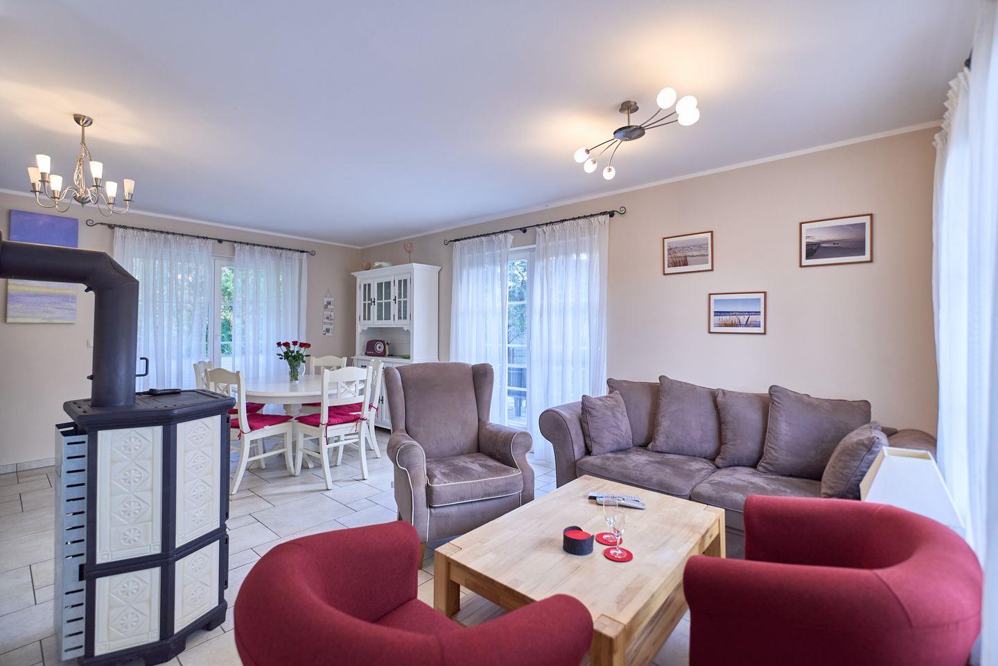 Das Haus beeindruckt durch ihre helle und freundliche Atmosphäre. Der offen gestaltete Wohnbereich ist mit einem gemütlichen Sofa ausgestattet und lädt dazu ein, entspannte Stunden mit einem guten Buch aus der hauseigenen Bücherei zu verbringen. Ein moderner Kamin sorgt an kühleren Abenden für wohlige Wärme und ein heimeliges Ambiente. Hier können Sie die Abende mit Ihren Liebsten bei einem Glas Wein oder einem gut duftenden Essen in der voll ausgestatteten Küche genießen. Diese verfügt über alle Annehmlichkeiten wie einen Kühlschrank, eine Spülmaschine und eine Waschmaschine, die Ihren Aufenthalt so angenehm wie möglich gestalten. Zusätzliche Extras wie Bettwäsche und Handtücher (diese sind NICHT in Ihrer Buchung enthalten),können über unsere Gäste-App dazu gebucht werden.