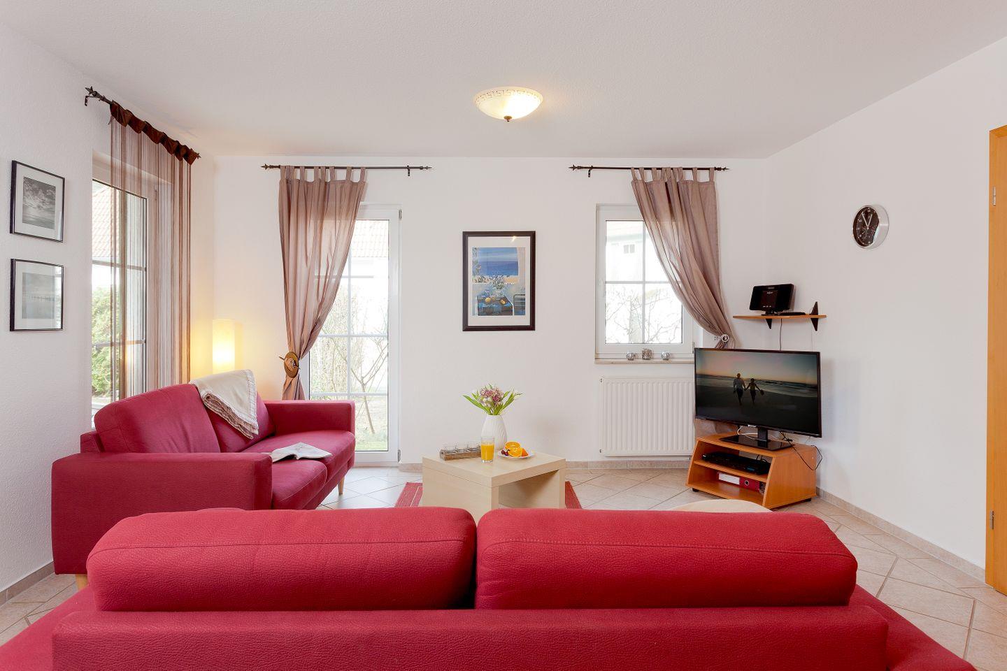 Die Ferienwohnung ist kinderfreundlich und verfügt über zwei behagliche Schlafzimmer, die mit modernen Fliesen ausgestattet sind und eine entspannende Atmosphäre bieten. Der offene Wohn- und Essbereich lädt zum Verweilen und Genießen ein: Hier können Sie auf dem komfortablen Sofa entspannen, einen Film auf dem 35-44 Zoll großen Fernseher mit Satellitenanschluss schauen oder eine schöne Zeit mit Ihrer Familie am Esstisch verbringen. Für die musikalischen Genussmomente sorgen zusätzlich ein CD- und ein DVD-Spieler sowie ein Radio.