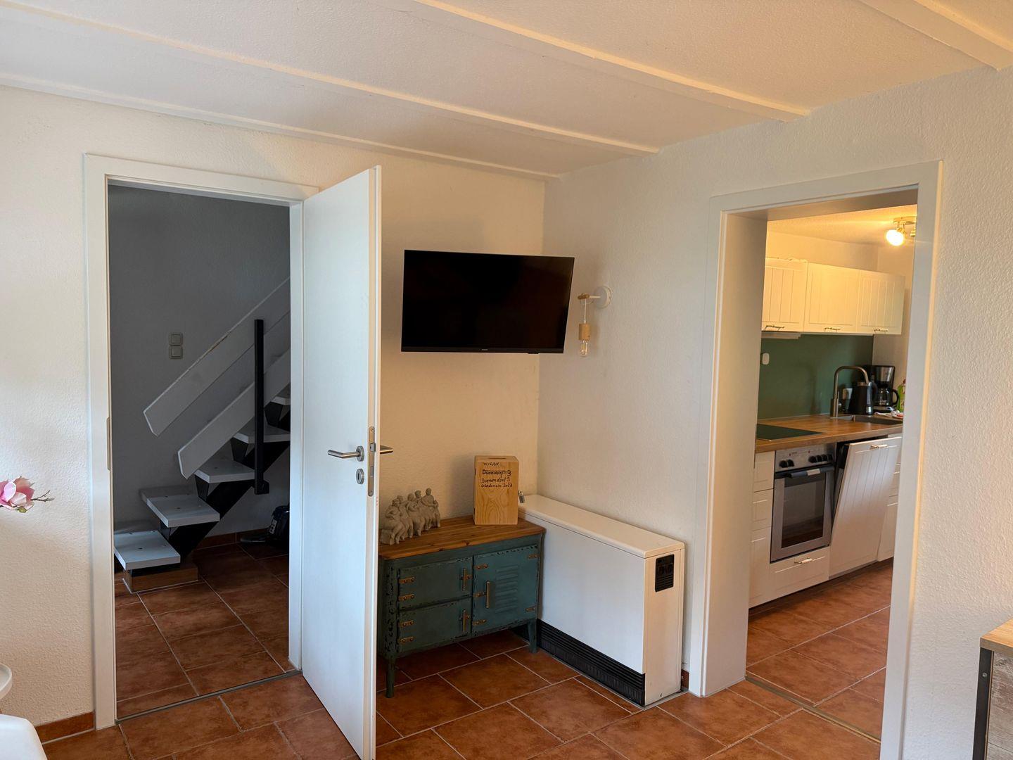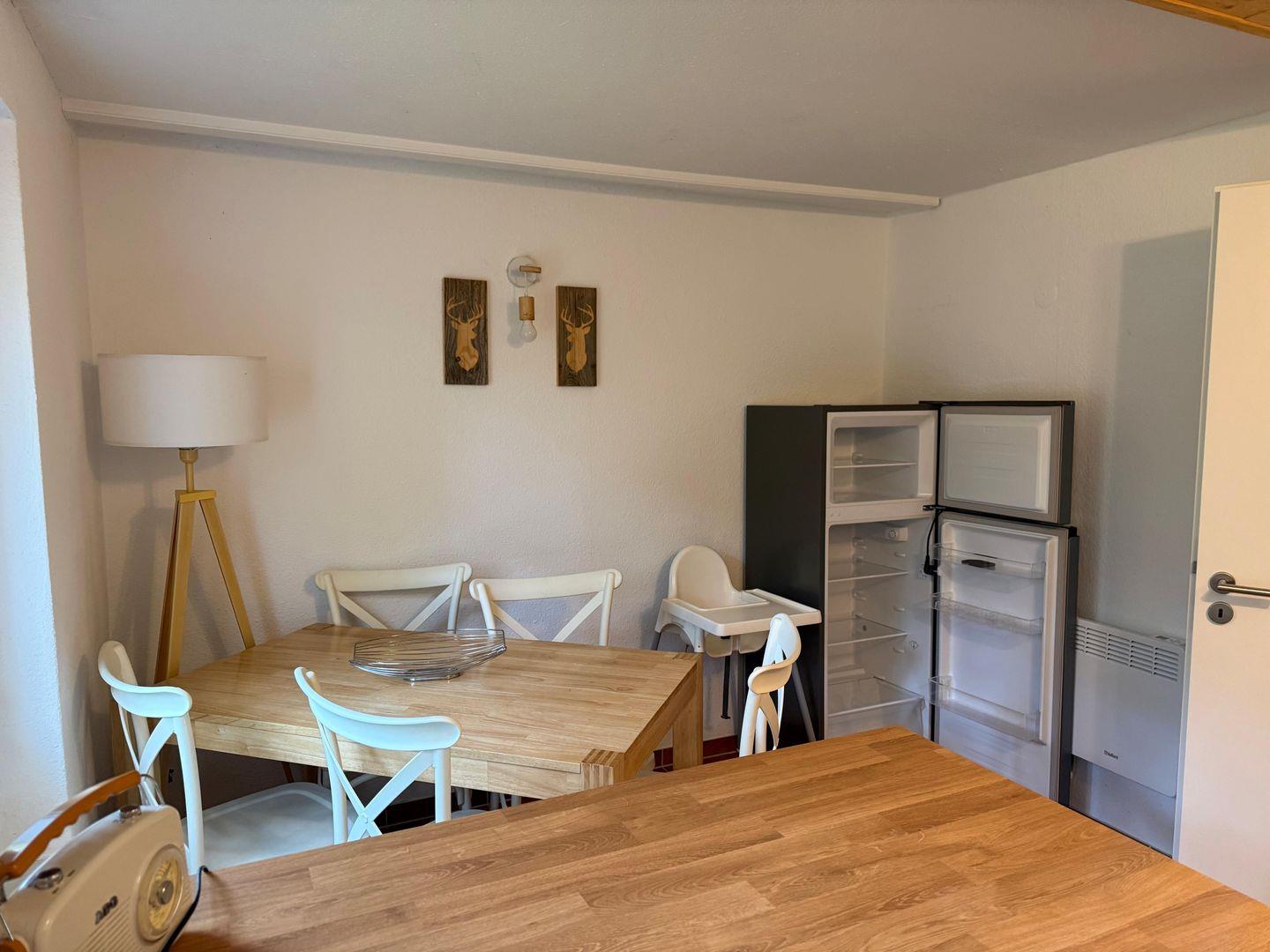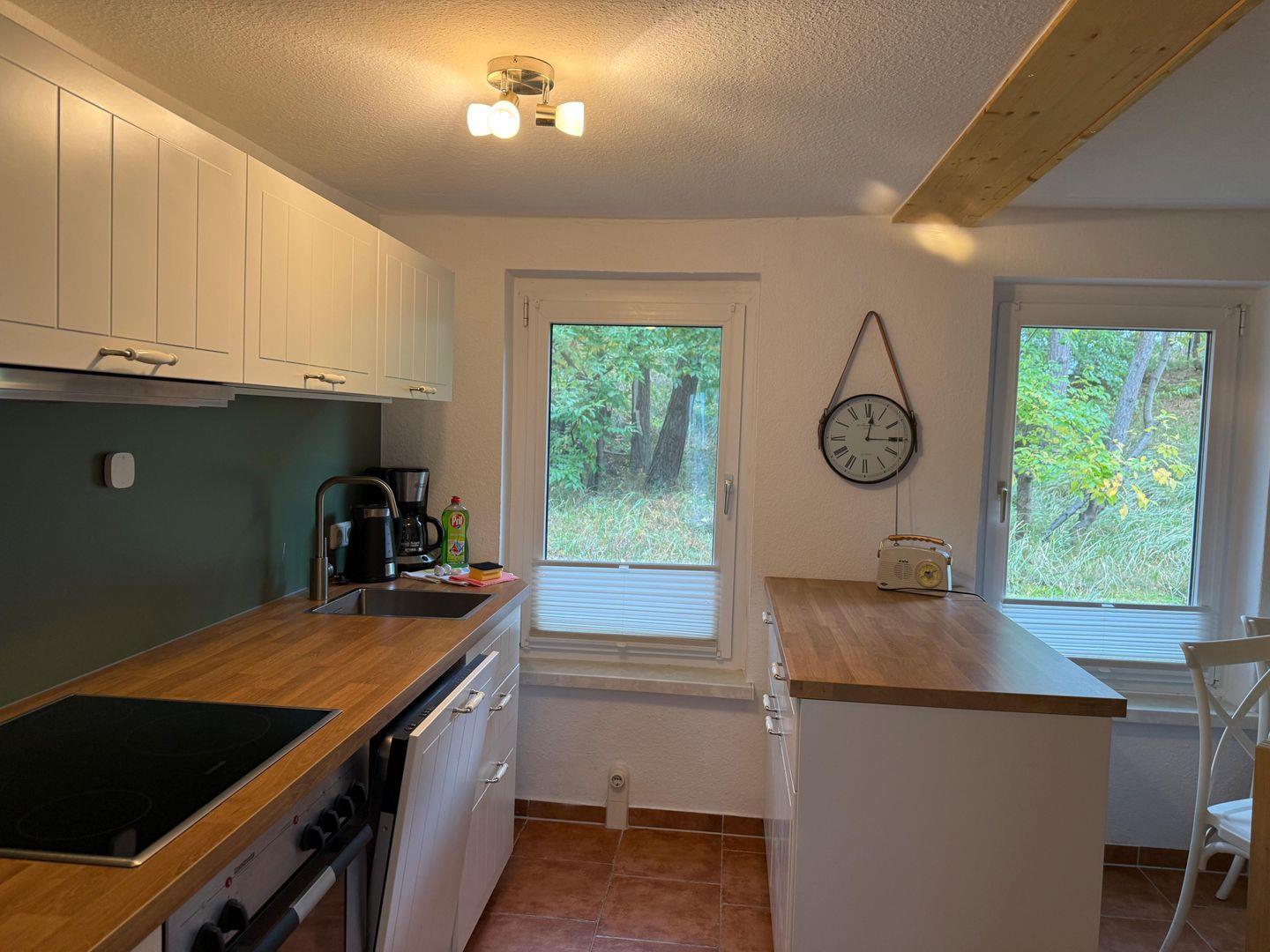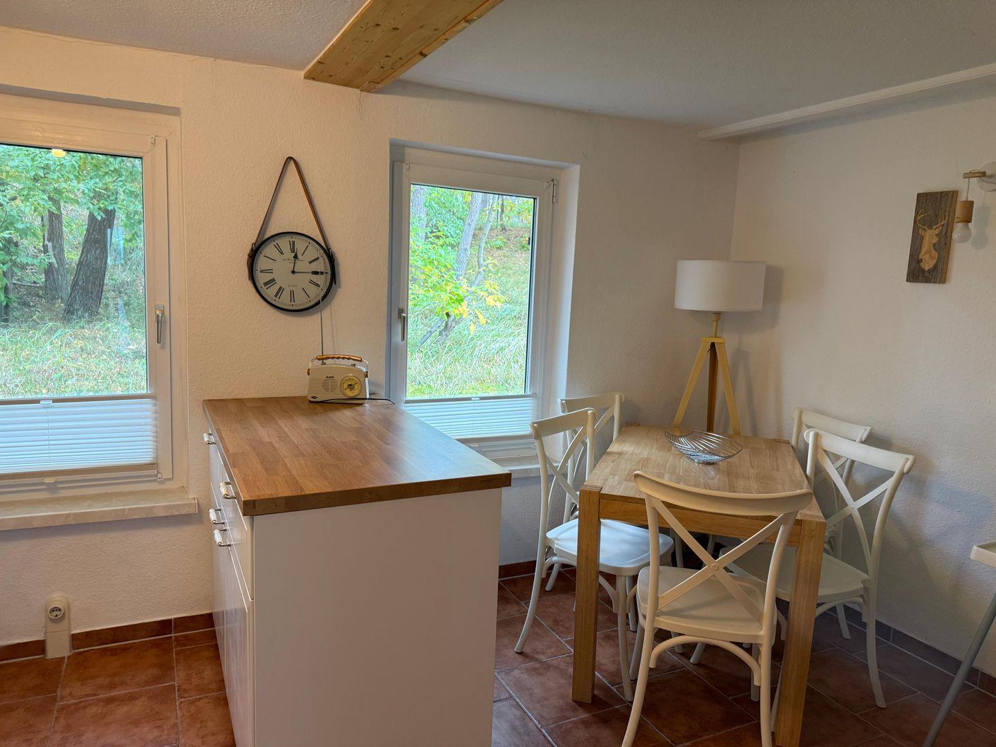 Im Inneren erwartet Sie ein freundlicher Wohnbereich, der mit seiner hellen Gestaltung und den liebevollen Details sofort ein Gefühl von Geborgenheit vermittelt. Die Küche ist vollständig ausgestattet und macht es leicht, regionale Köstlichkeiten zuzubereiten oder gemeinsam zu kochen. Große Fenster lassen viel Licht herein und schaffen eine Verbindung zur Natur, die gleich vor der Haustür beginnt.