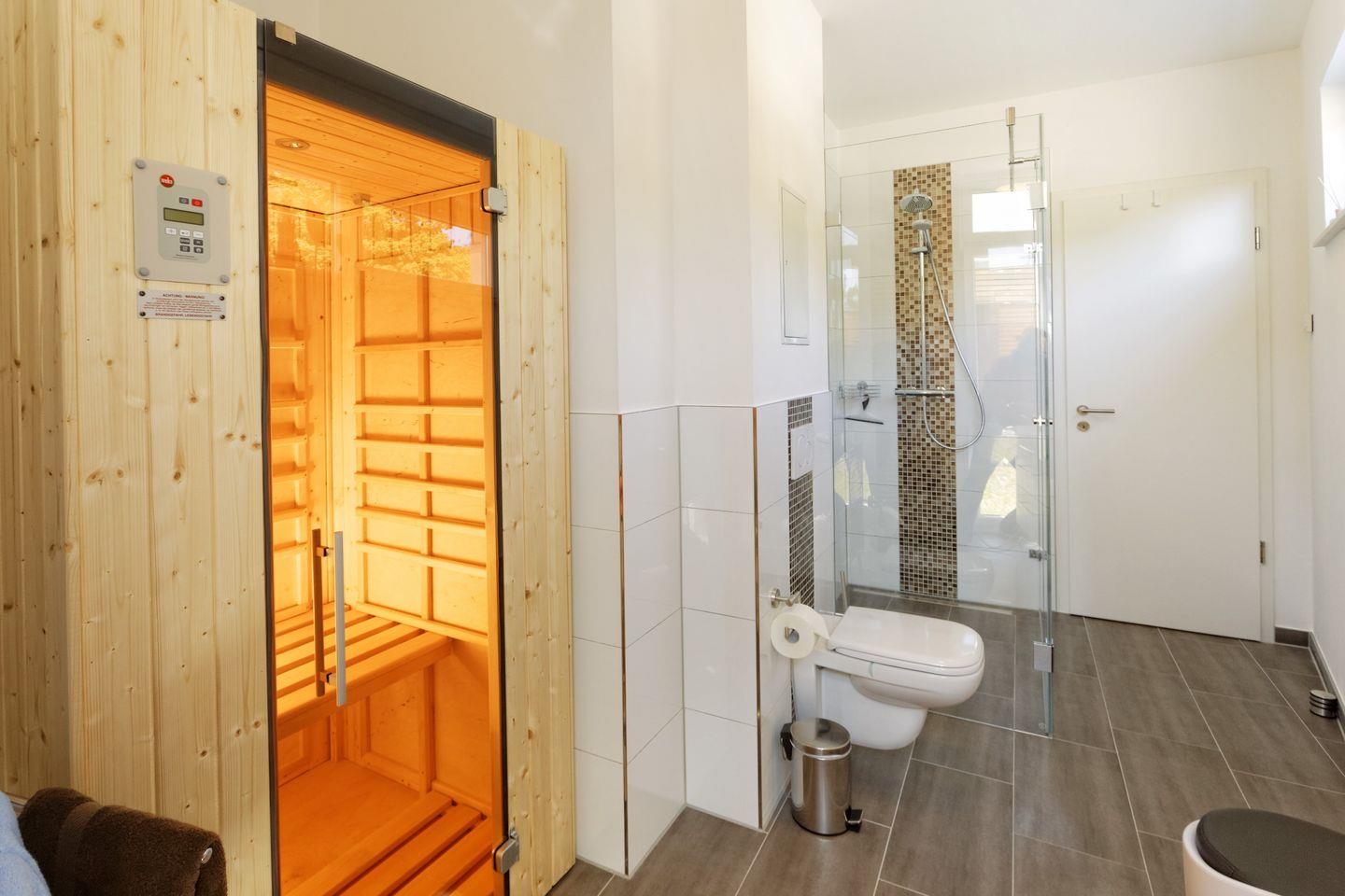 Beide Schlafzimmer beinhalten jeweils ein modernes Boxspring-Doppelbett (1,80 x 2,00 m), Kleiderschrank und Verdunklung. Eines der Schlafzimmer verfügt überdies über einen eigenen SMART-TV (48 Zoll). Im Badezimmer mit Tageslicht befinden sich Fußbodenheizung, Handtuchwärmer, eine ebenerdige Dusche, WC, Waschtisch, Kosmetikspiegel, Föhn sowie Waschmaschine. Das Highlight hier ist die Infrarotsauna (Wärmekabine), in derer sanften Wärme ihr Entspannung findet.