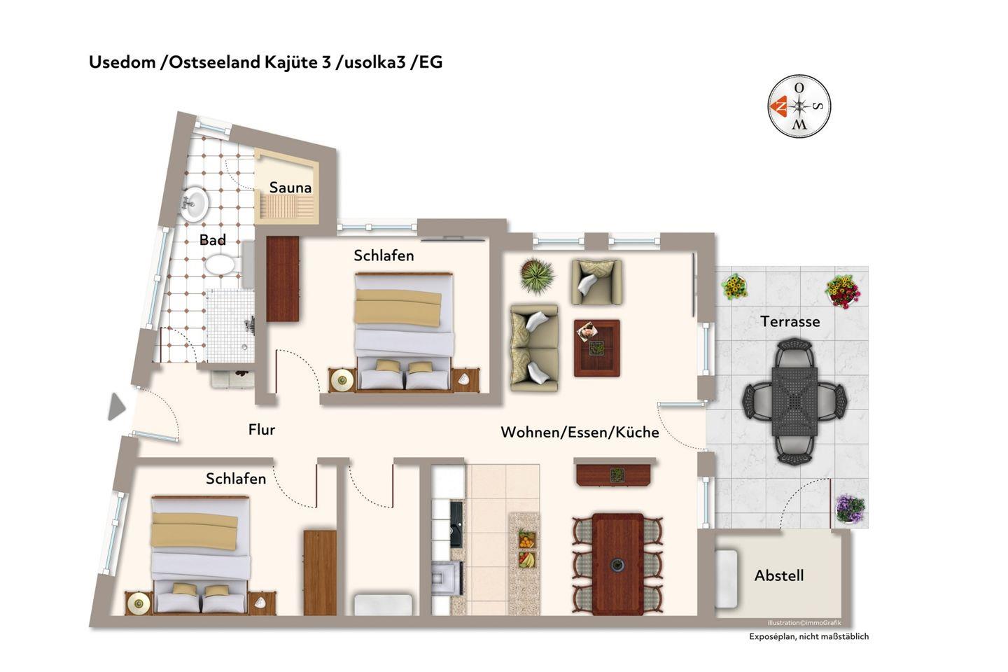 Das 80 m² große 3-Zimmer-Apartment mit Terrasse in Südlage ist für bis zu 4 Personen geeignet und liegt nur ca. 600 Meter zum Strand. Euer hochwertiges Urlaubsdomizil verfügt über ein Badezimmer mit Infrarotsauna und zwei separate Schlafzimmer. Nur wenige Schritte und ihr befindet euch am kilometerlangen Sandstrand der Insel.