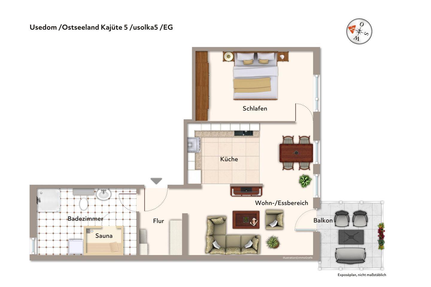 Das moderne, hell geschnittene 2-Zimmer-Apartment mit südlich ausgerichtetem Balkon bietet mit 63 qm Platz für bis zu 3 Personen und liegt nur etwa 600 Meter vom Strand entfernt. Euer komfortables Urlaubsdomizil umfasst ein separates Schlafzimmer sowie ein Badezimmer mit wohltuender Infrarotsauna. Nach wenigen Minuten Fußweg erreicht ihr den weitläufigen Sandstrand und genießt das besondere Inselflair Usedoms.