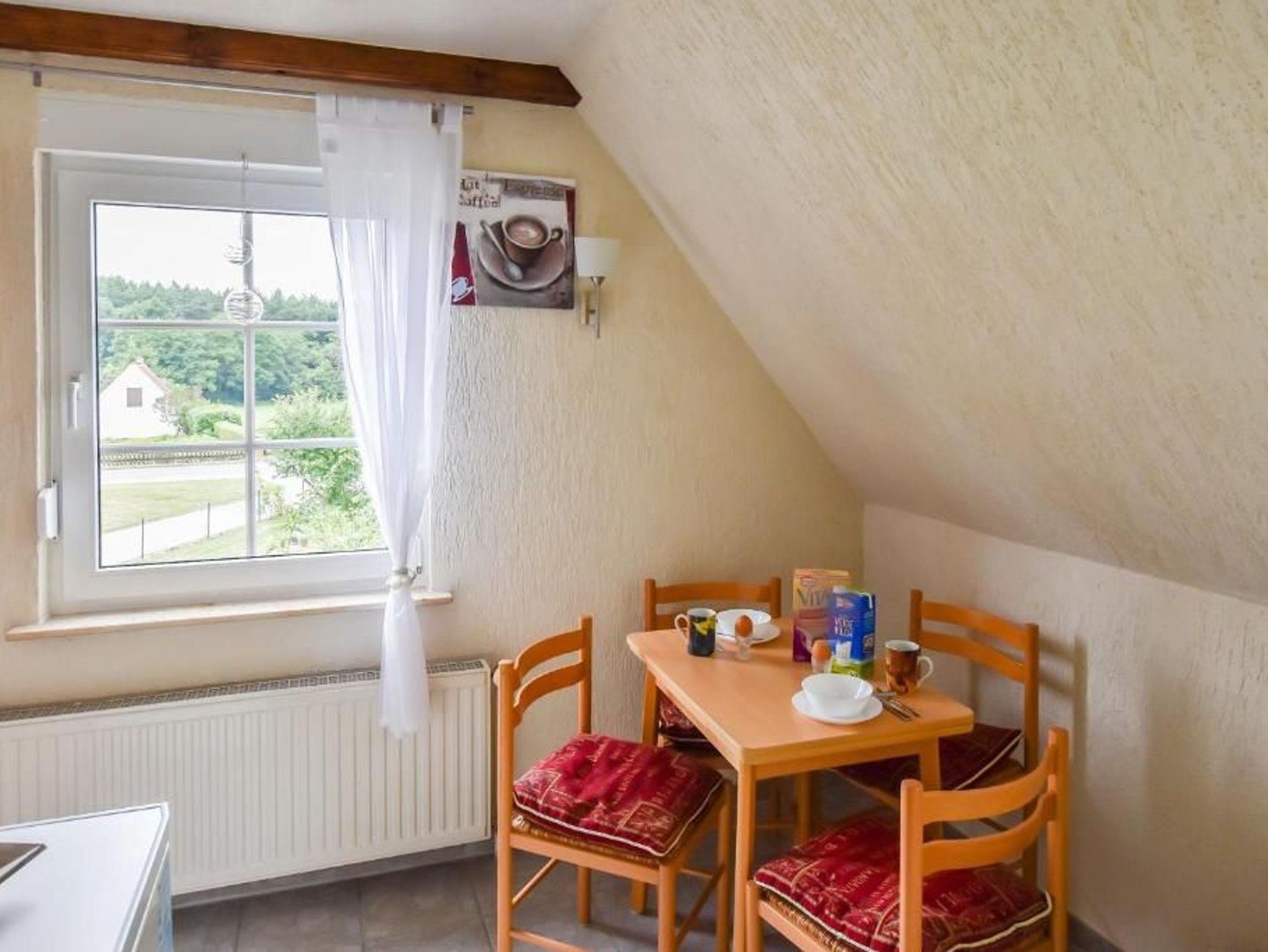 Unsere Nichtraucher-Ferienwohnung (70 qm, 1 Wohn- und 2 Schlafzimmer, separate Küche, Dusche/WC, Terrasse, max. 5 Erw., WLAN) liegt ruhig und naturnah im Herzen der Insel Rügen in dem kleinen Ort Karnitz.