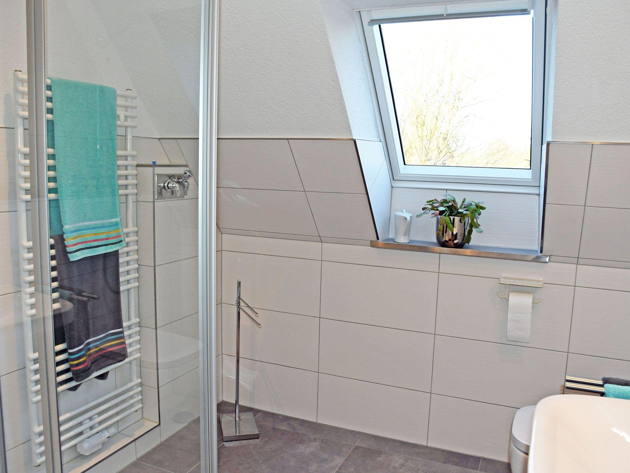Das Bad ist mit Dusche, WC und Waschtisch ausgestattet und verfügt über Tageslicht.