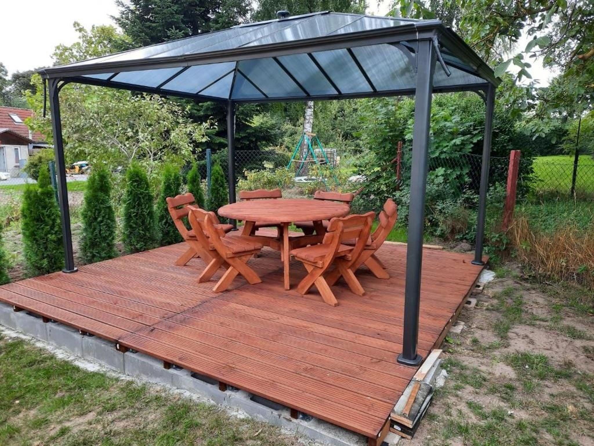 Zu dieser Ferienwohnung gehört auch ein überdachter Sonnenplatz mit Gartenmöbel der den Gästen im Garten zur Verfügung steht.
