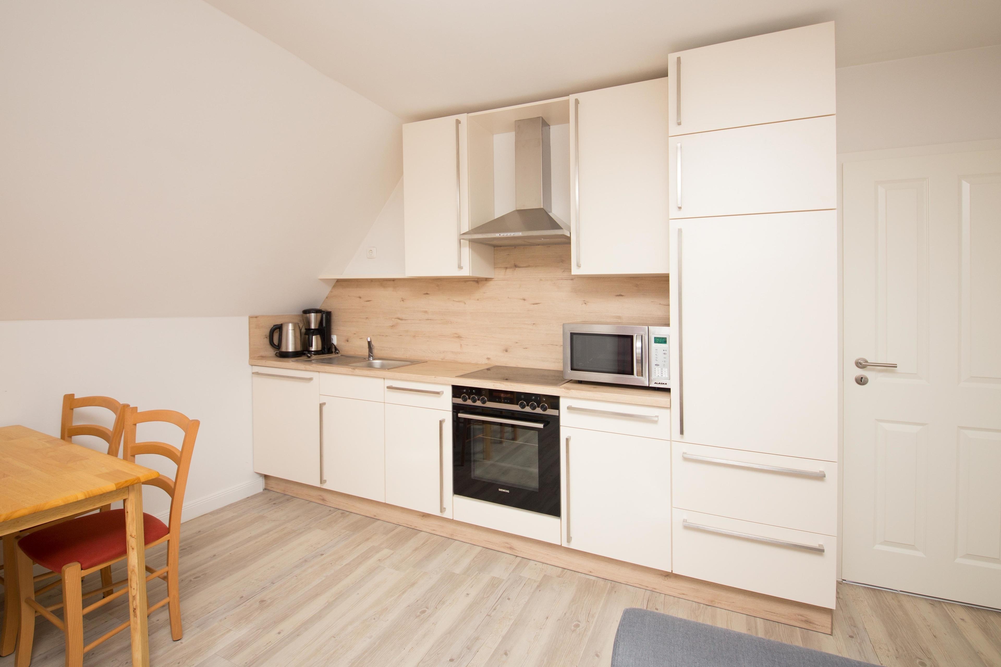 Wohnbereich: 1 Tisch mit 4 Stühlen, 1 Couchtisch, 1 Couch mit Schlaffunktion in der Größe eines französischen Bettes Küche und Haushaltsgegenstände: 1 Küchenzeile mit 4-Plattenherd, Spüle, Backofen, Dunstabzugshaube mit Umluft, Kühlschrank mit Gefrierfach, Kaffeemaschine, Wasserkocher, Toaster, Kochtöpfe und Bratpfanne, Besteck und Gläser für 4 Personen