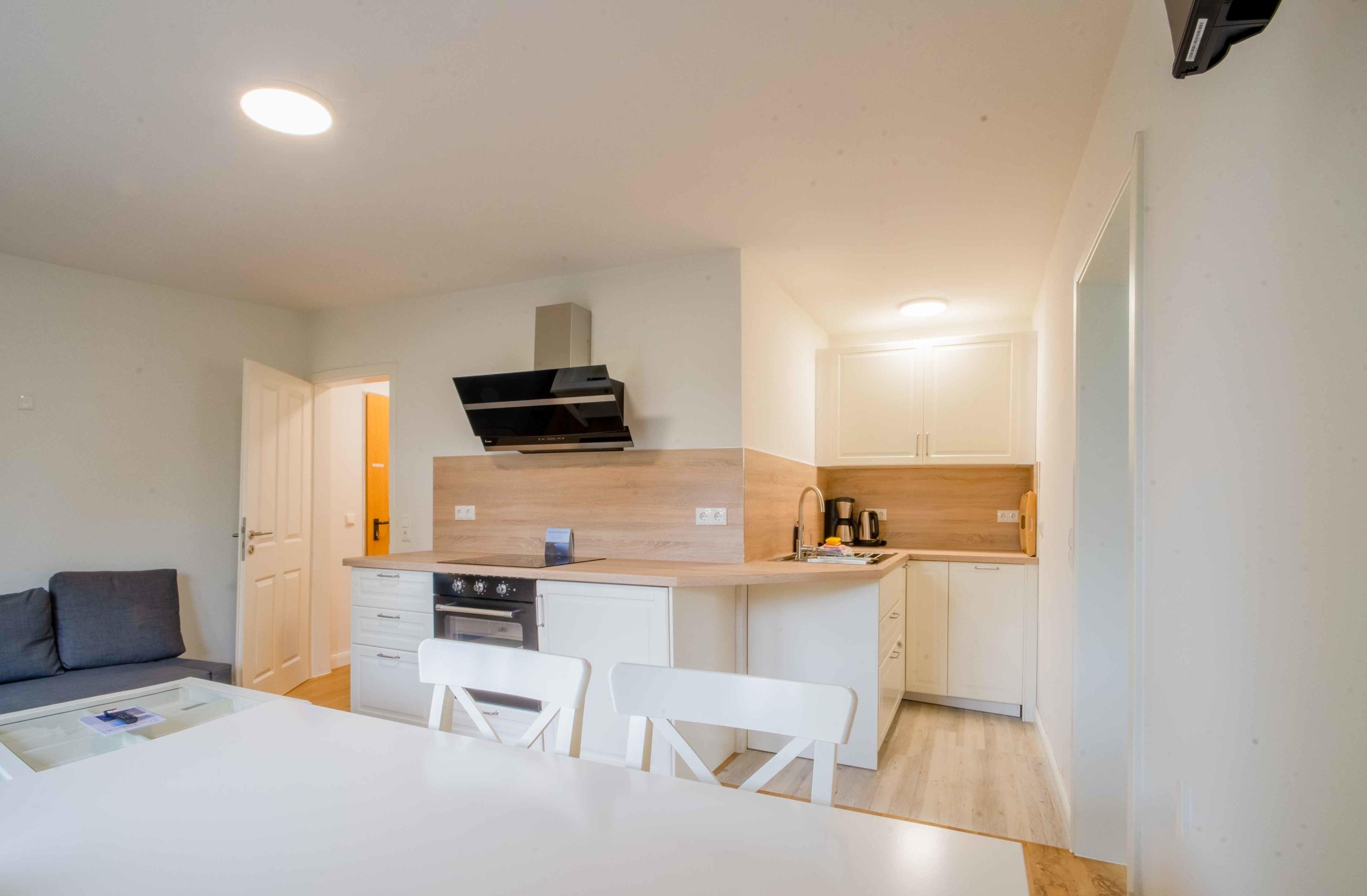 Wohnbereich: 1 Tisch mit 4 Stühlen, 1 Couchtisch, 1 Couch mit Schlaffunktion in der Größe eines französischen Bettes Küche und Haushaltsgegenstände: 1 Küchenzeile mit 4-Plattenherd, Spüle, Backofen, Dunstabzugshaube mit Umluft, Kühlschrank mit Gefrierfach, Kaffeemaschine, Wasserkocher, Toaster, Kochtöpfe und Bratpfanne, Besteck und Gläser für 4 Personen