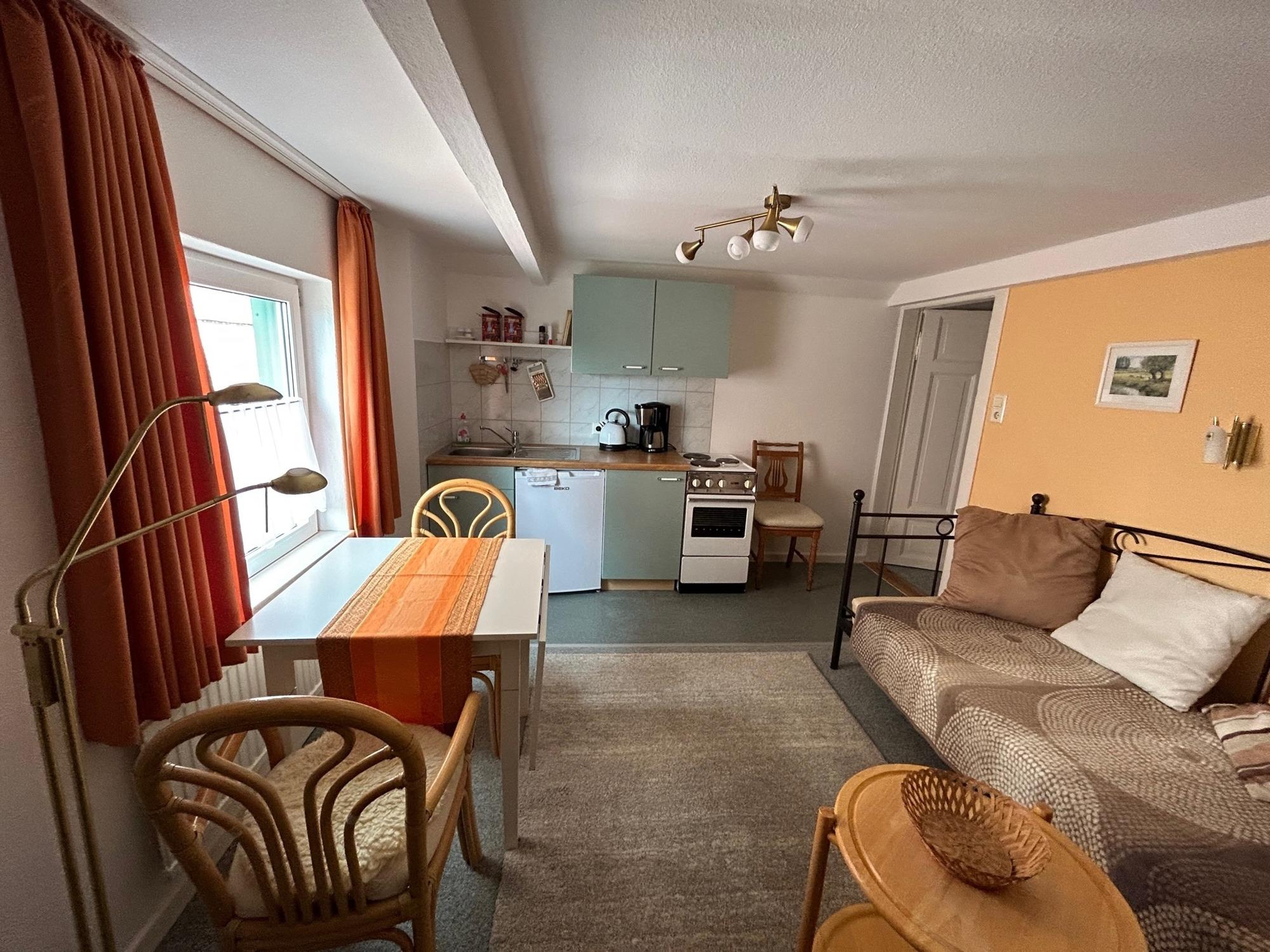 Ein seperates Schlafzimmer mit einem kleinen Duschbad und ein Wohnzimmer mit kleiner Küchenzeile.