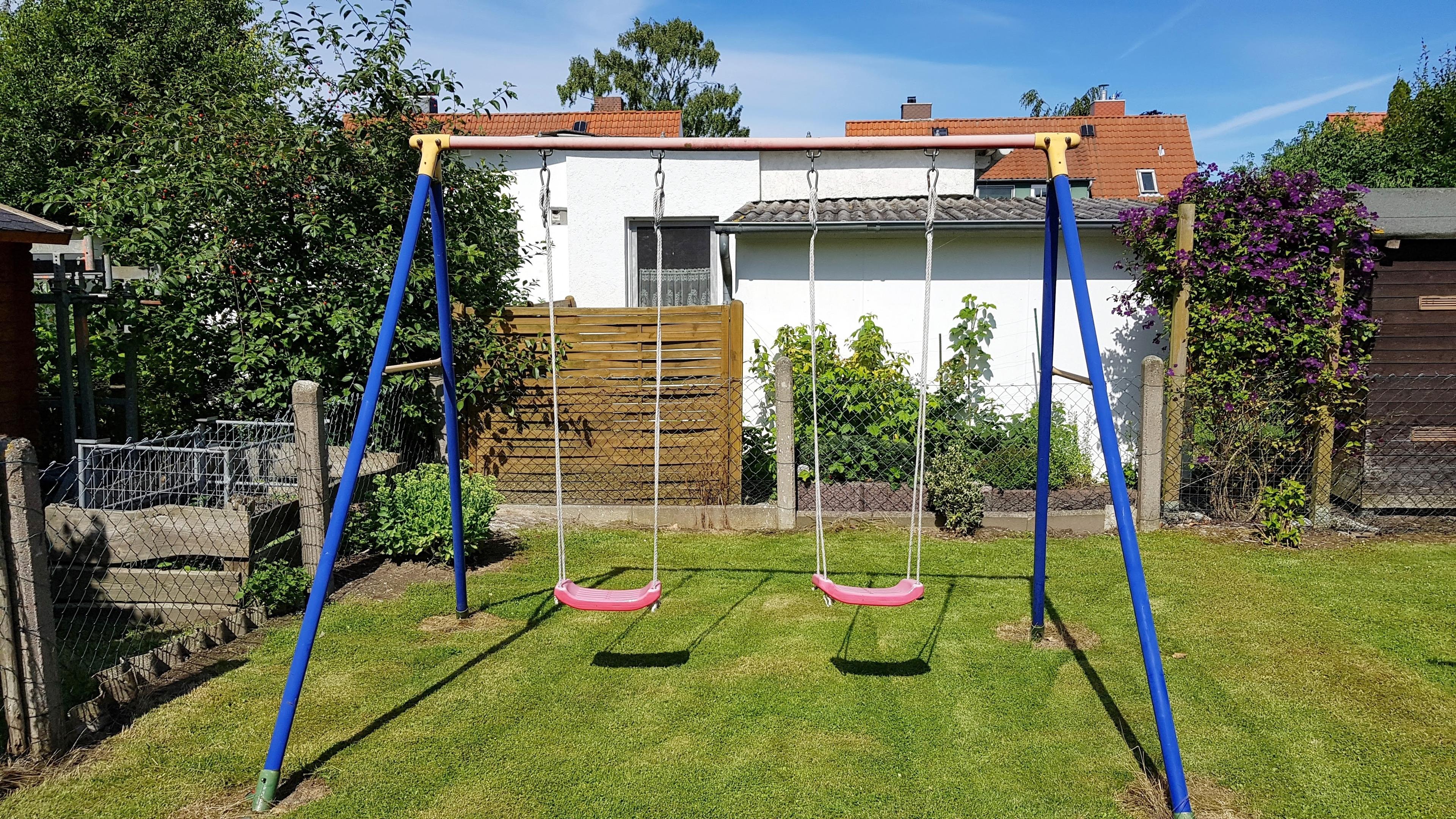 - Gartenmöbel und Spielbereich mit Schaukel und Trampolin im Garten