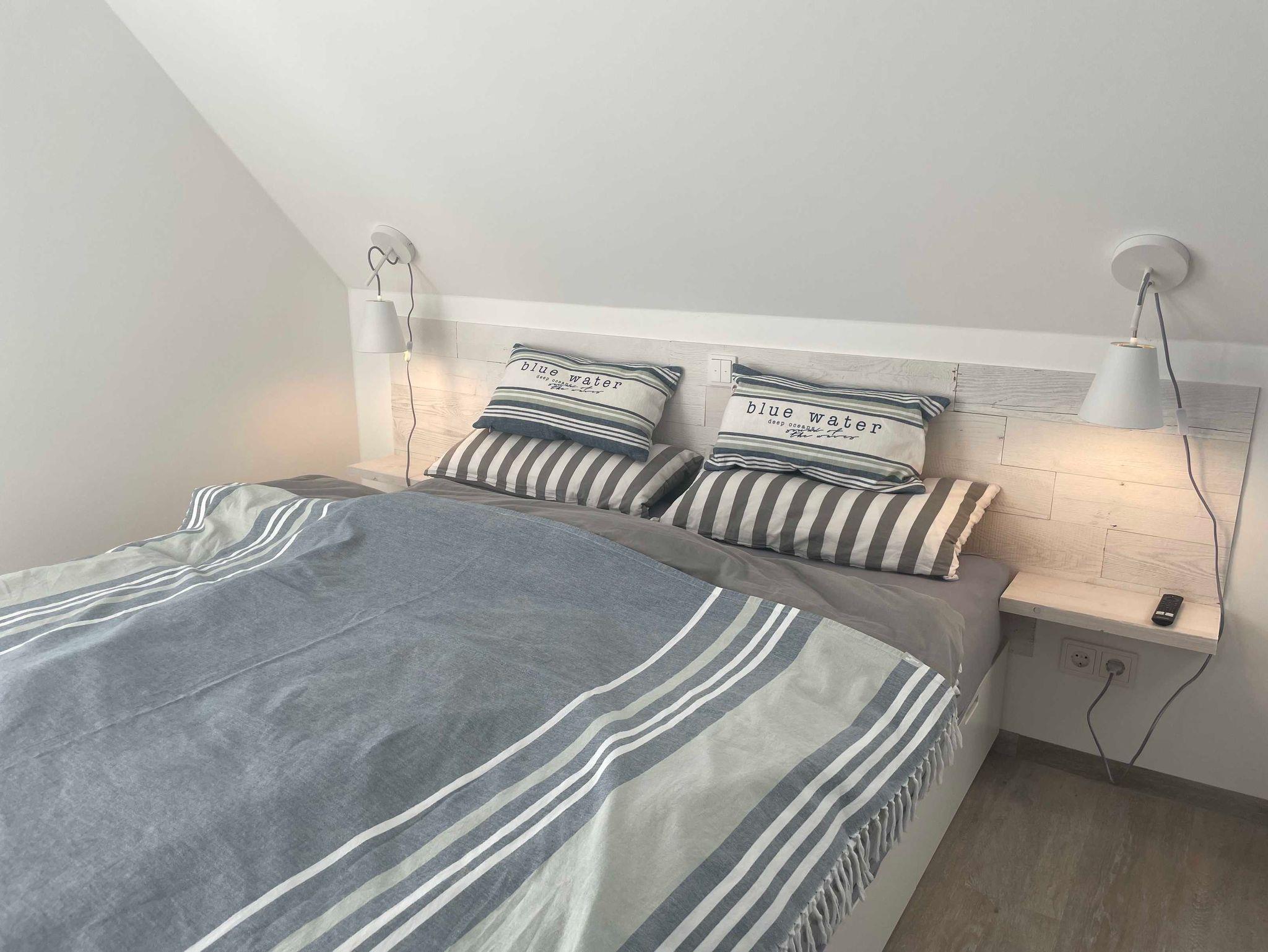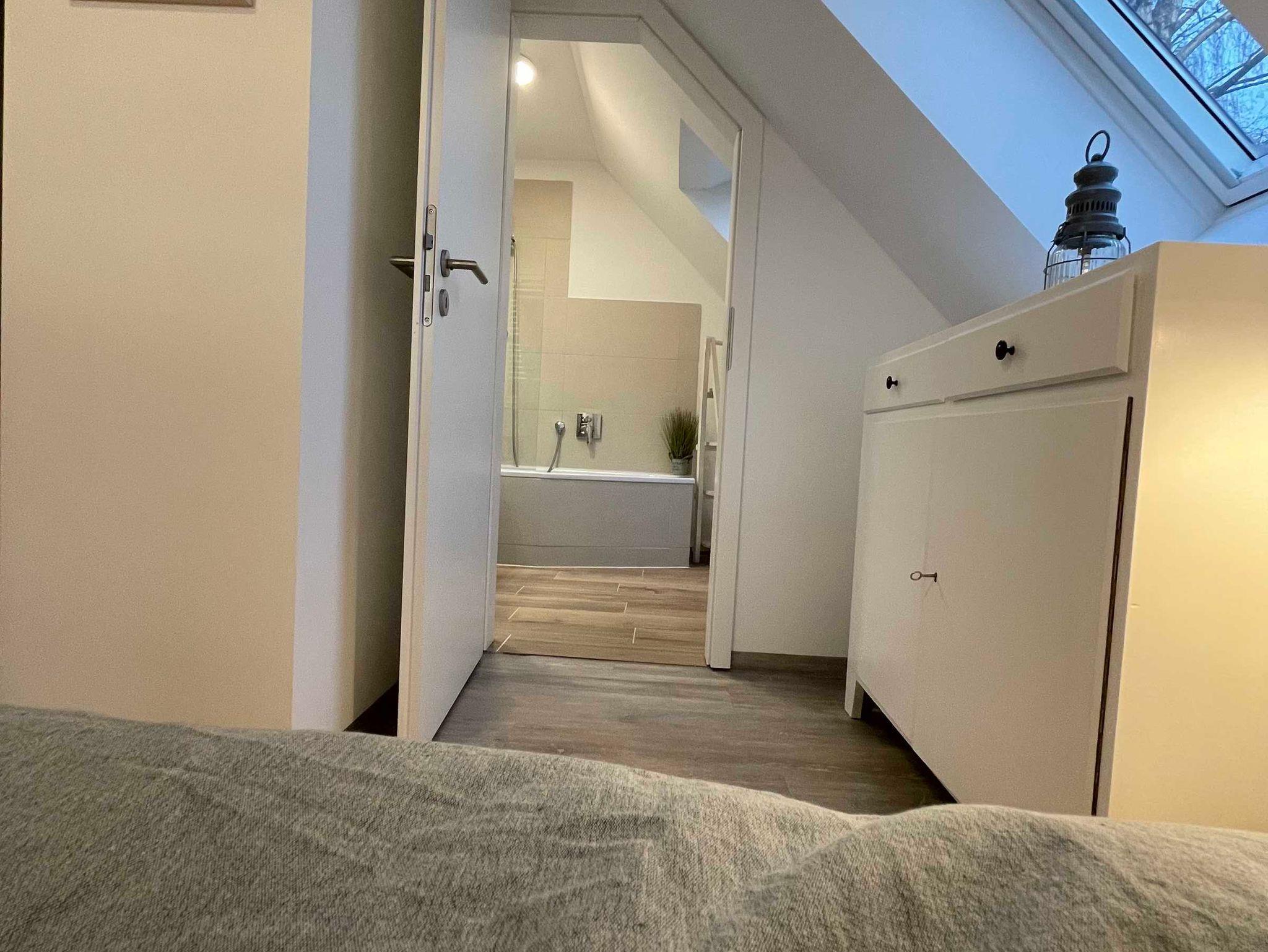 Das Tage am Meer verfügt über 3 Schlafzimmer und 3 Bäder. Von den beiden Schlafzimmern im Obergeschoss (mit jeweils Bad en Suite) aus direkter Zugang zur großen, möblierten Dachterrasse mit Blick zur Ostsee.