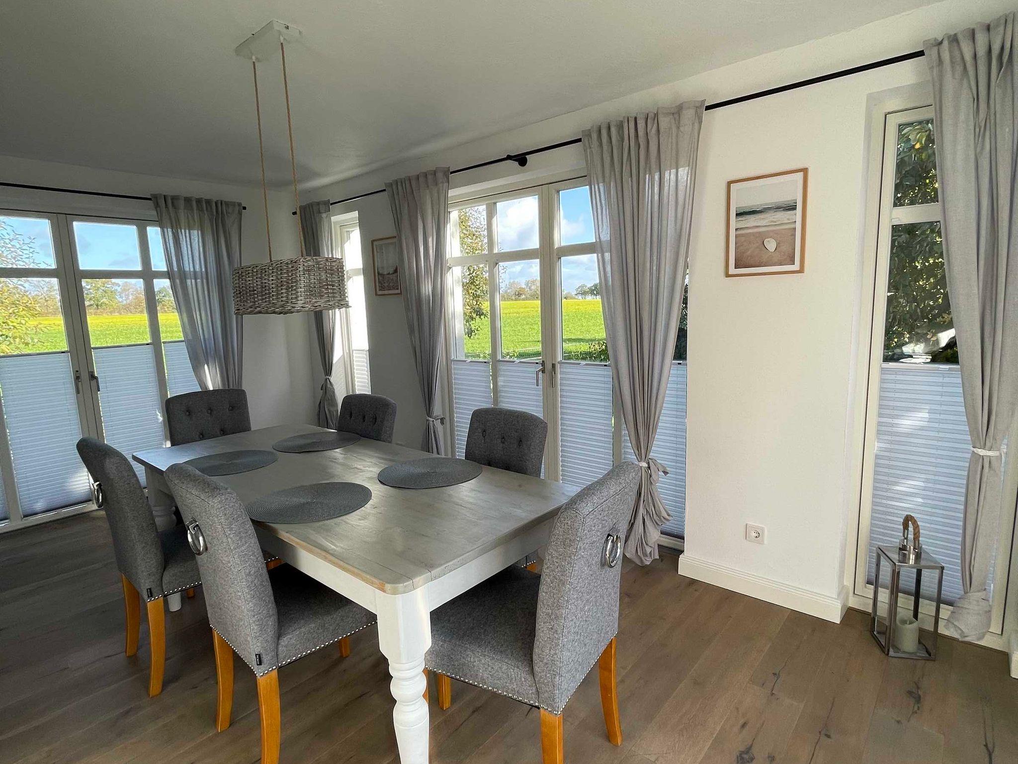 Gleich nach Betreten nimmt man den Charme dieses Ferienhauses wahr. Auf rund 95 qm betritt man den freundlichen, offenen Wohnbereich, in den die komplett mit vielen modernen Geräten und Zubehör ausgestattete Küche integriert ist. Optisch getrennt, im neuen Wintergarten-Anbau mit großen Fensterfronten, befindet sich der große Esstisch für 6 Personen. Zubereitete Speisen können hier genossen werden und bei geselligem Beisammensein oder Spielen sitzt man auf den bequemen Stühlen gerne lange Zeit zusammen. Mit einem Kaffee lässt sich der Morgen auf dem vorgelagerten umlaufenden Steg gut beginnen oder der Urlaubstag dort mit einem leckeren Getränk ausklingen.