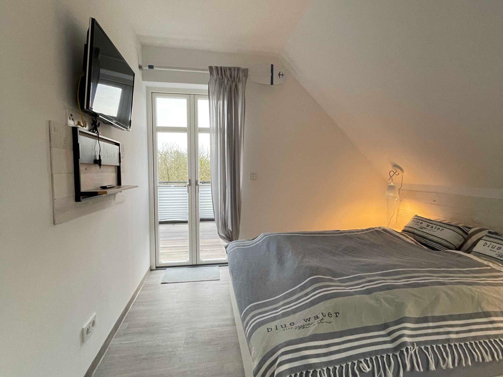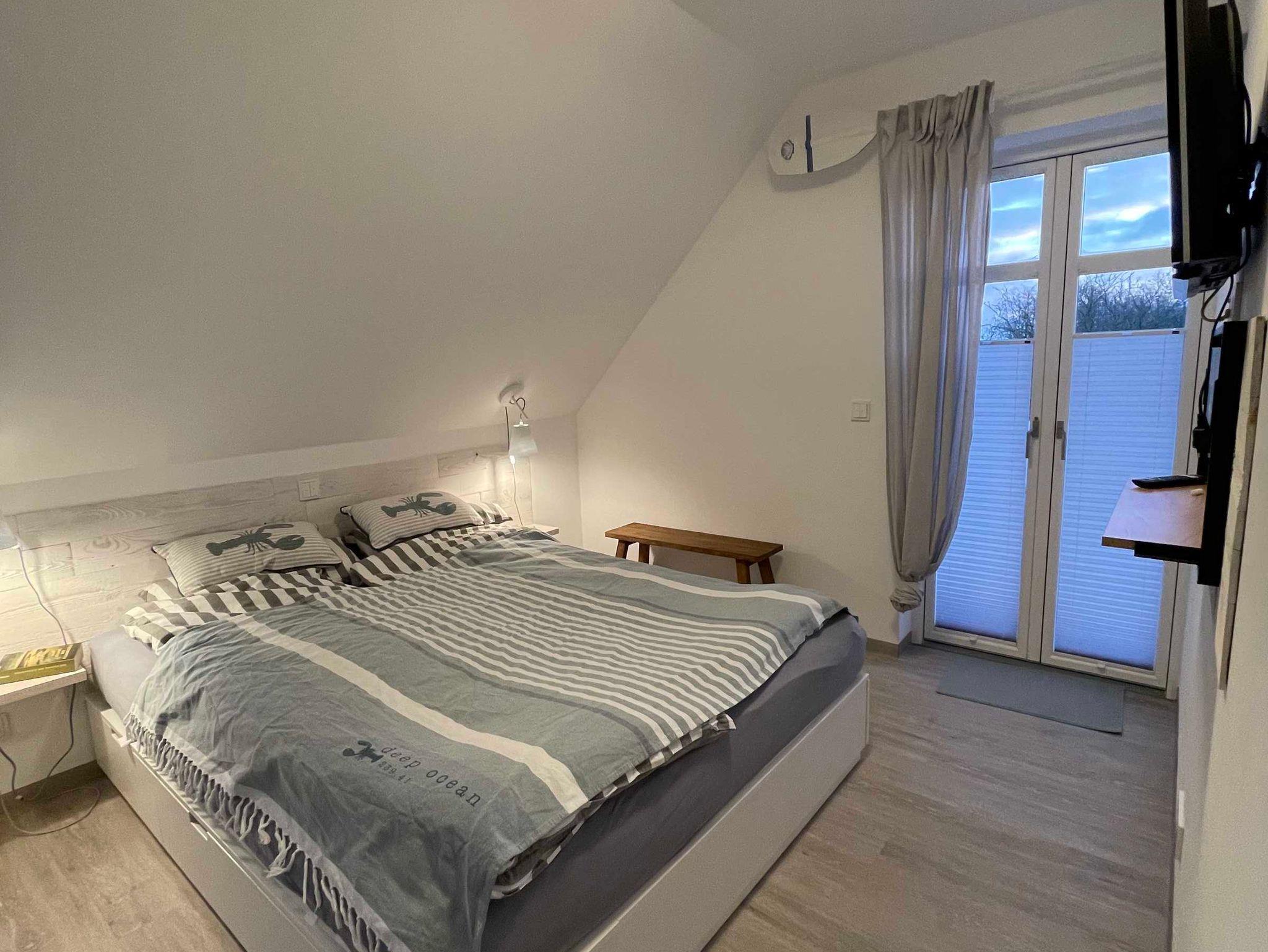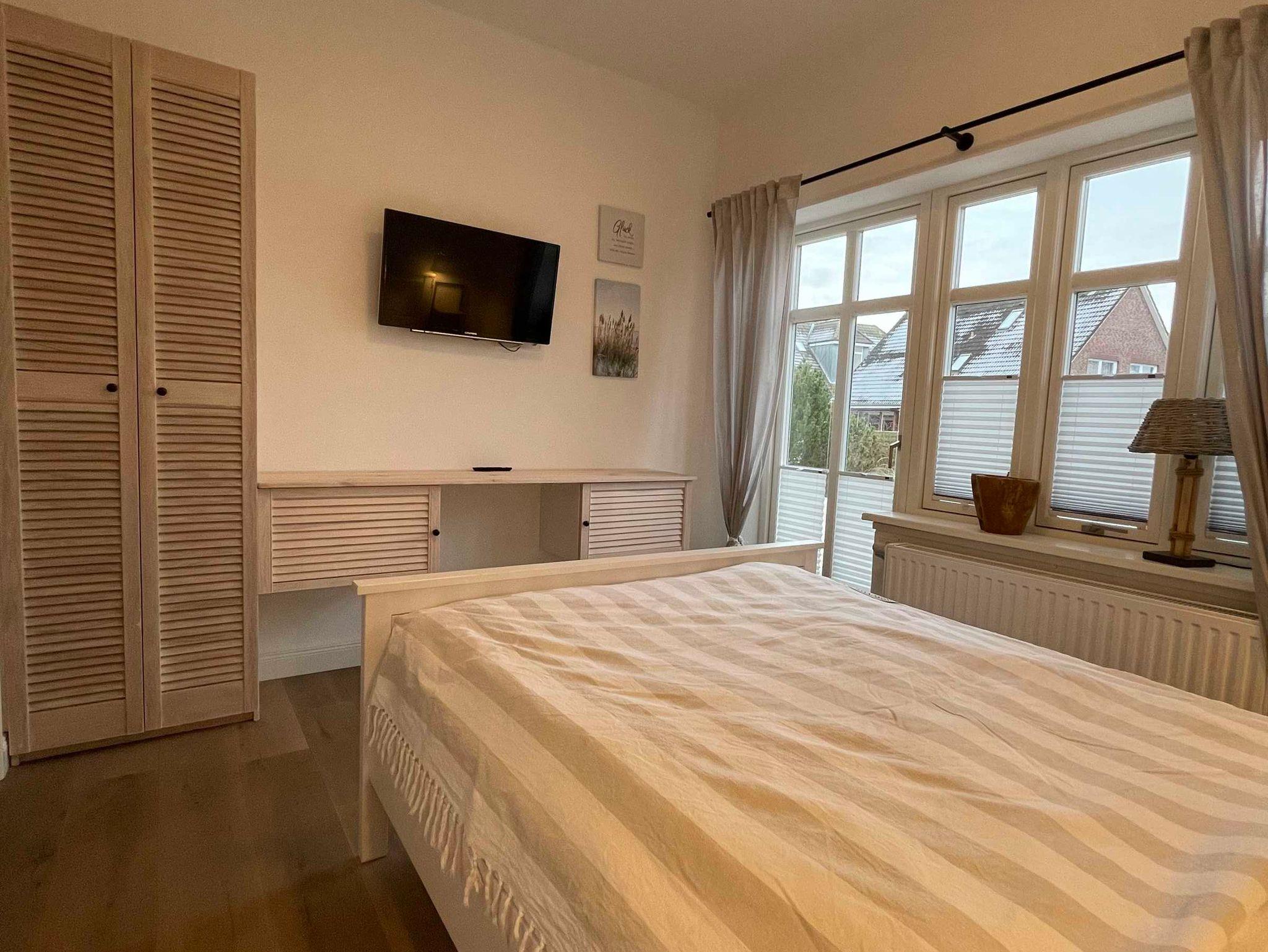 Ebenfalls im Erdgeschoss gibt es ein Schlafzimmer mit Doppelbett (1,40 m x 2,00 m), internetfähigem Fernseher, kleinem Schrank und Schreibtisch.