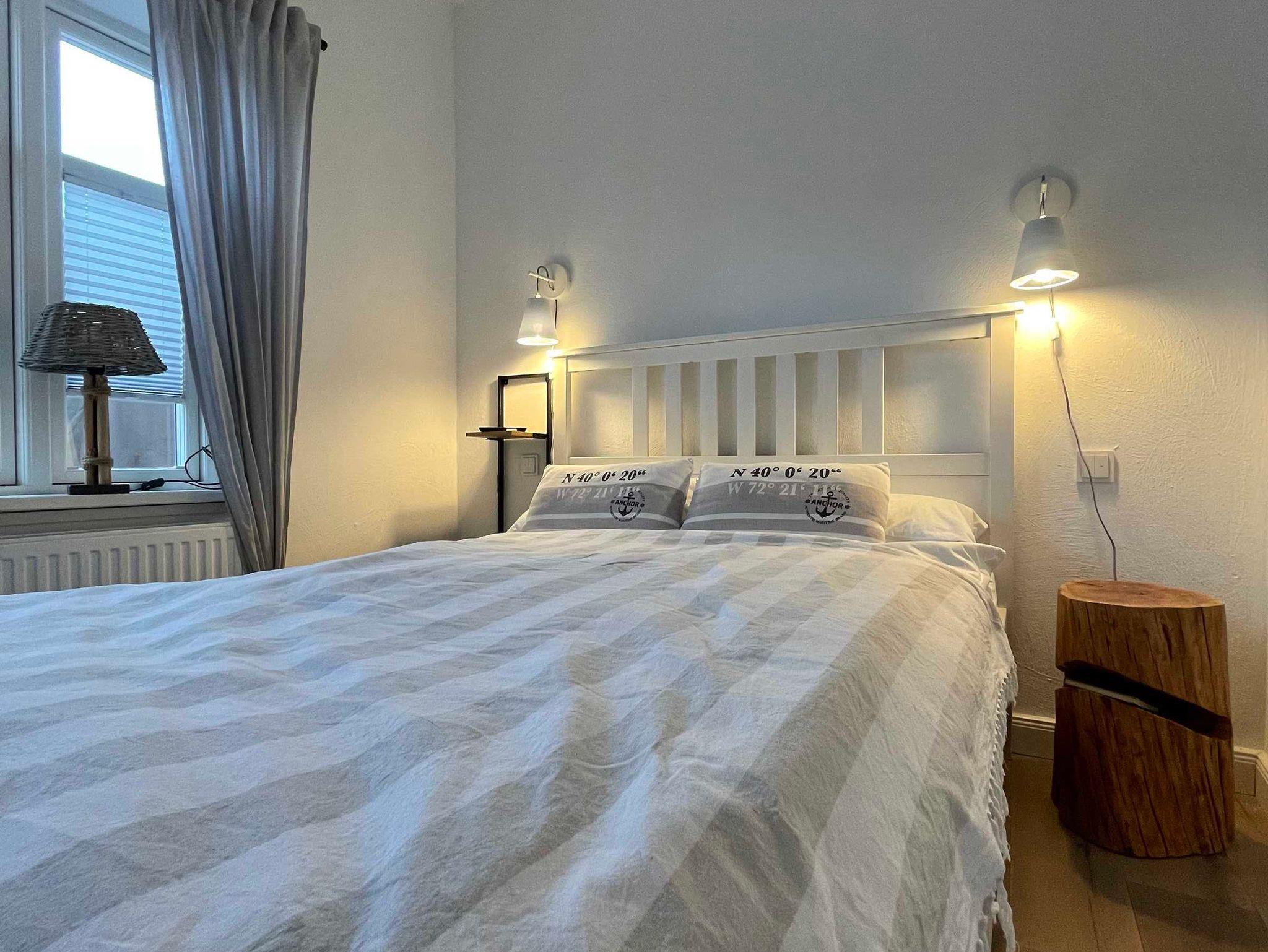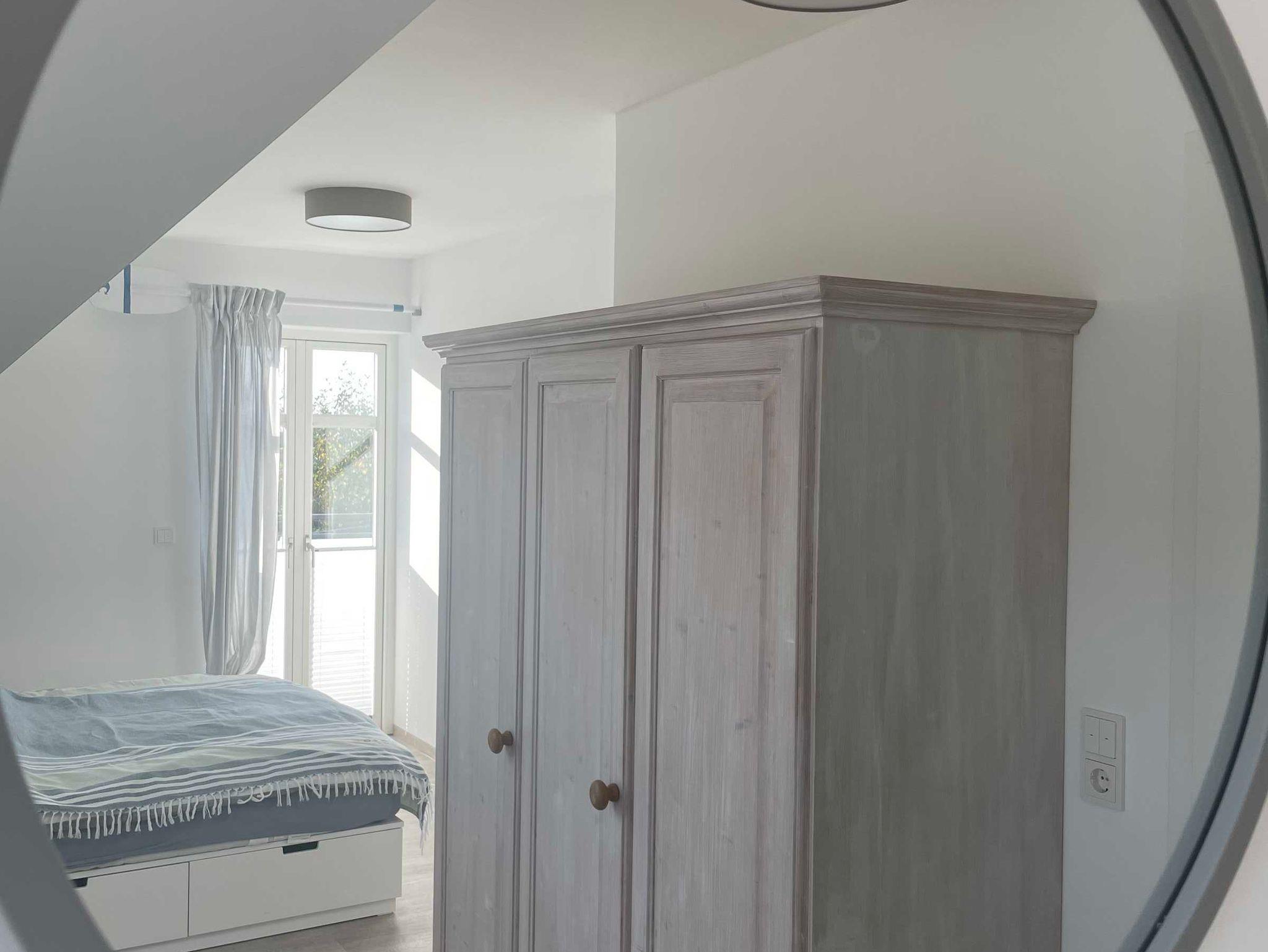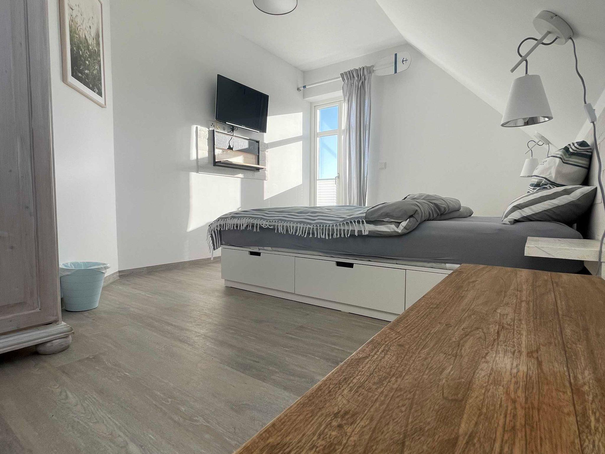 Ebenfalls im Erdgeschoss gibt es ein Schlafzimmer mit Doppelbett (1,40 m x 2,00 m), internetfähigem Fernseher, kleinem Schrank und Schreibtisch.