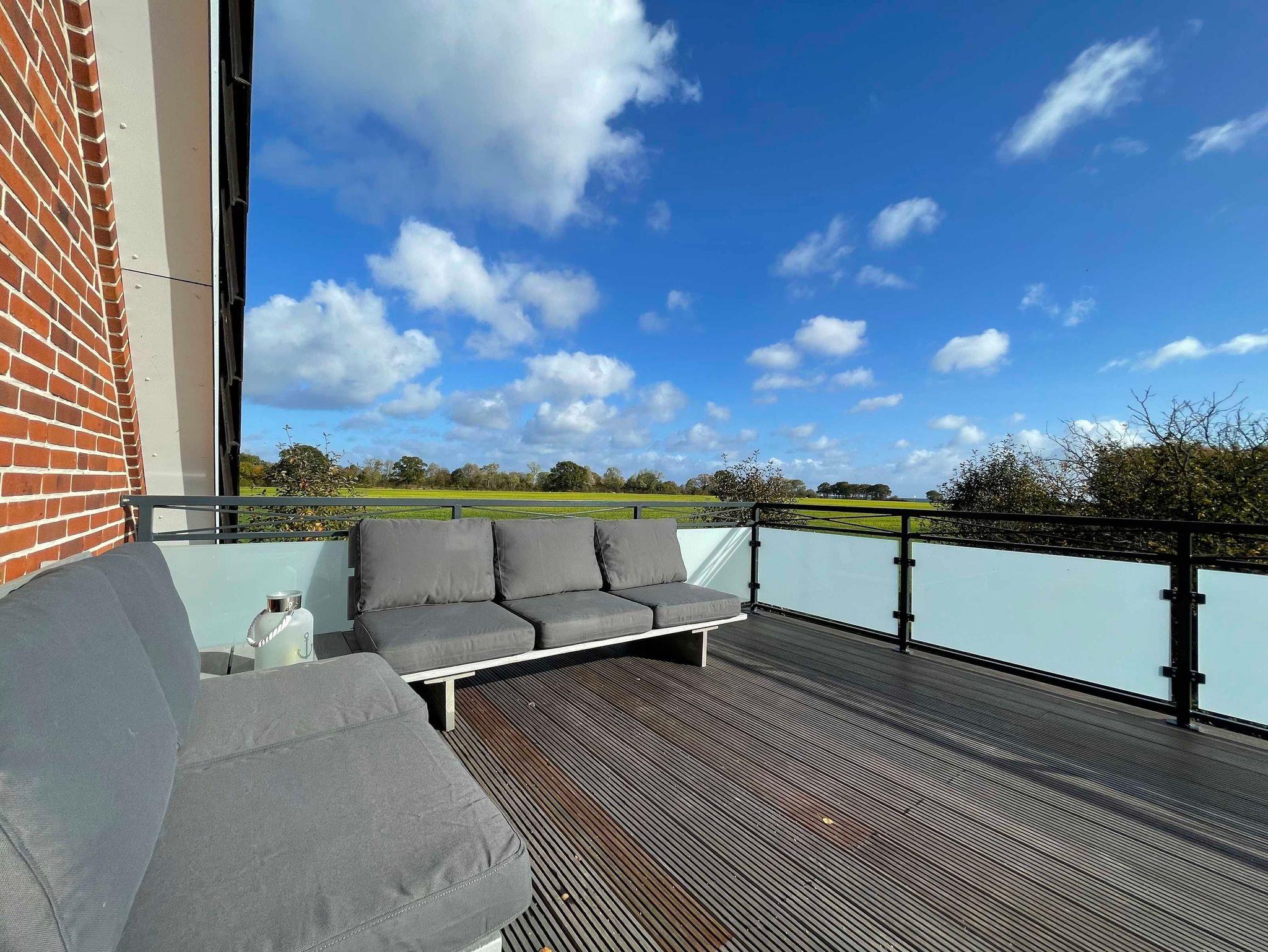 Das Obergeschoss ist ein wahres Raumwunder. Hier finden sich 2 geräumige Schlafzimmer unterm Dach. Beide haben einen Zugang zur großen, außergewöhnlichen Dachterrasse, die mit modernen Loungemöbeln ausgestattet ist. Der weite Ausblick über die Felder bis zur Ostsee hin ? traumhaft! Der Duft des Meeres ist spürbar…