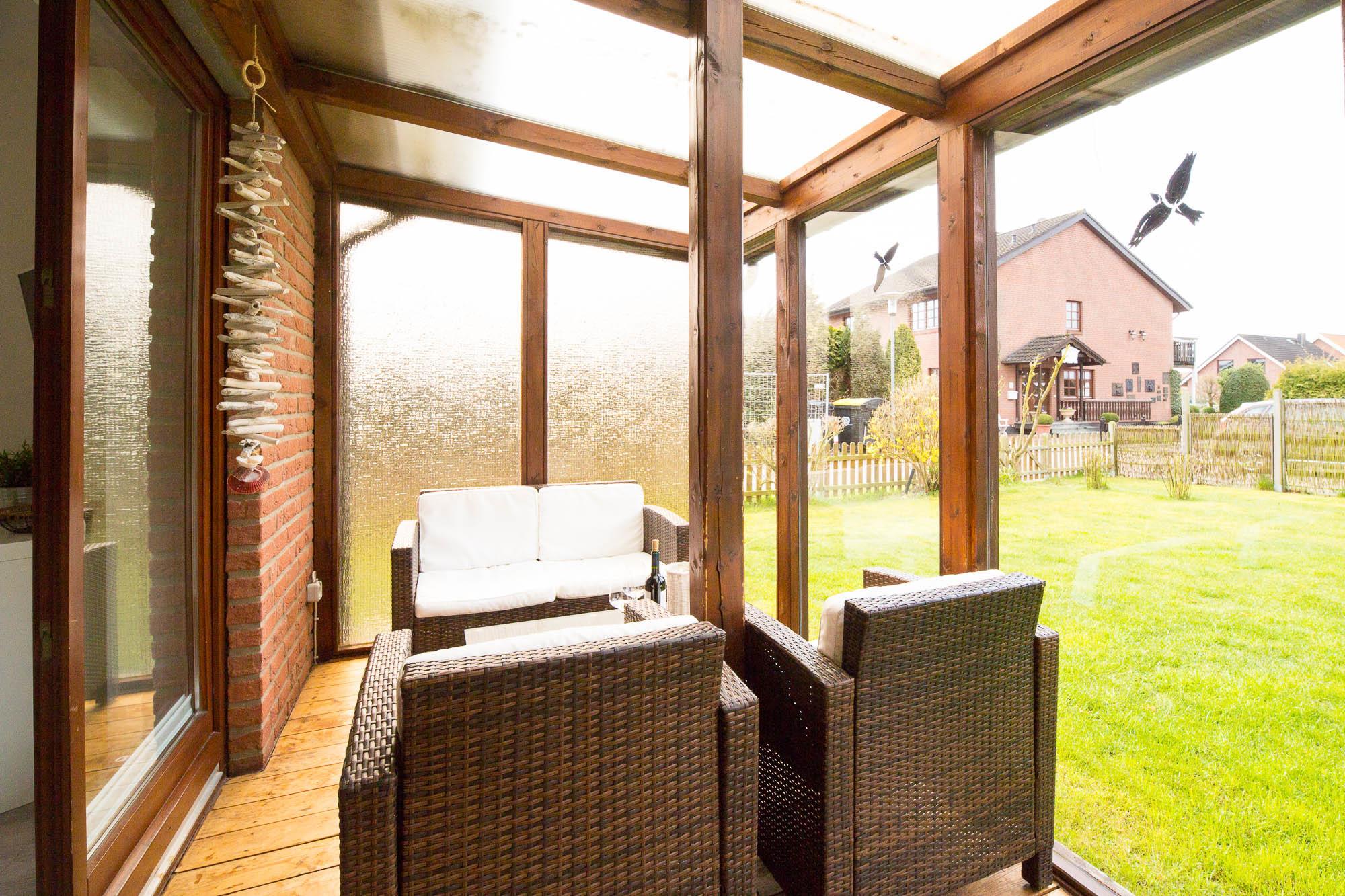 Die überdachte Terrasse ist vom Wohnzimmer aus zugänglich und führt direkt auf die Rasenfläche.