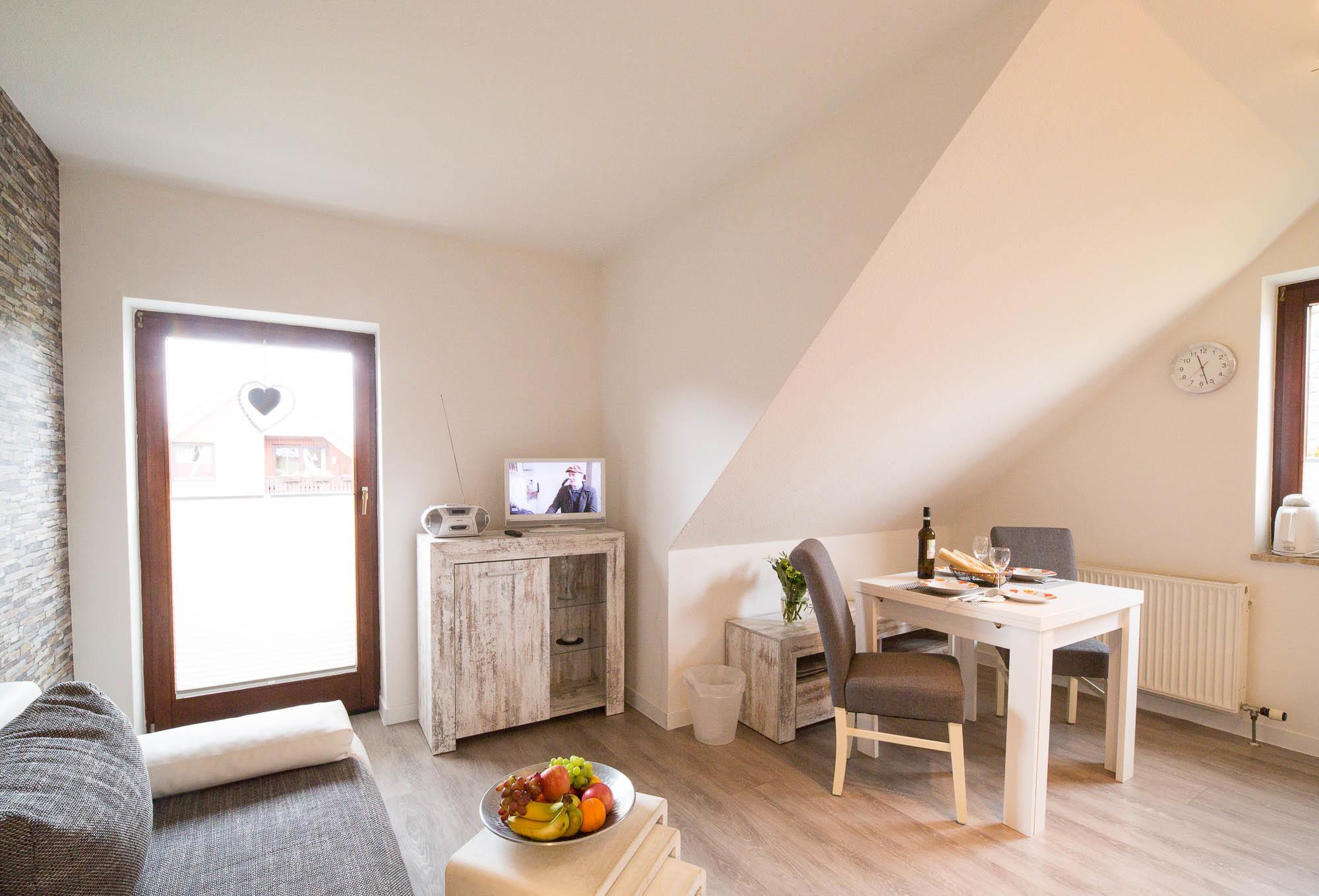 Das Wohnzimmer der Fewo ist mit Couch und Küchenzeile (mit Geschirrspülmaschine) und Essbereich ausgestattet.